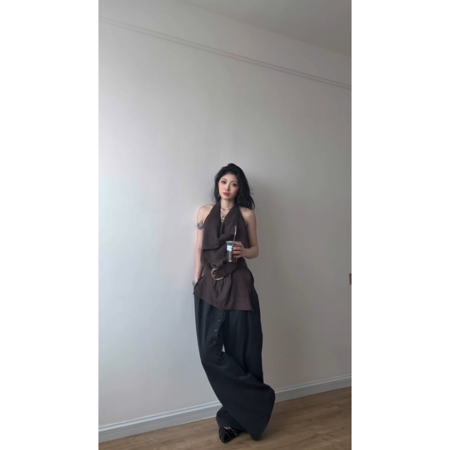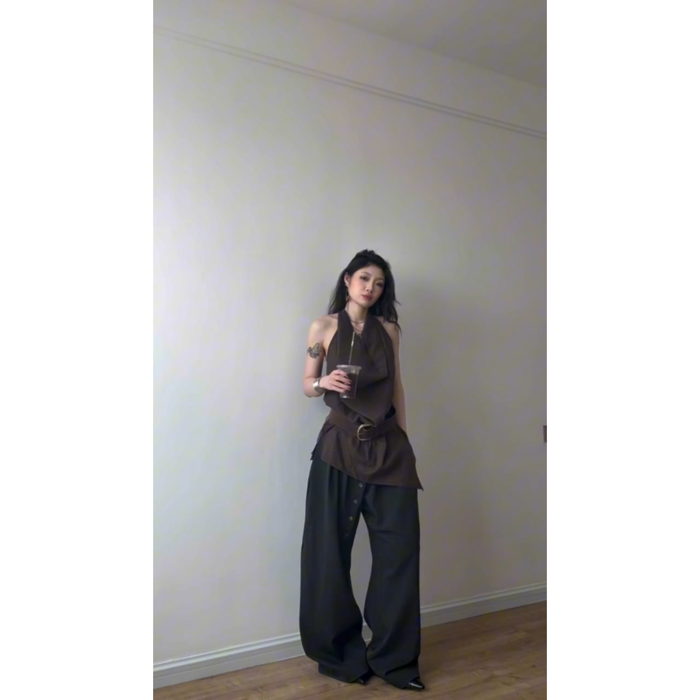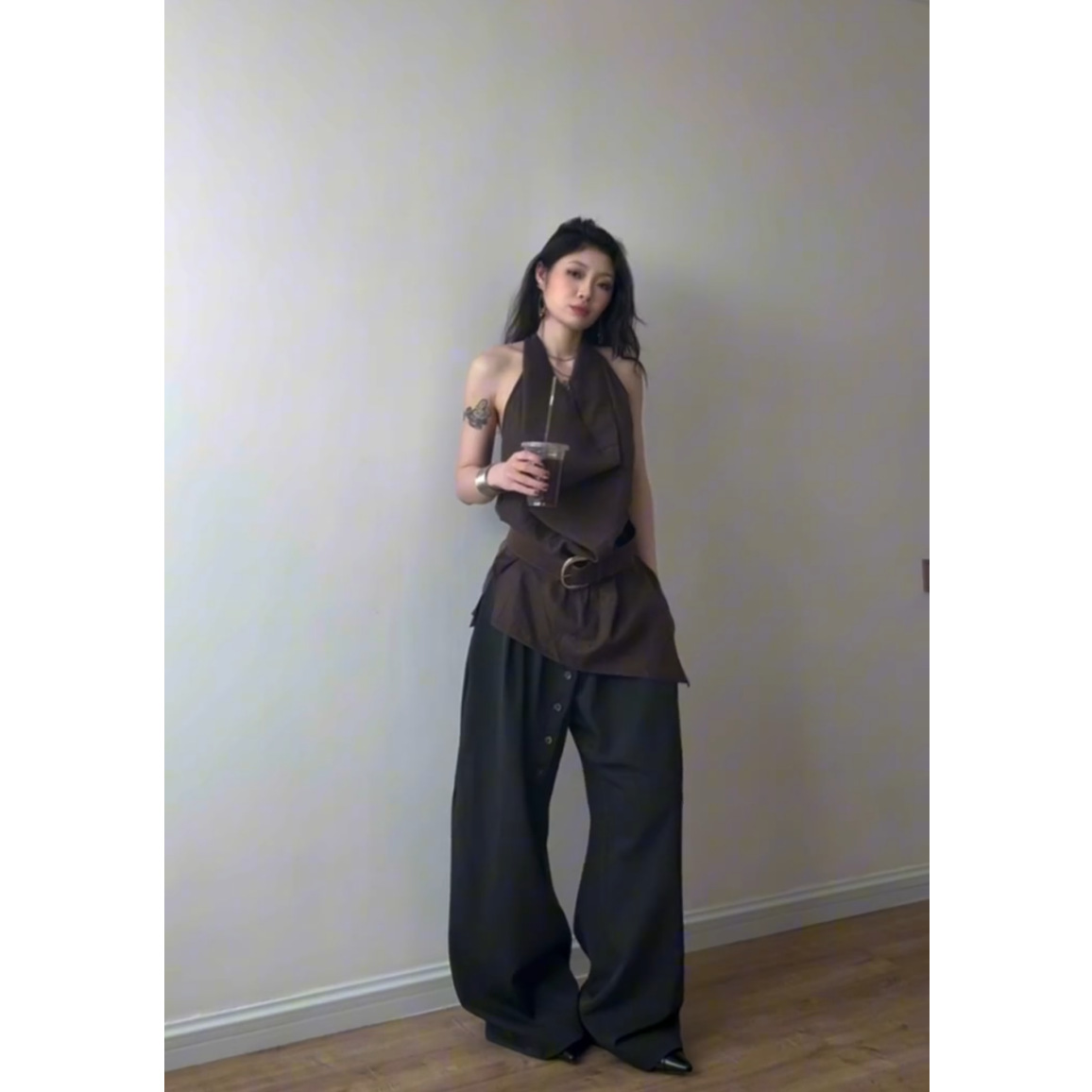 유행 우아한 스윙 넥 조끼 최고 유행 이완 느슨한 올매치 와이드 레그 캐주얼 바지 여성용 투피스 세트스토어 가기