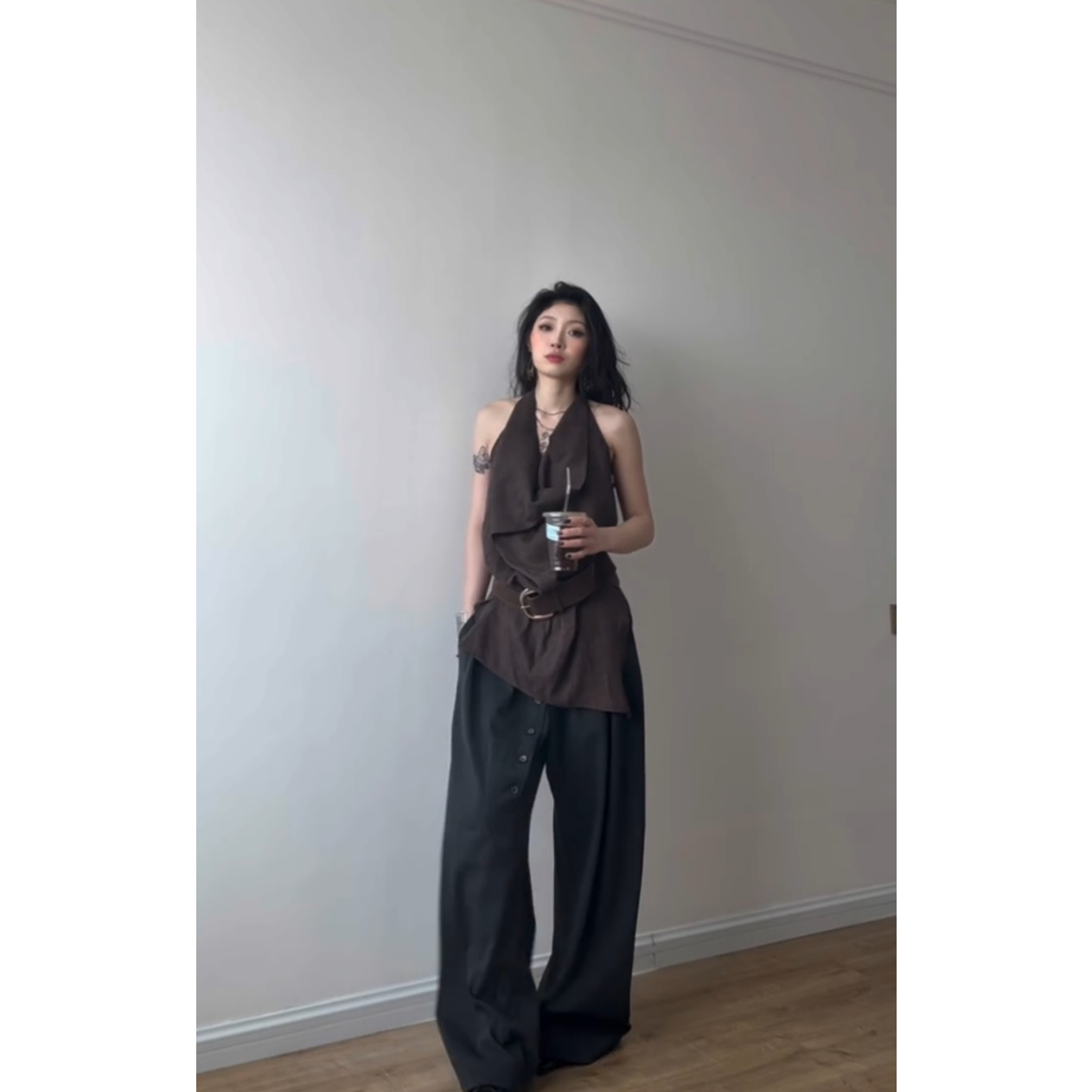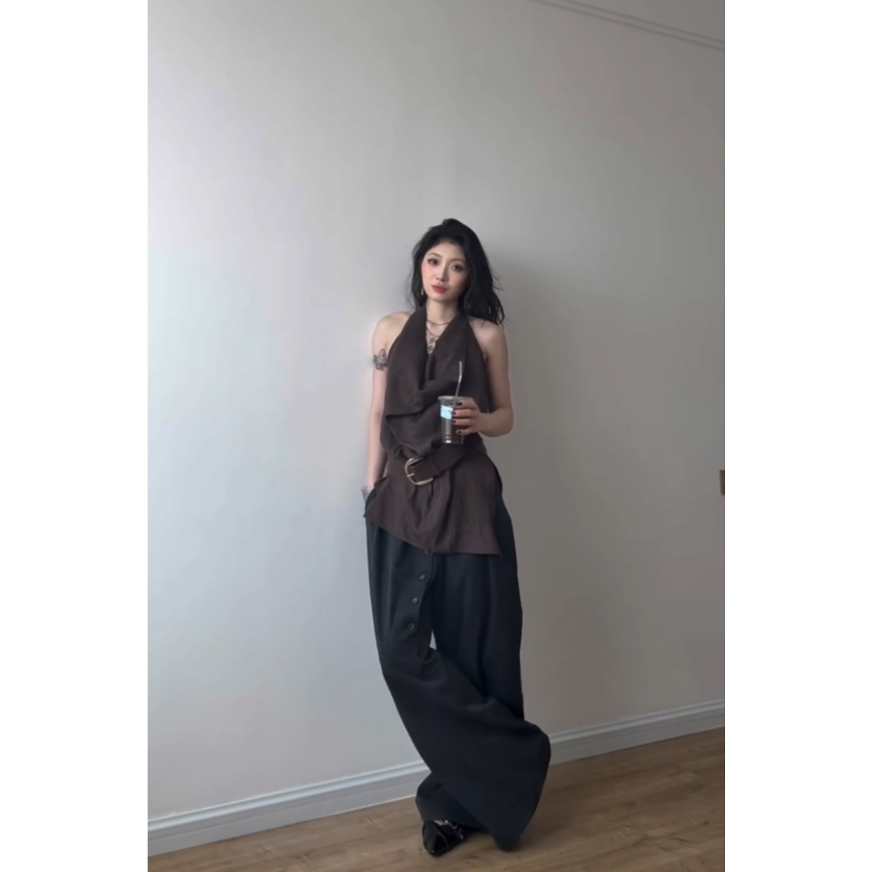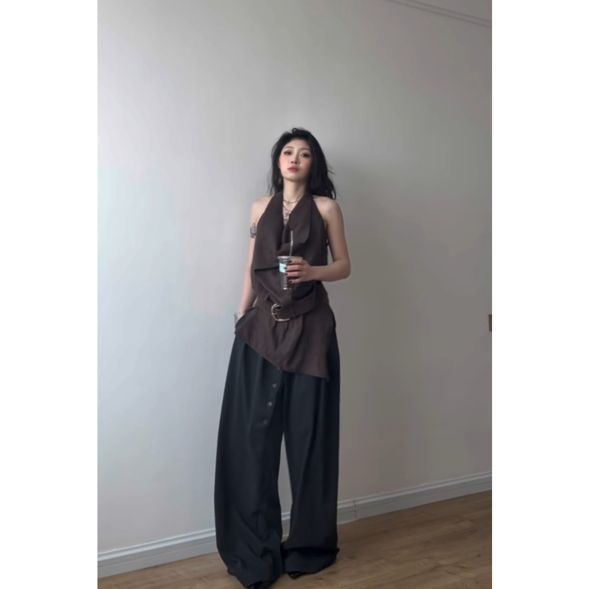 유행 우아한 스윙 넥 조끼 최고 유행 이완 느슨한 올매치 와이드 레그 캐주얼 바지 여성용 투피스 세트스토어 가기