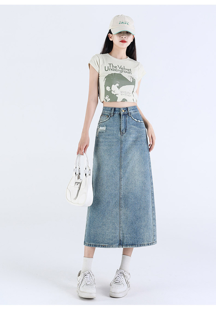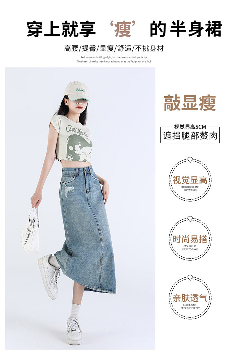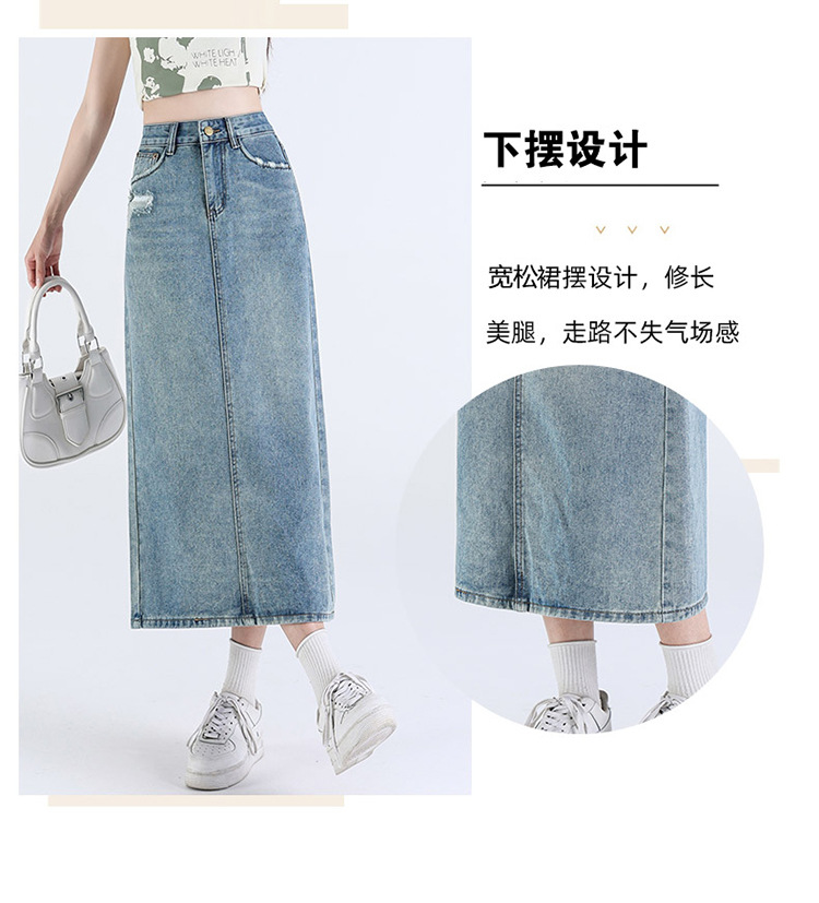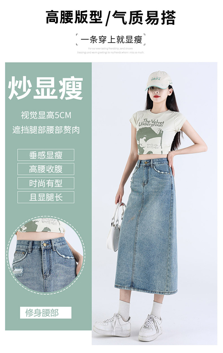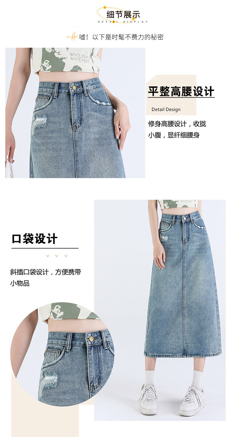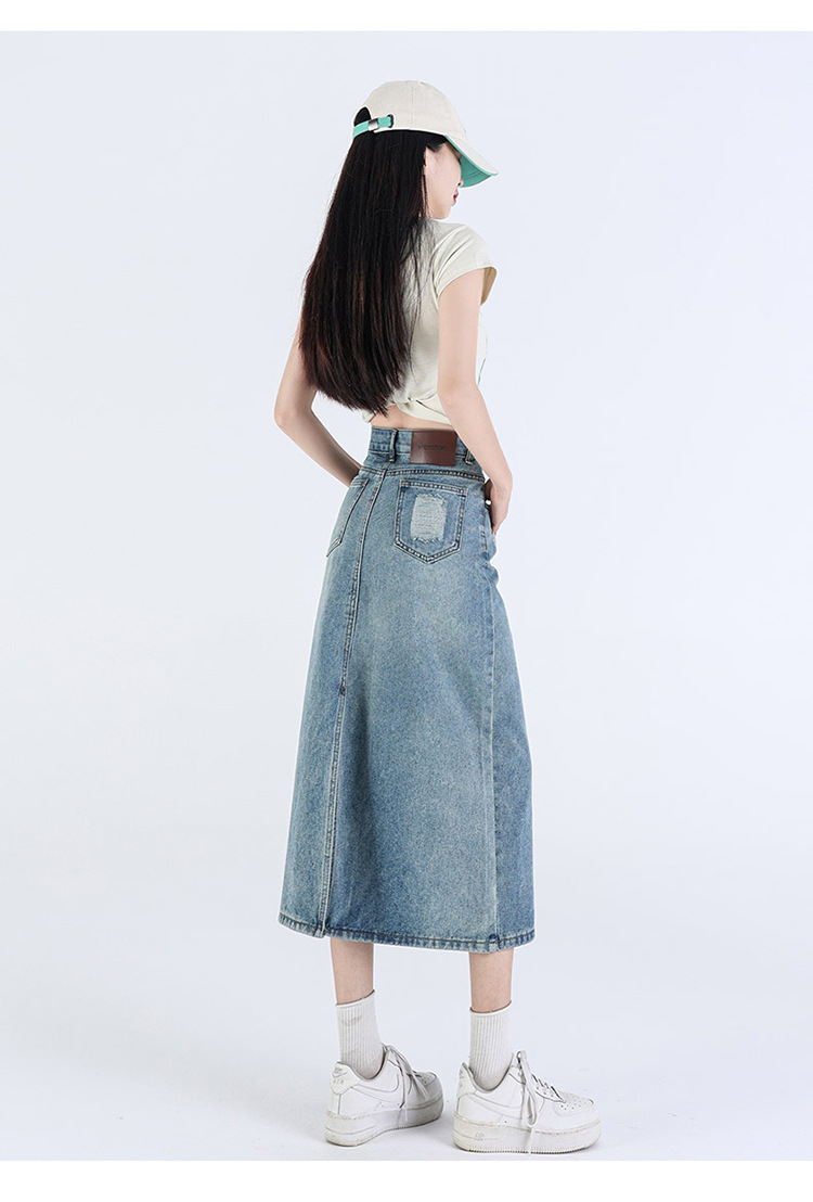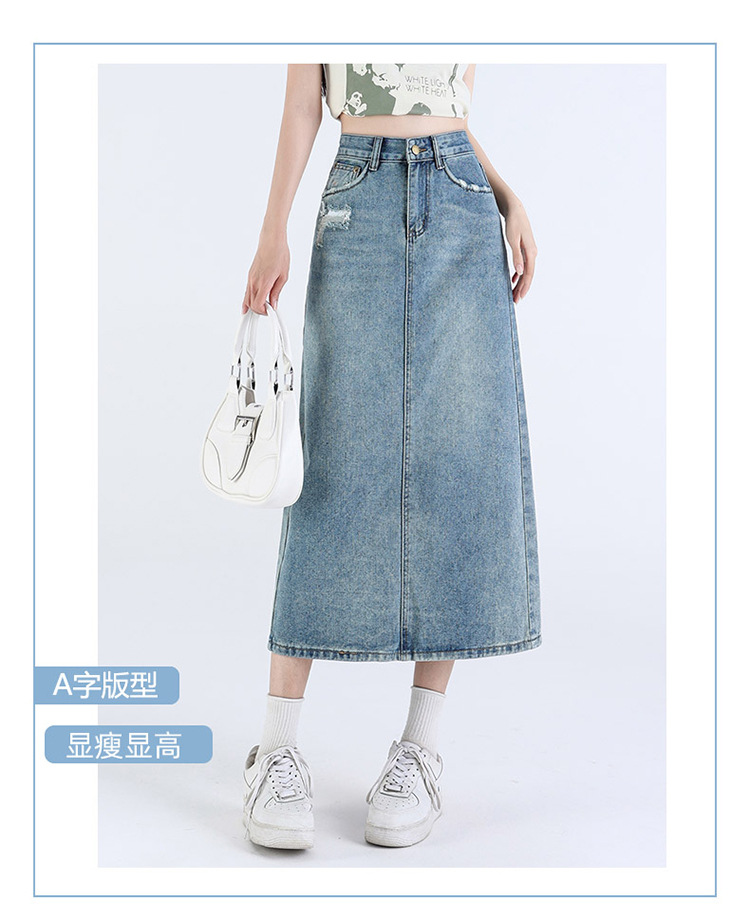 2025 새로운 밝은 색 높은 허리 레트로 찢어진 데님 스커트 여성 디자인 분할 A-라인 미디 스커트스토어 가기