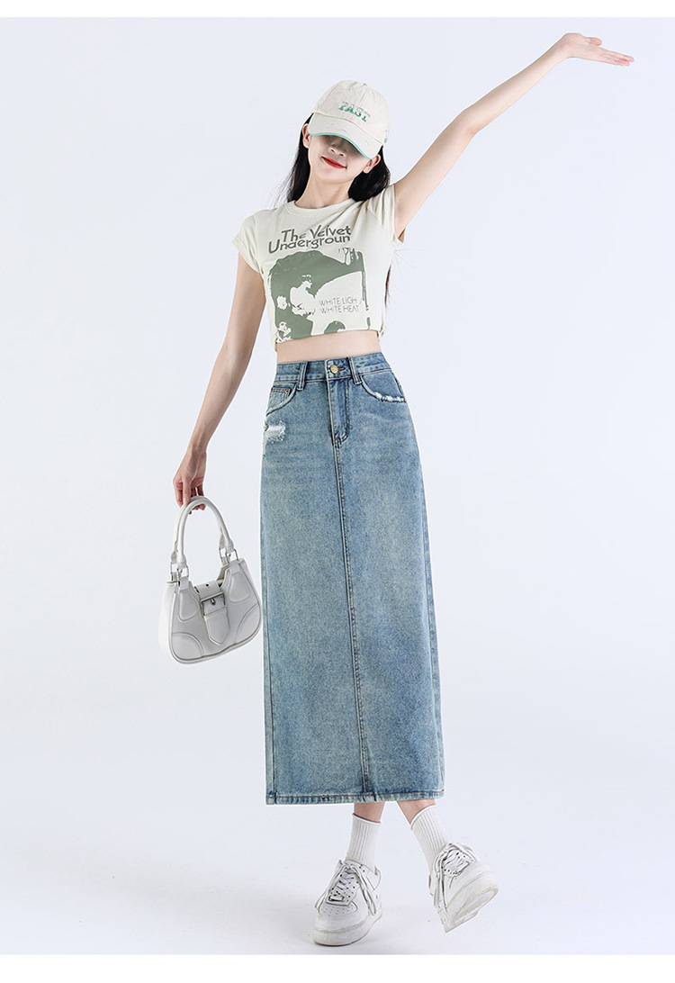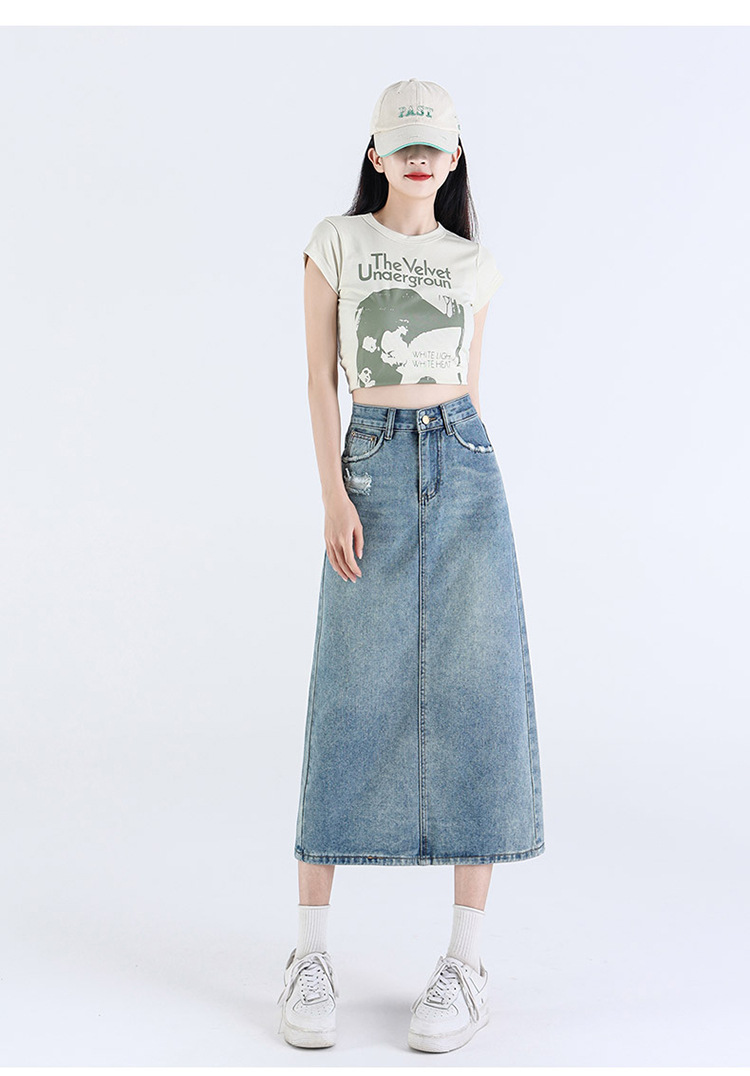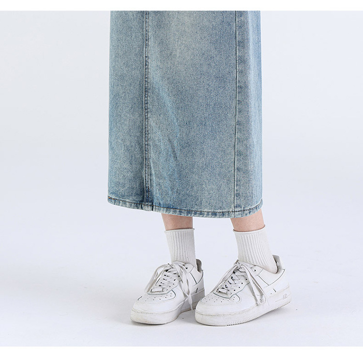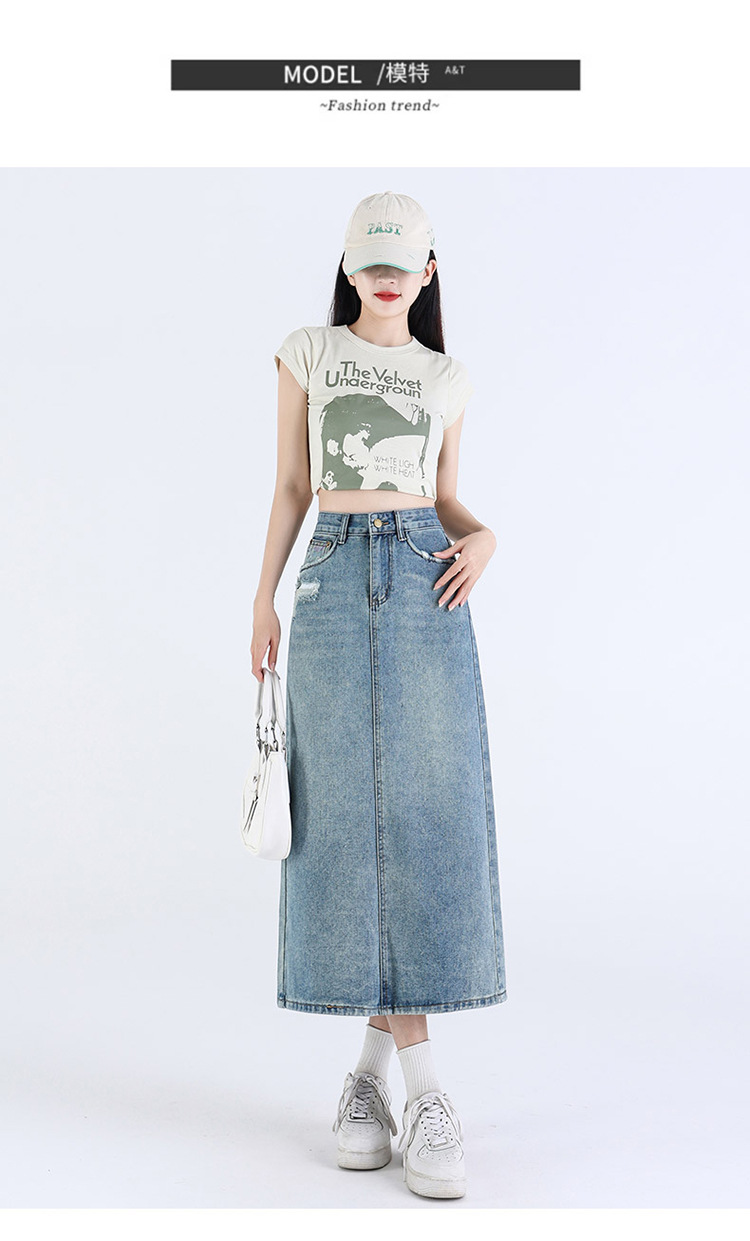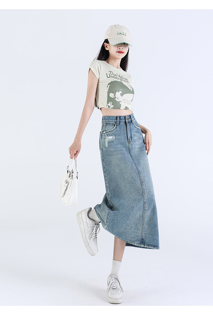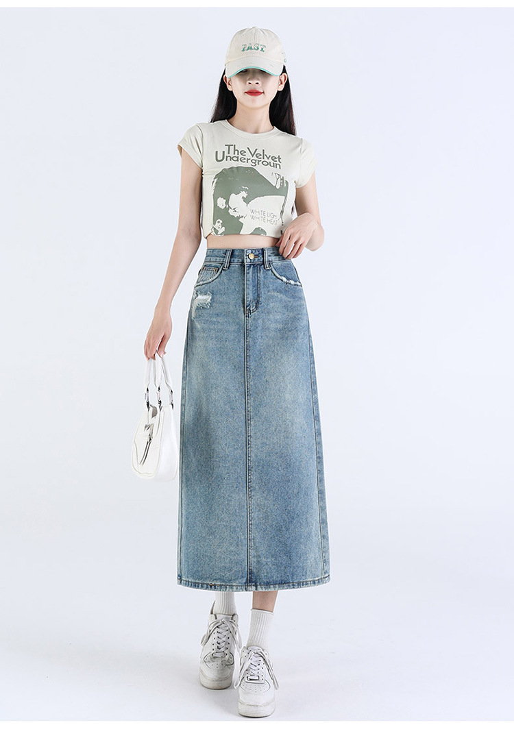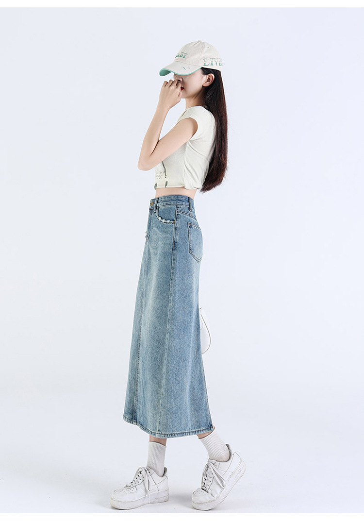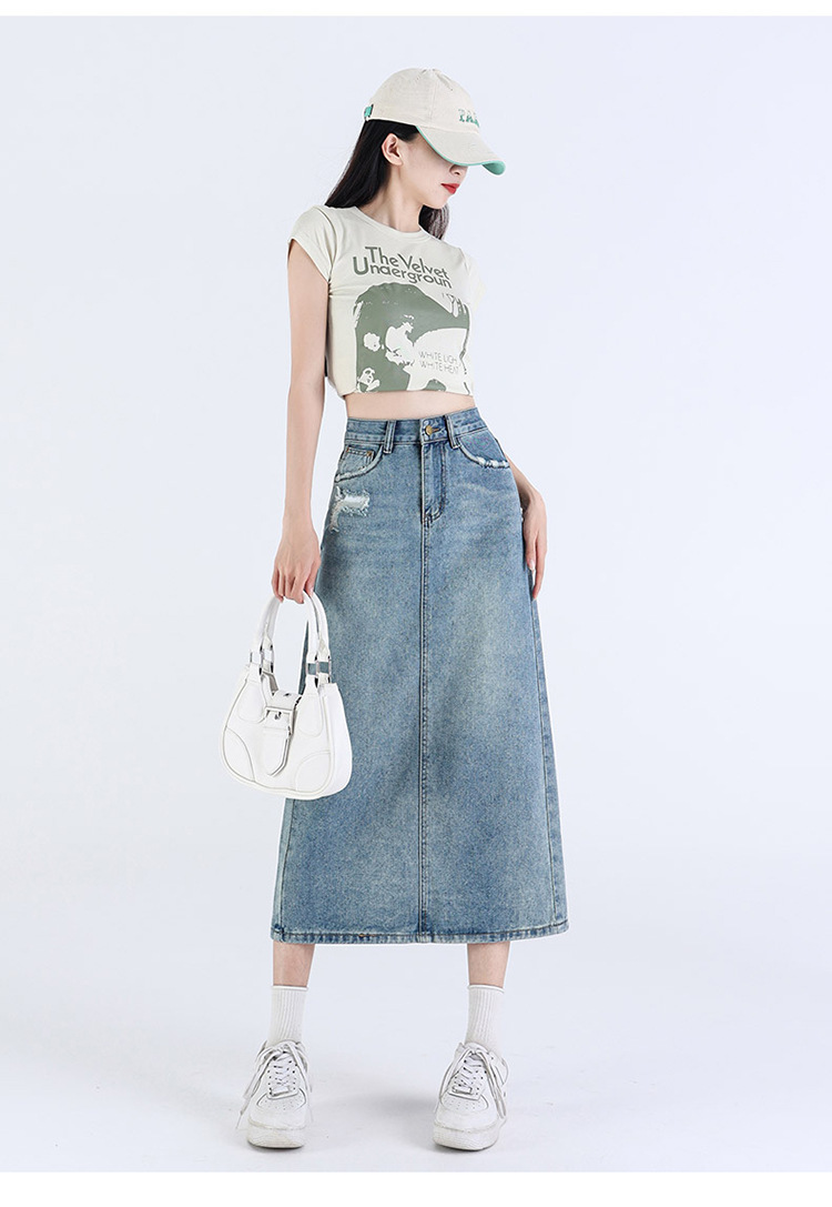 2025 새로운 밝은 색 높은 허리 레트로 찢어진 데님 스커트 여성 디자인 분할 A-라인 미디 스커트스토어 가기