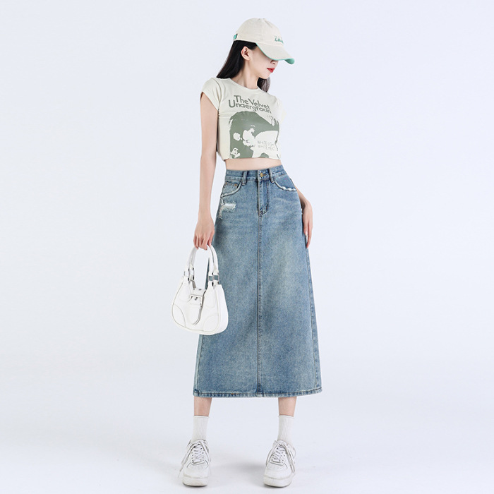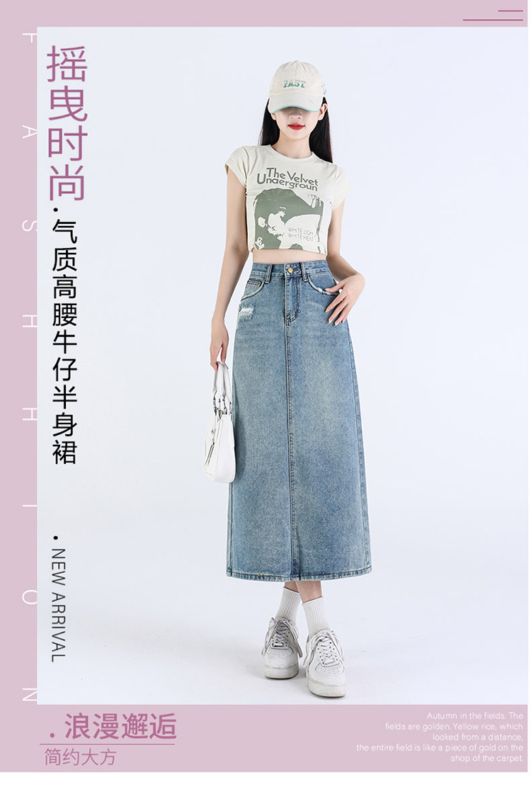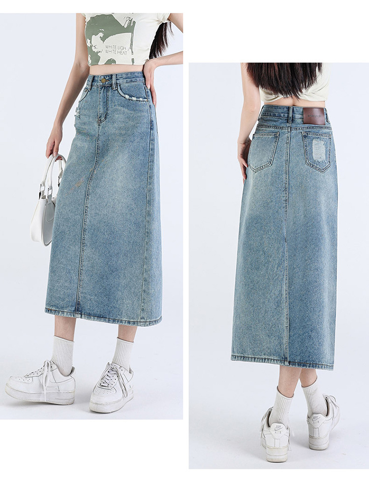 2025 새로운 밝은 색 높은 허리 레트로 찢어진 데님 스커트 여성 디자인 분할 A-라인 미디 스커트