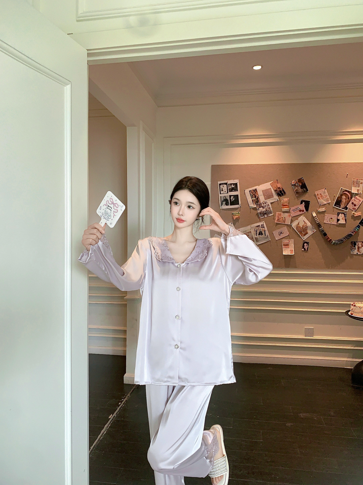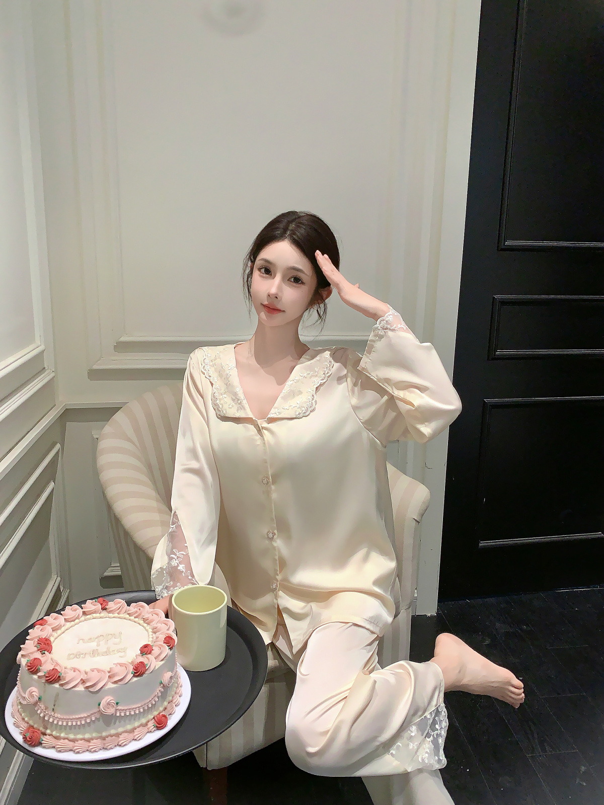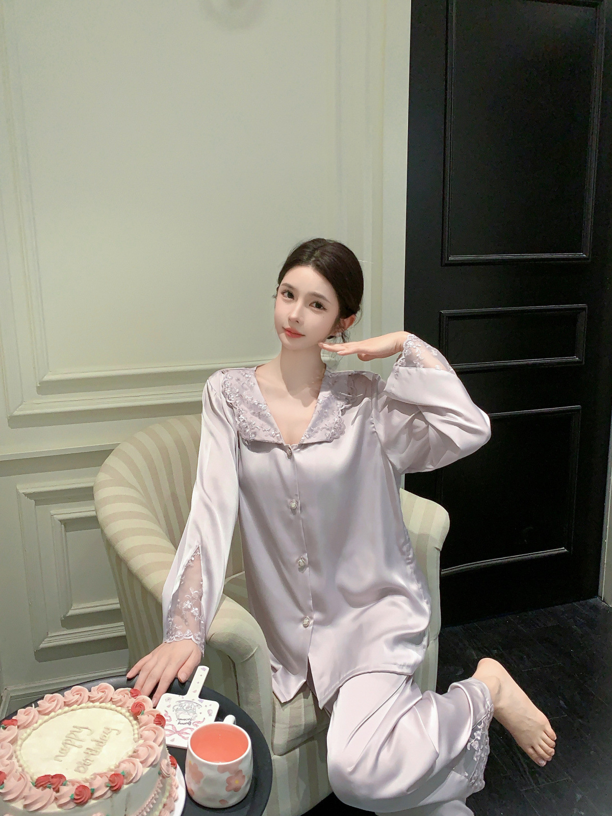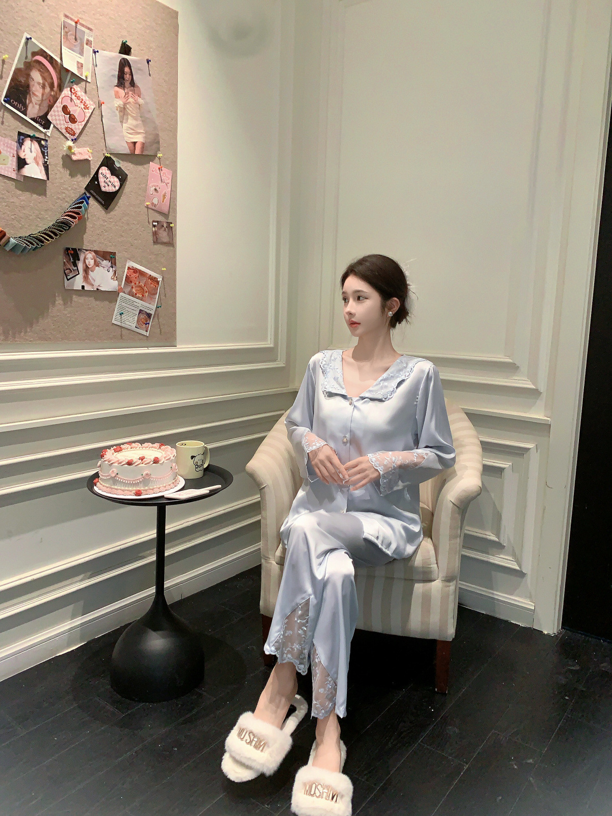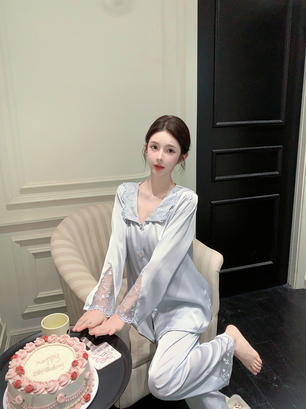얼음과 눈 실크 파자마 여성 프렌치 라펠 레이스 카디건 긴 소매 바지 세트 여름 봄과 가을 홈 옷