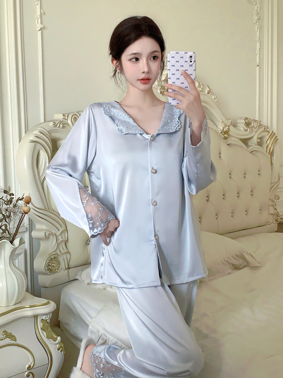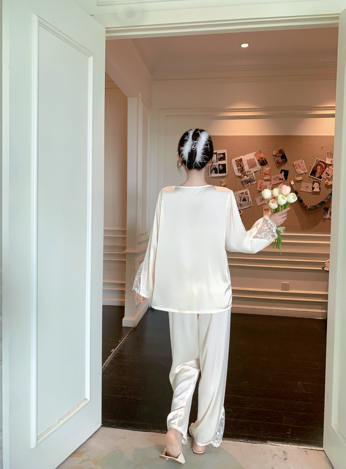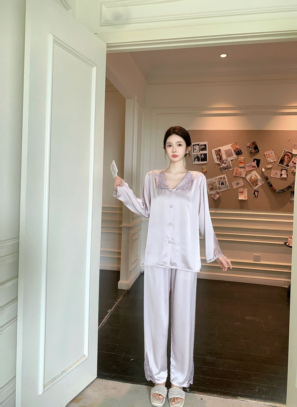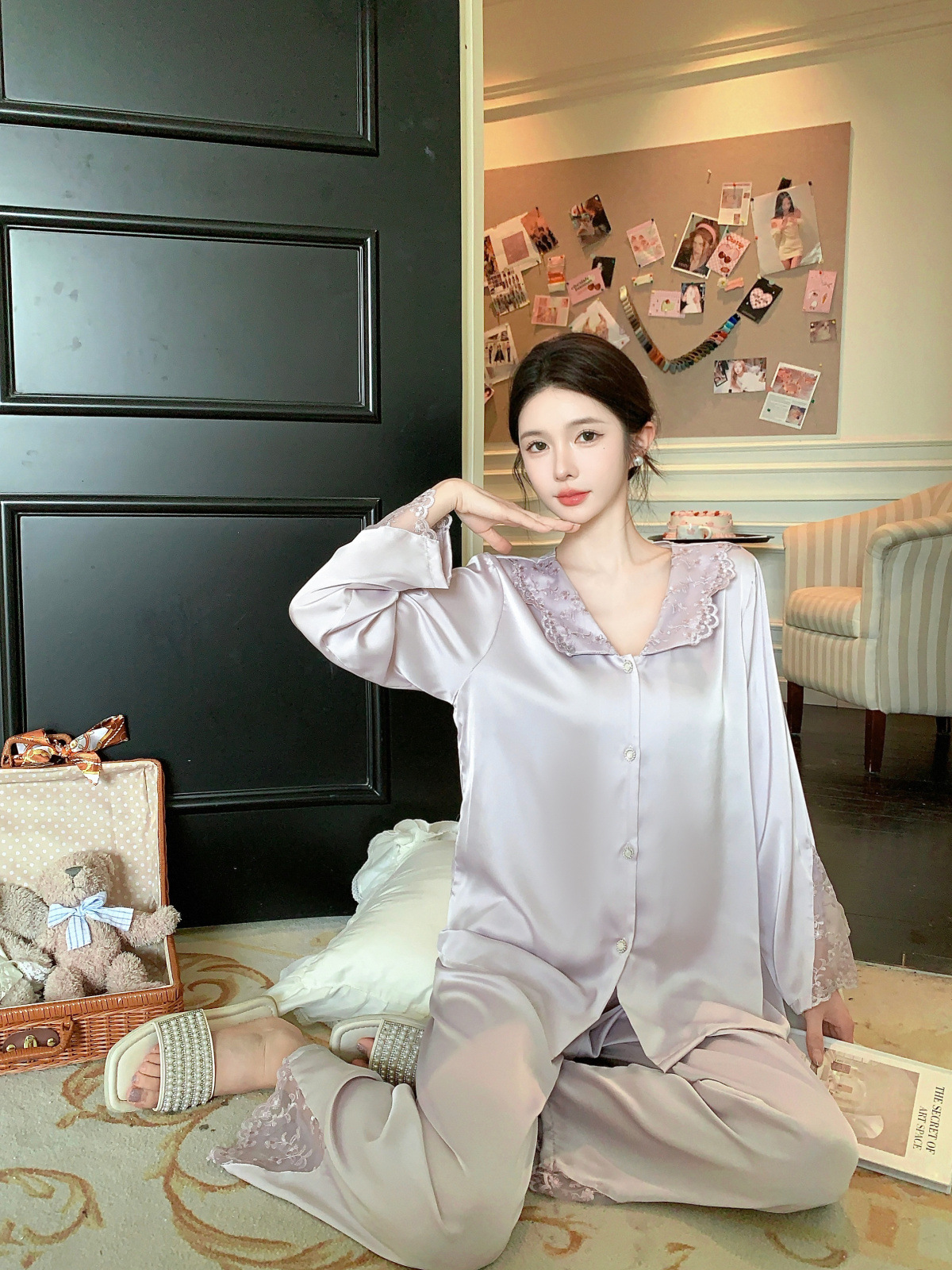 얼음과 눈 실크 파자마 여성 프렌치 라펠 레이스 카디건 긴 소매 바지 세트 여름 봄과 가을 홈 옷