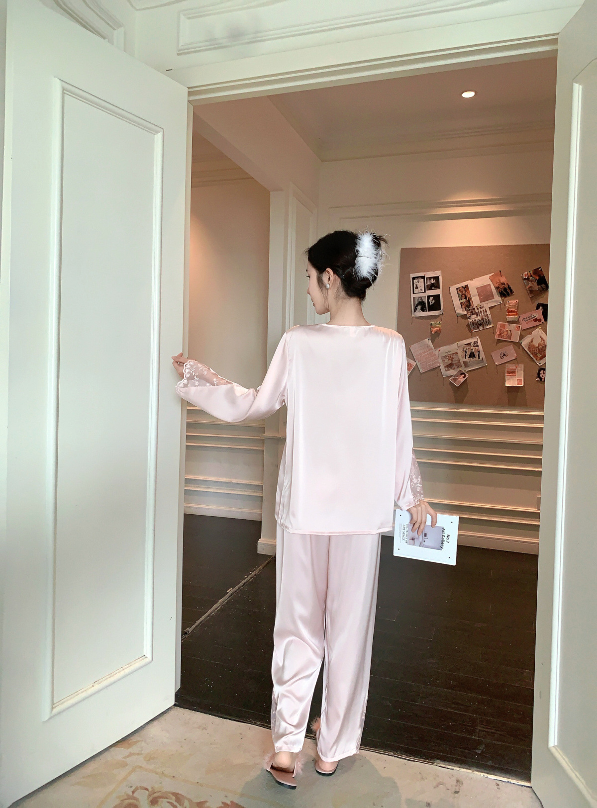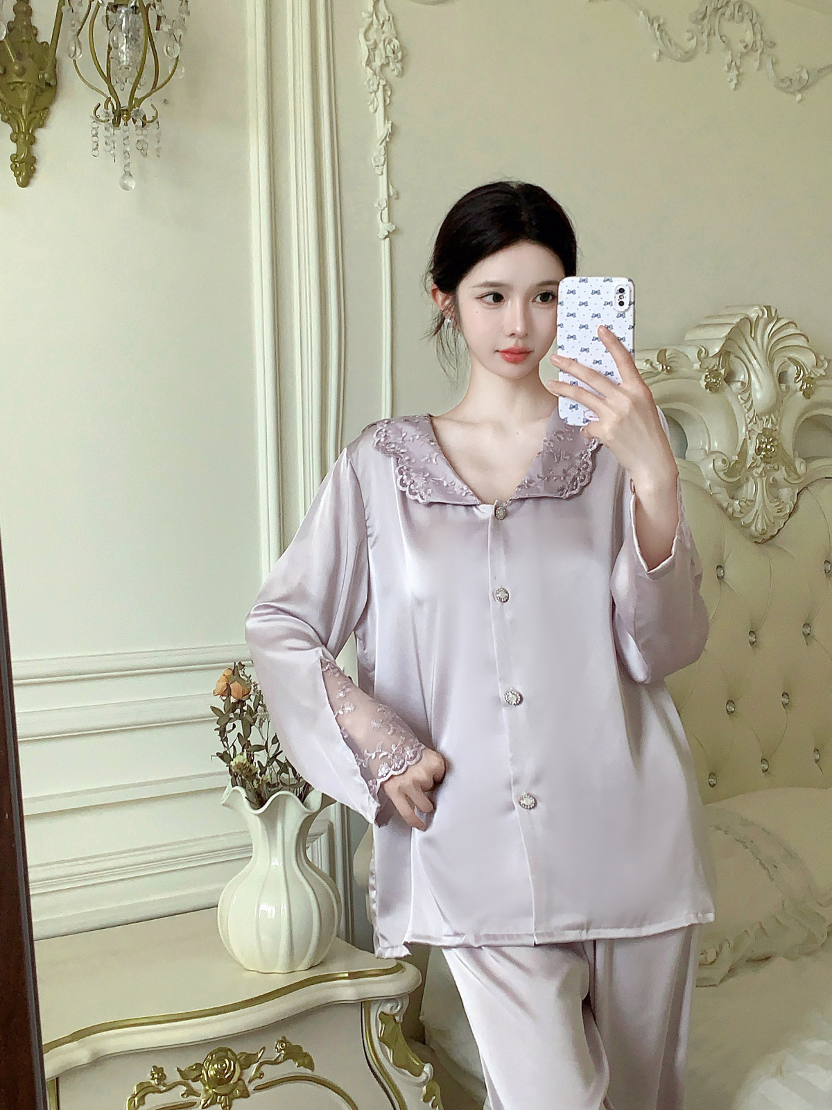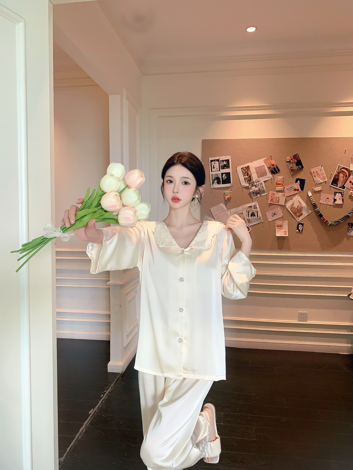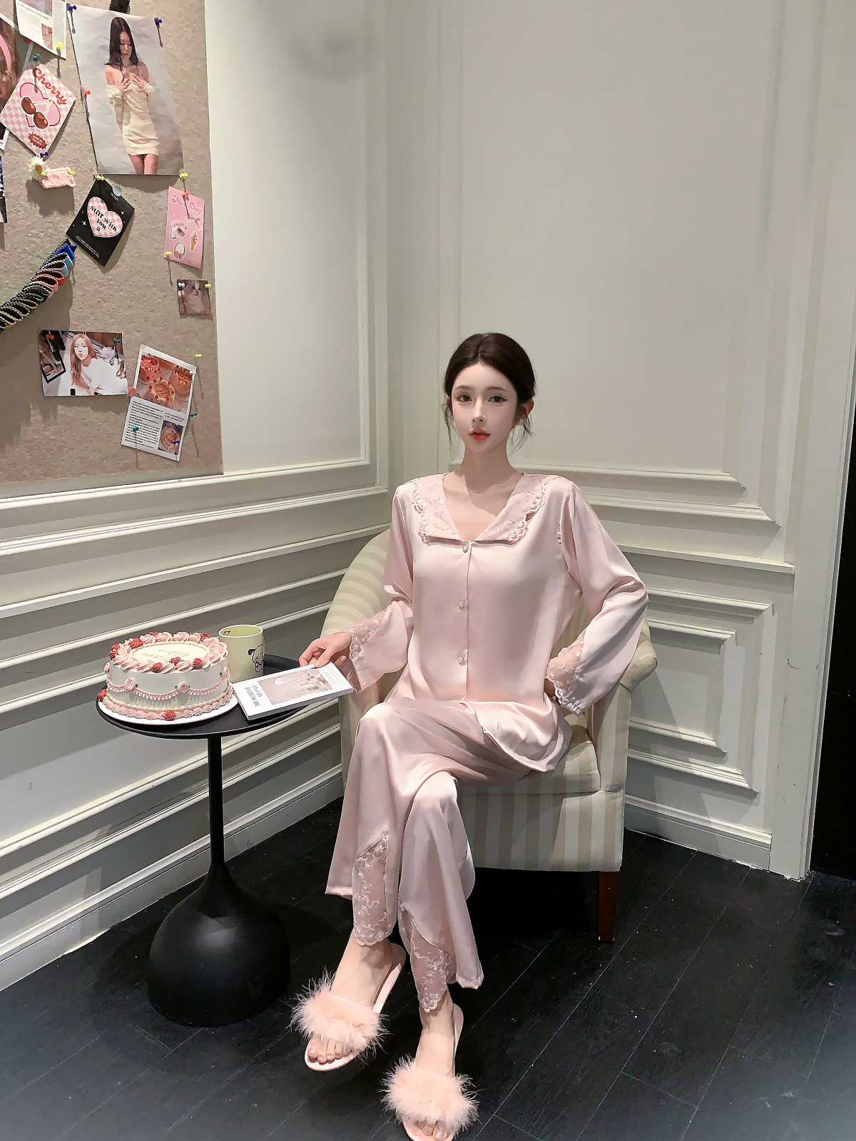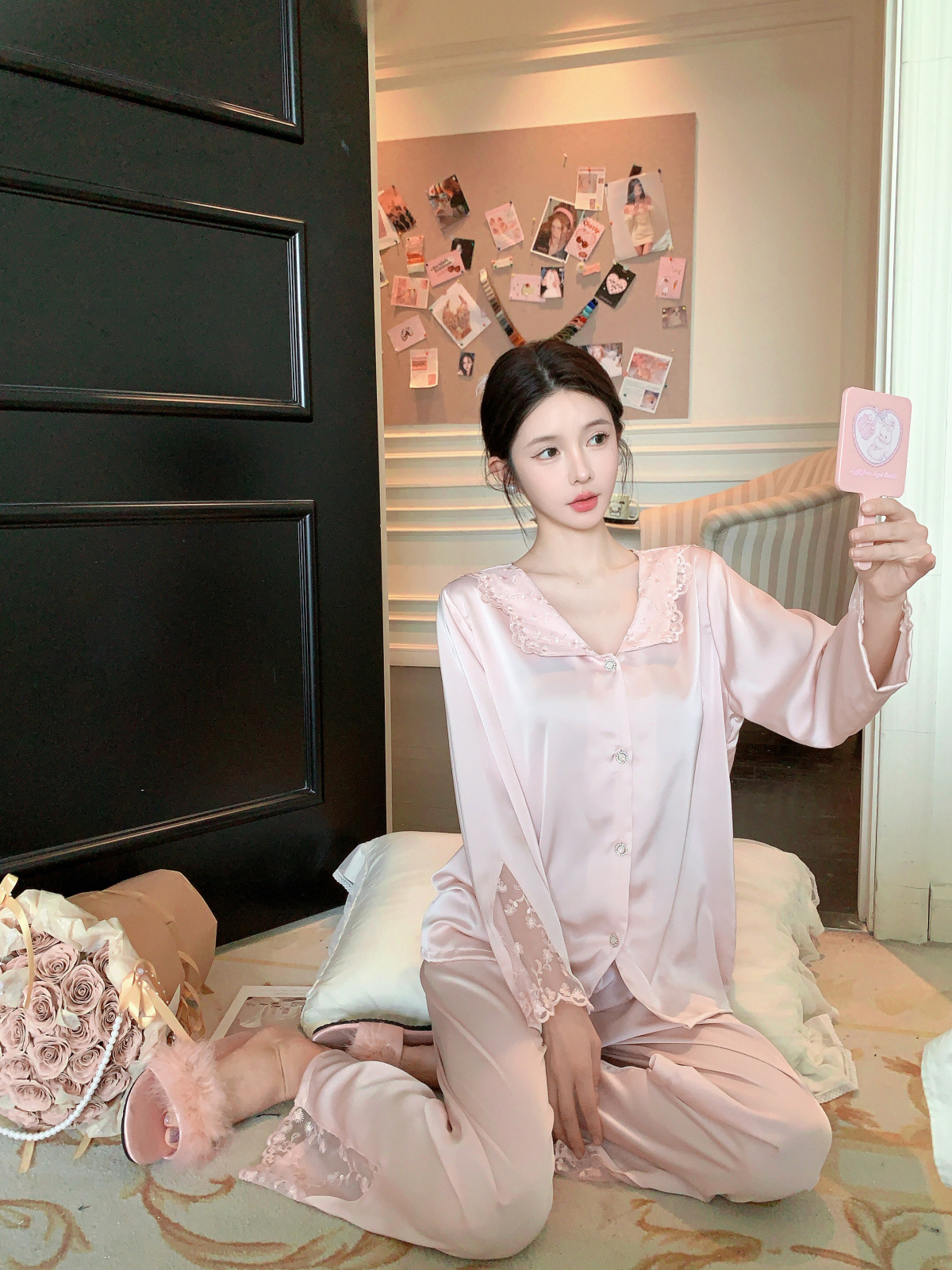 얼음과 눈 실크 파자마 여성 프렌치 라펠 레이스 카디건 긴 소매 바지 세트 여름 봄과 가을 홈 옷