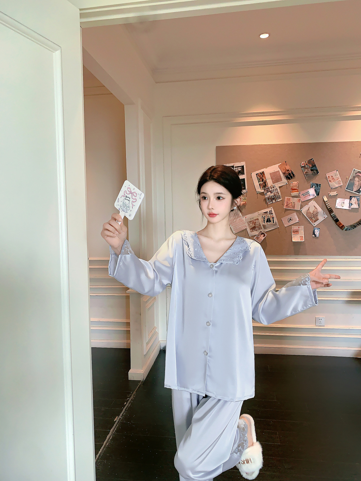 얼음과 눈 실크 파자마 여성 프렌치 라펠 레이스 카디건 긴 소매 바지 세트 여름 봄과 가을 홈 옷스토어 가기