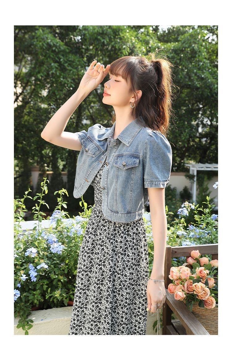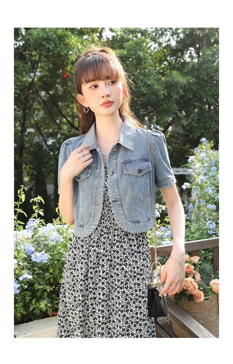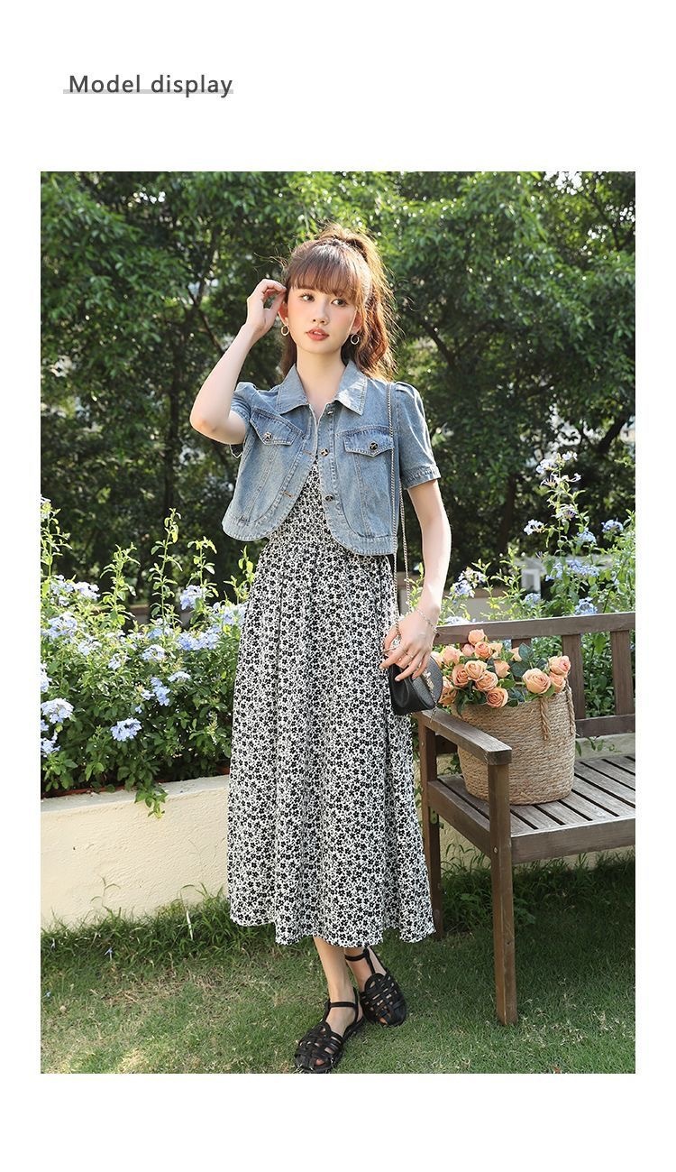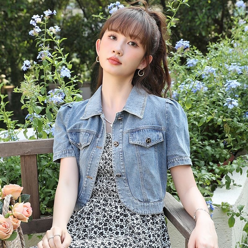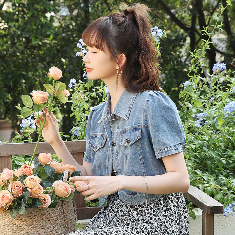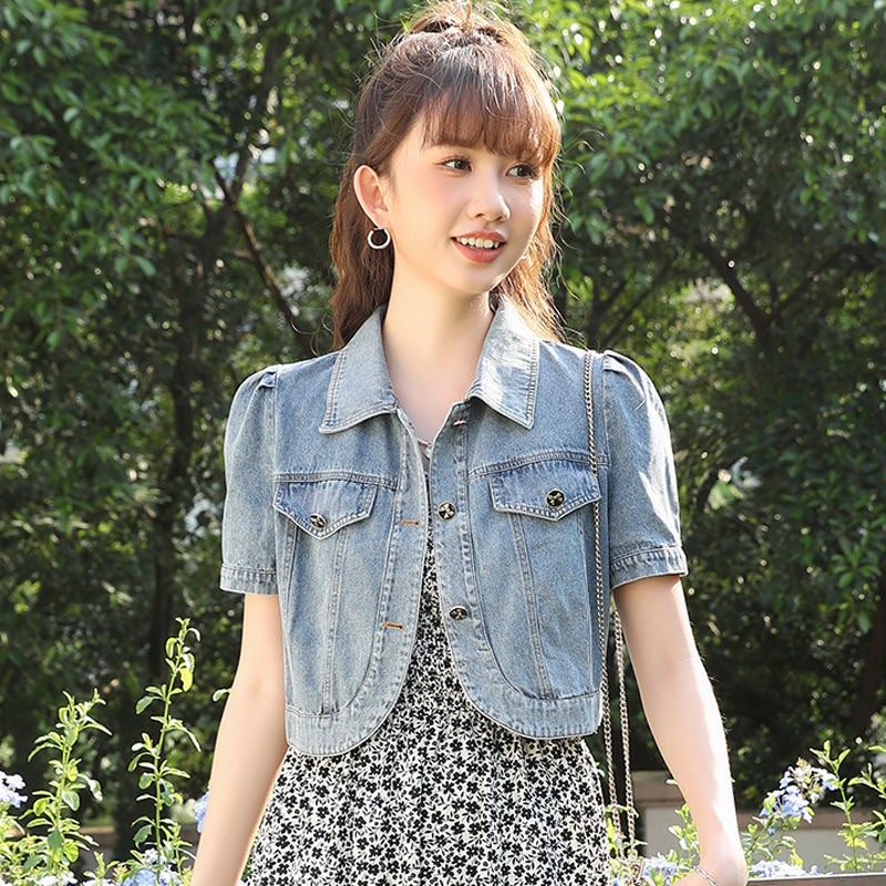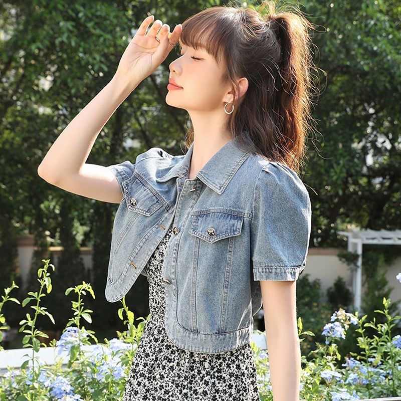 홍콩 스타일 반팔 데님 쇼트 코트 여름 여성용 여성용 서스펜더 스커트 외부 에어컨 블라우스스토어 가기