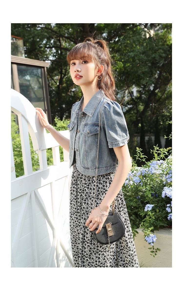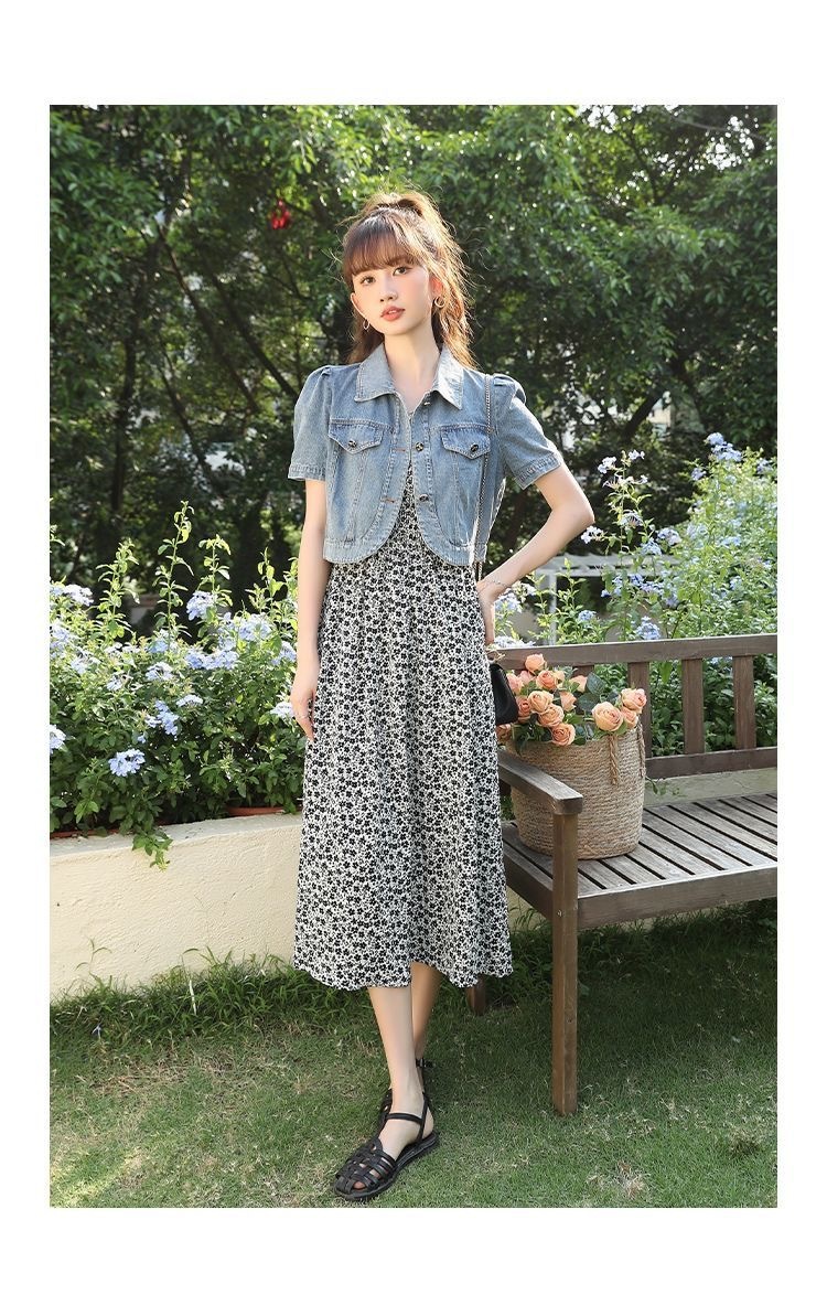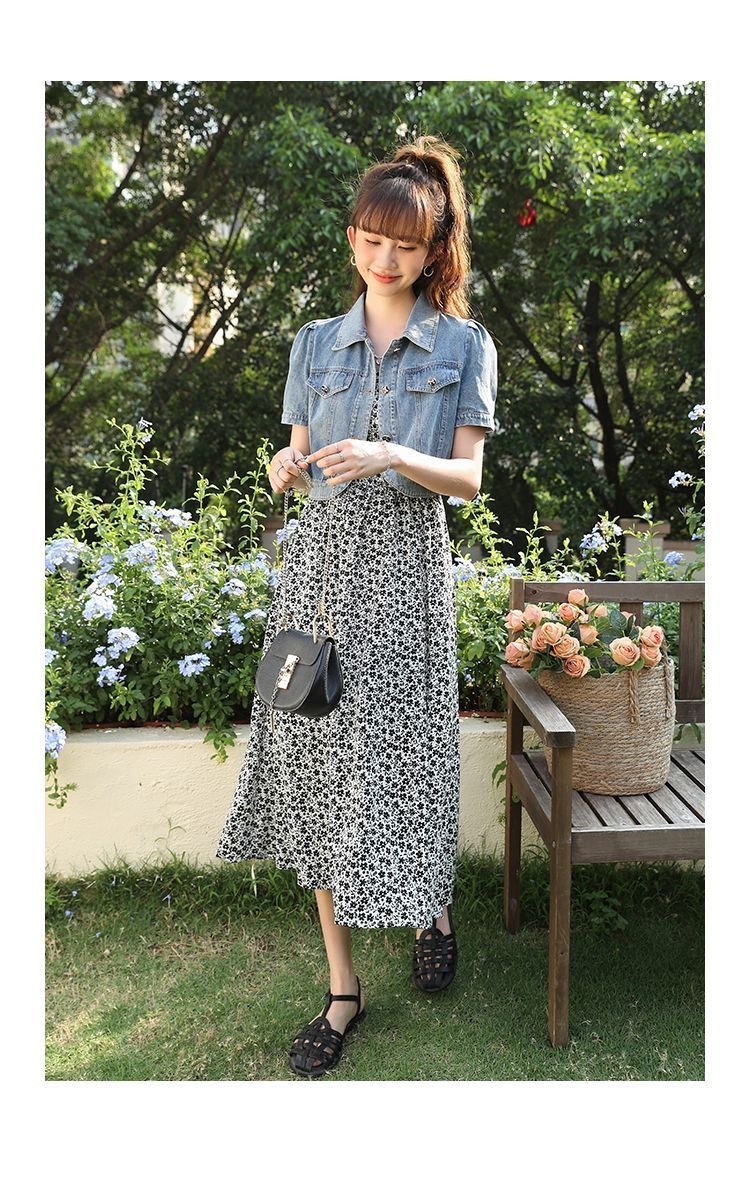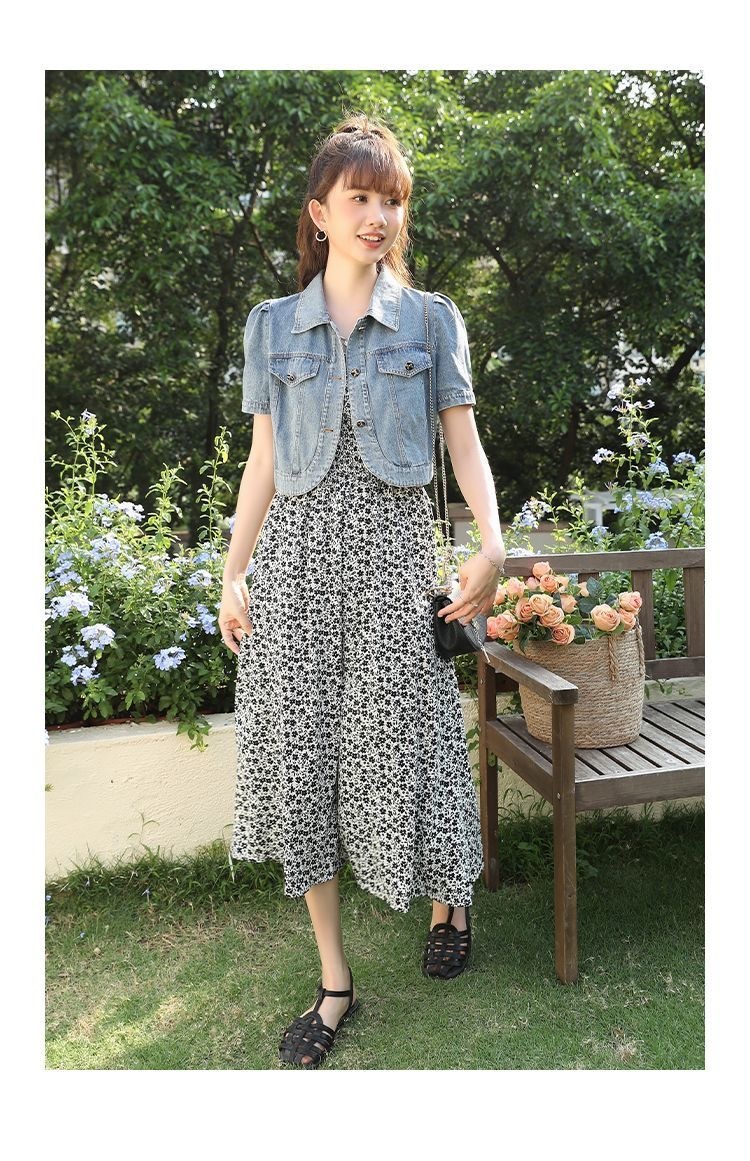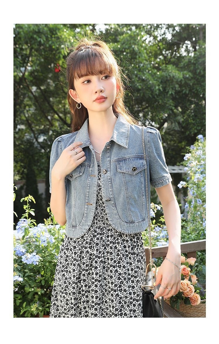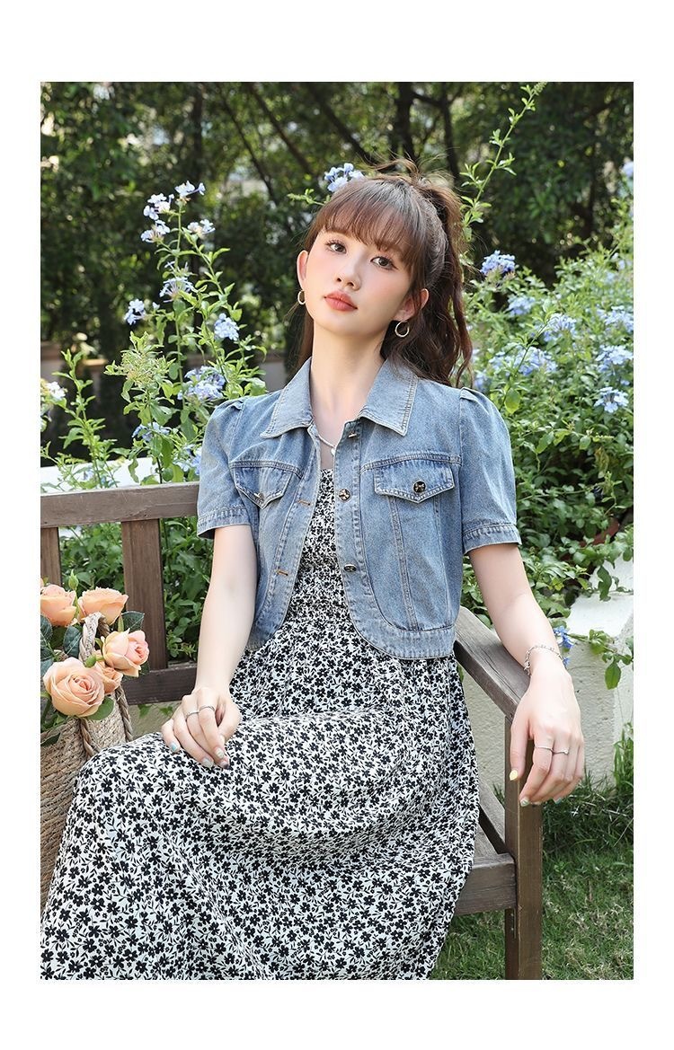 홍콩 스타일 반팔 데님 쇼트 코트 여름 여성용 여성용 서스펜더 스커트 외부 에어컨 블라우스스토어 가기