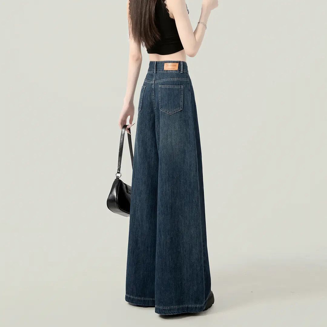여름 여성을 위한 복고풍 편안한 캐주얼 와이드 레그 청바지 새로운 디자인 하이 웨이스트 루즈 슬리밍 다용도 바닥 길이 바지