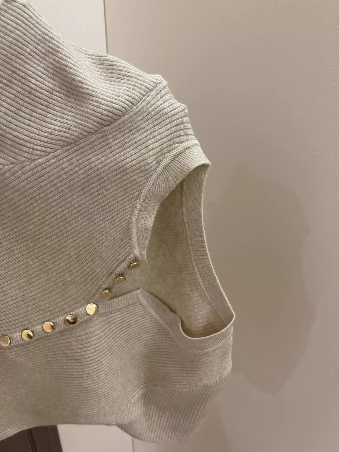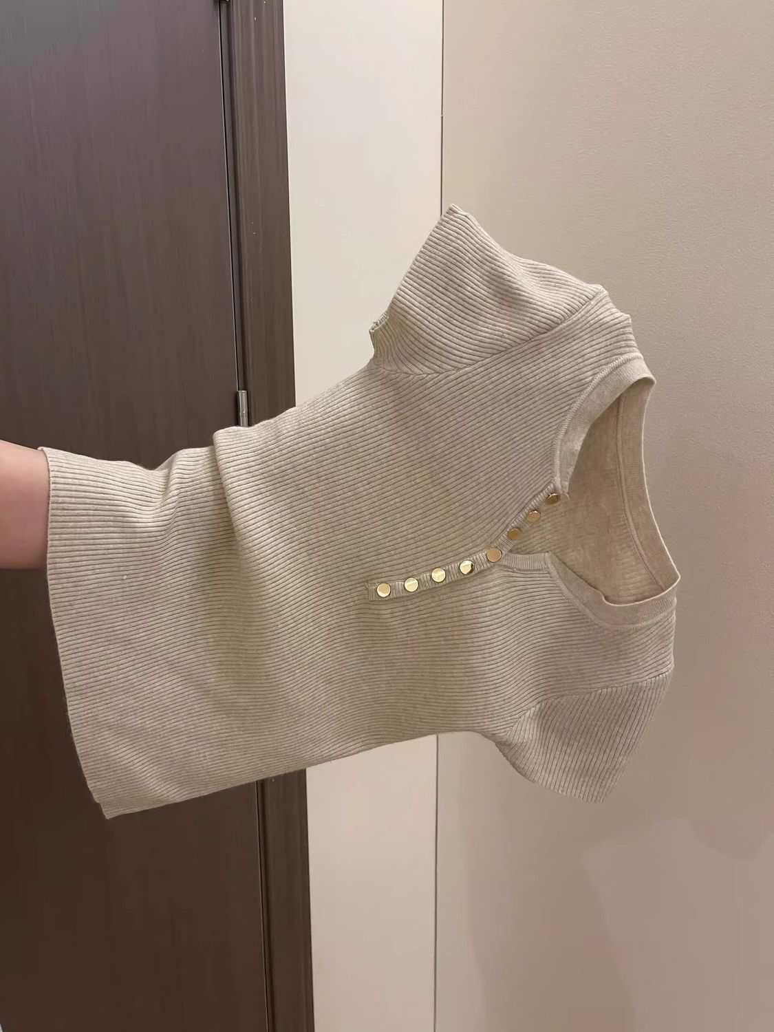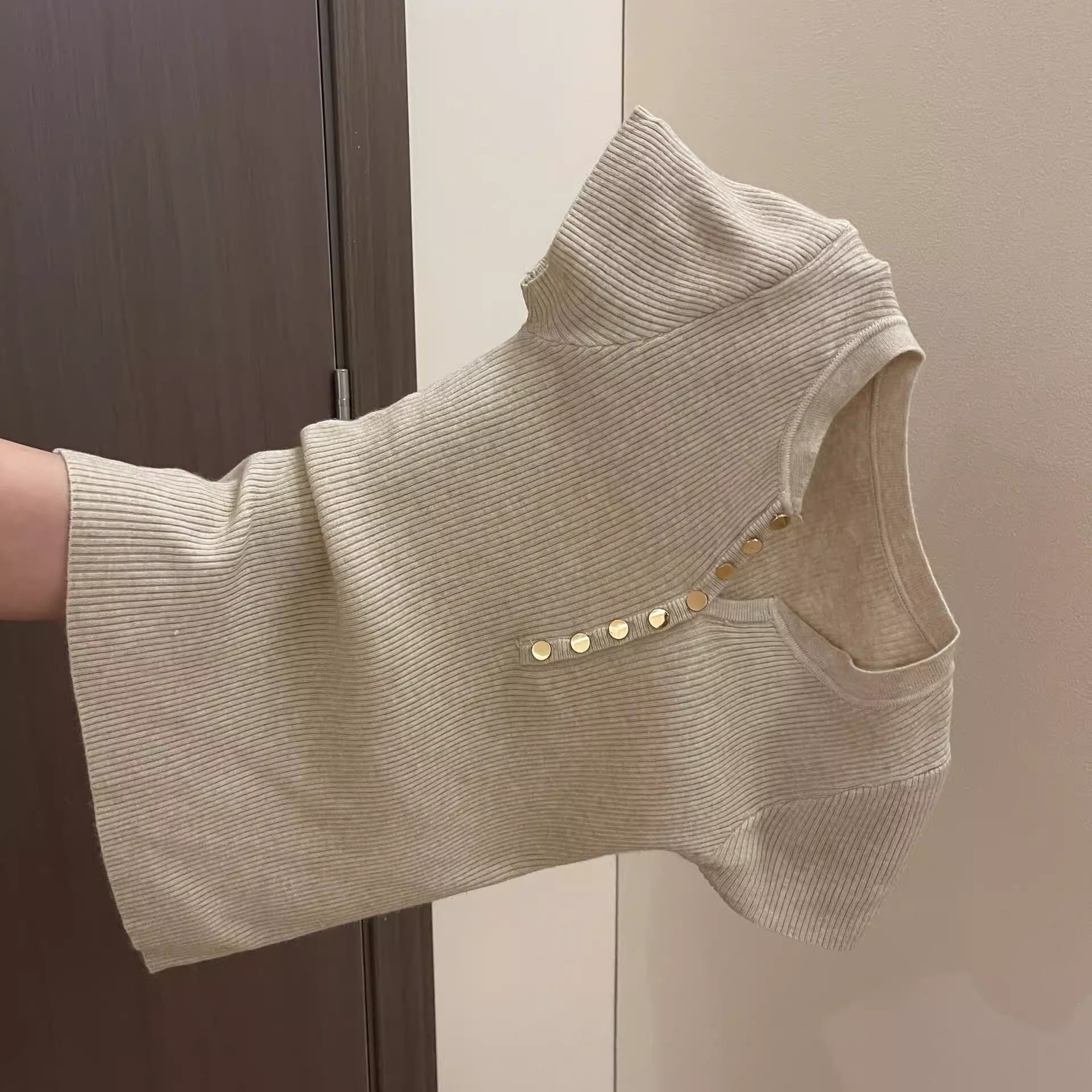 프랑스 스타일 올 매치 슬림 핏 니트 반팔 여성 여름 새로운 도착 서양식 인기 메탈 하프 버튼 디자인 센스 탑스토어 가기