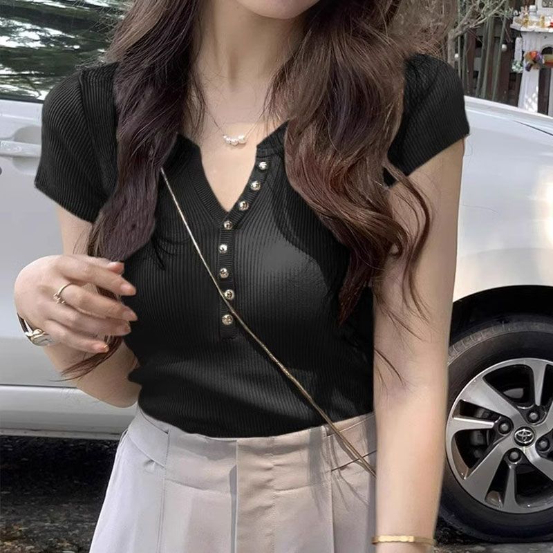 프랑스 스타일 올 매치 슬림 핏 니트 반팔 여성 여름 새로운 도착 서양식 인기 메탈 하프 버튼 디자인 센스 탑