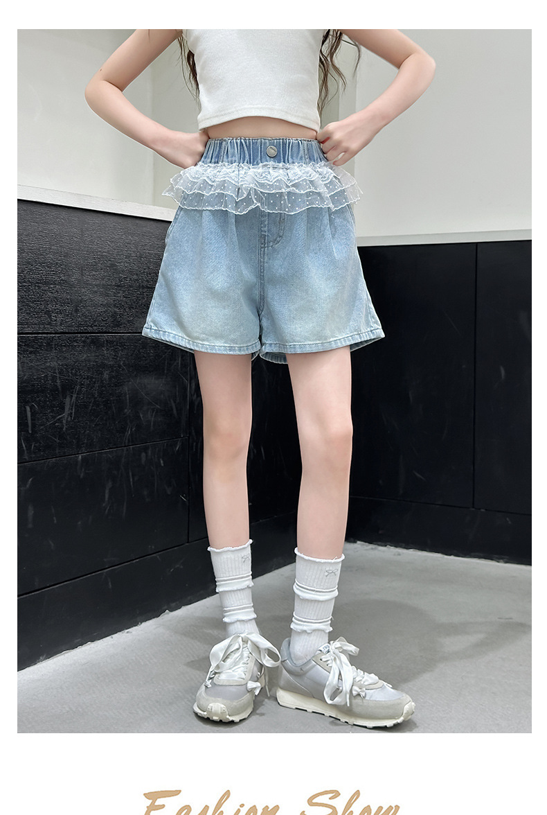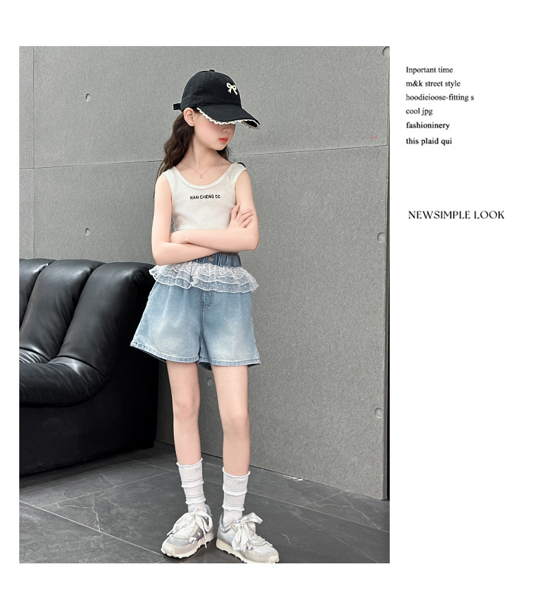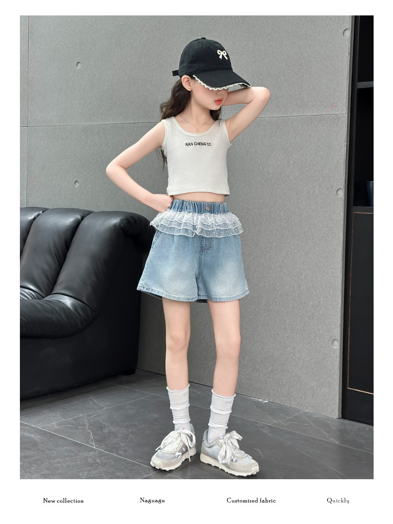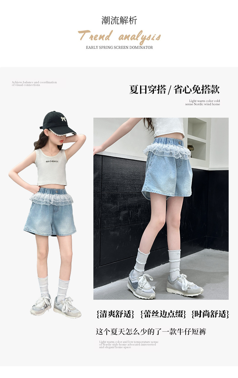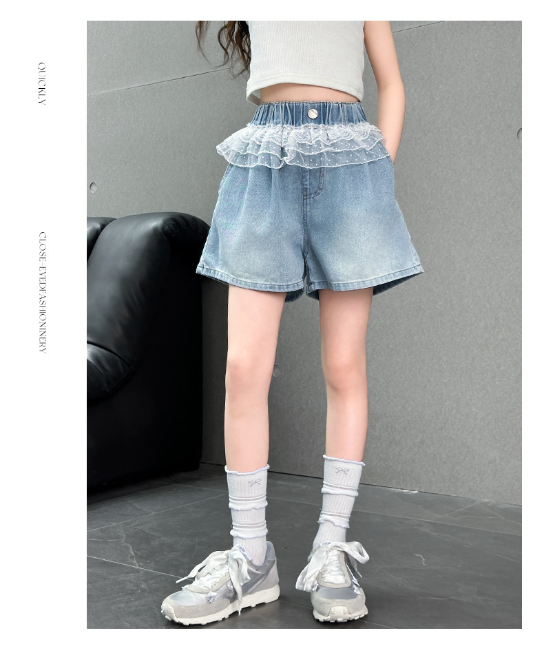 여자 레이스 반바지 2025 여름 캐주얼 바지 큰 어린이 패션 데님 핫 바지 어린 소녀 3 점 바지스토어 가기
