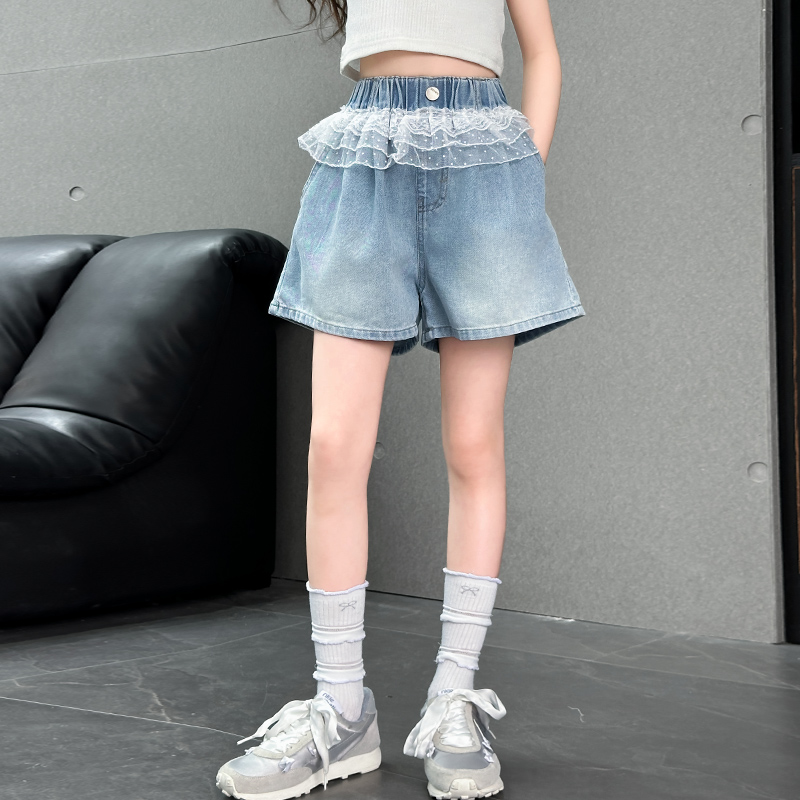 여자 레이스 반바지 2025 여름 캐주얼 바지 큰 어린이 패션 데님 핫 바지 어린 소녀 3 점 바지