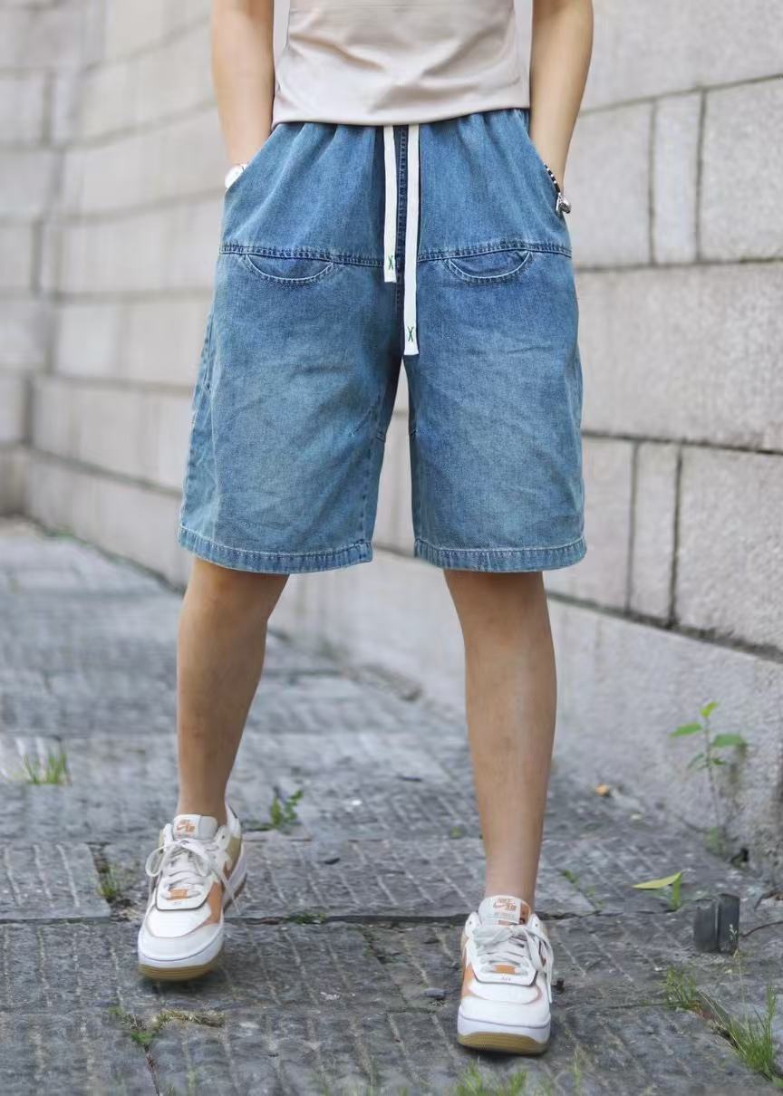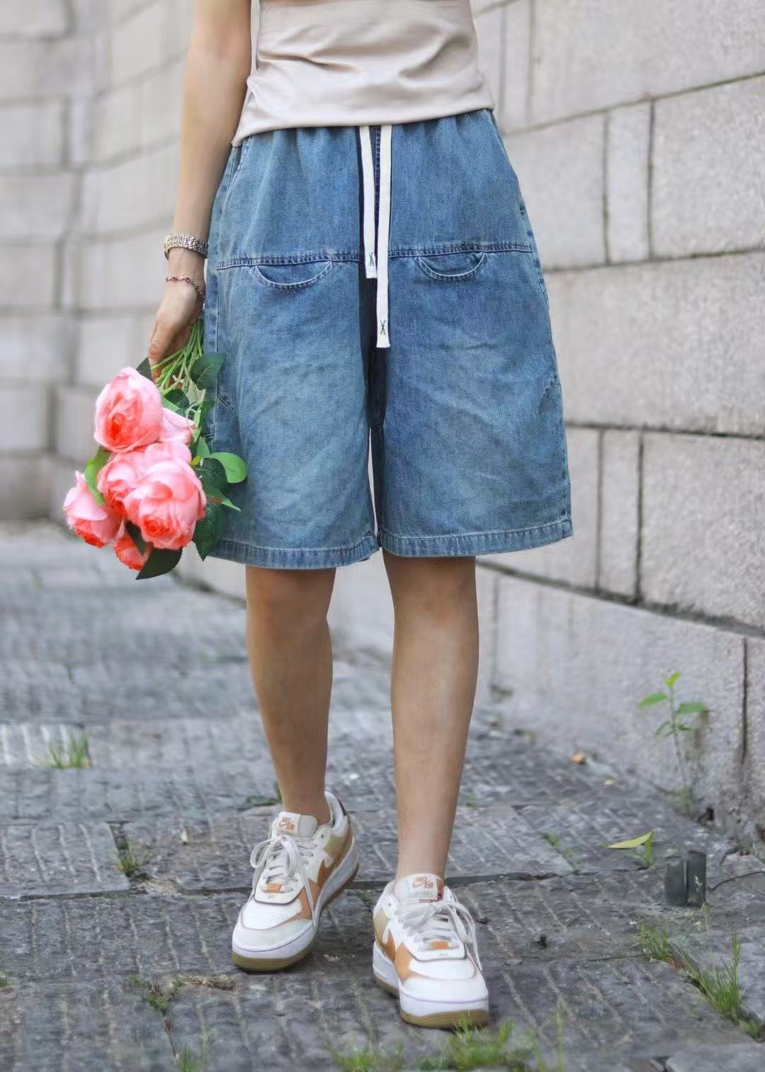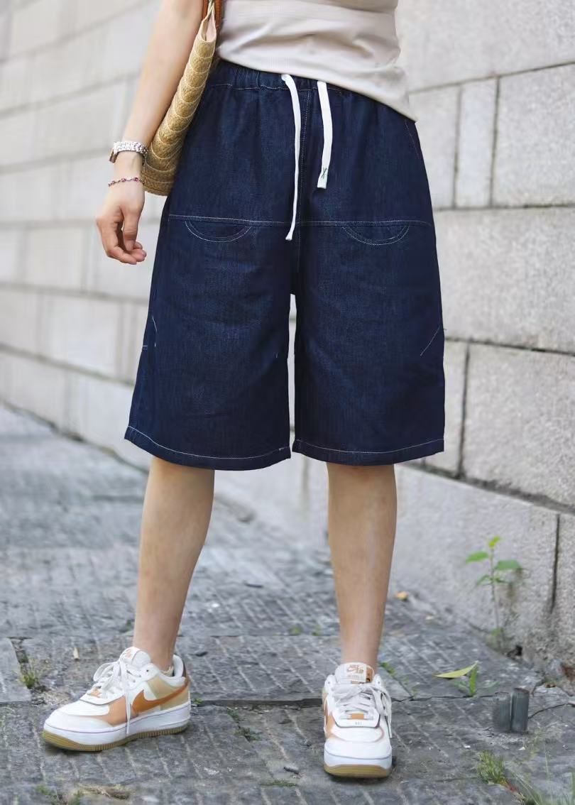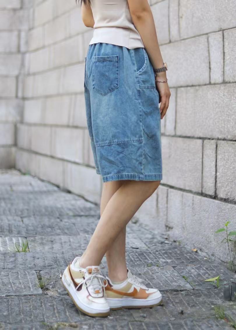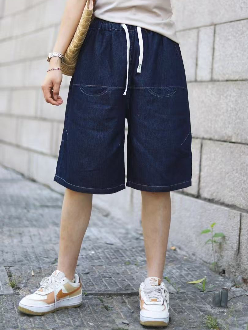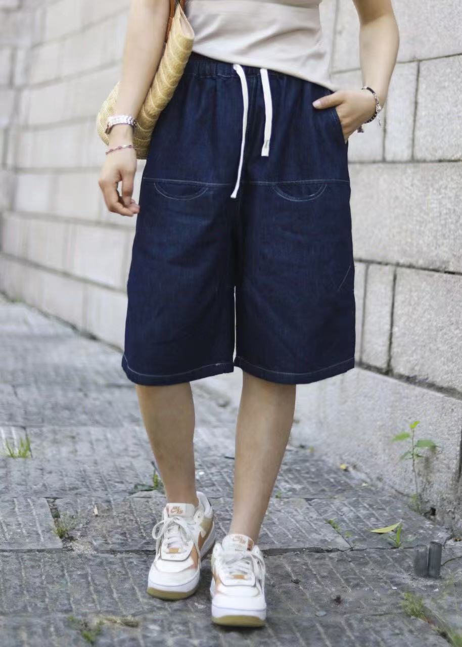 일본 모리 소녀 스타일 2025 여름 신작 복고풍 신축성 있는 허리 레이스 업 워싱 데님 반바지 여성용 5부 바지 스트레이트스토어 가기