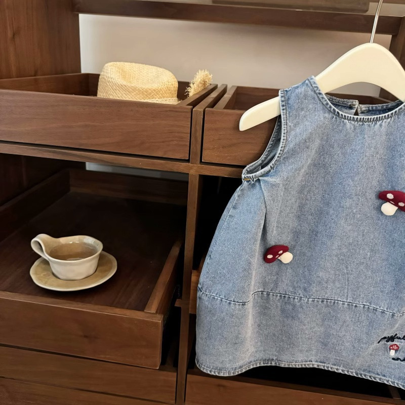 [라임] 소형 버섯 한국 아동복 소녀 서양식 원피스 수놓은 데님 버드 조끼 원피스 트렌디