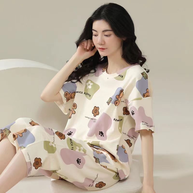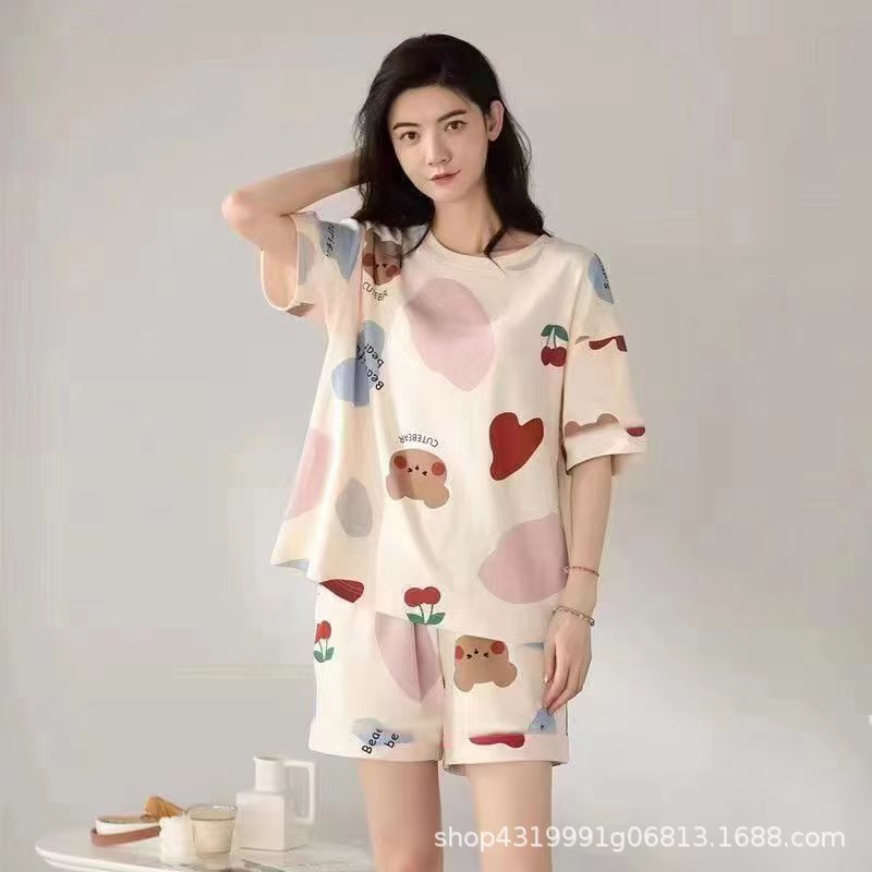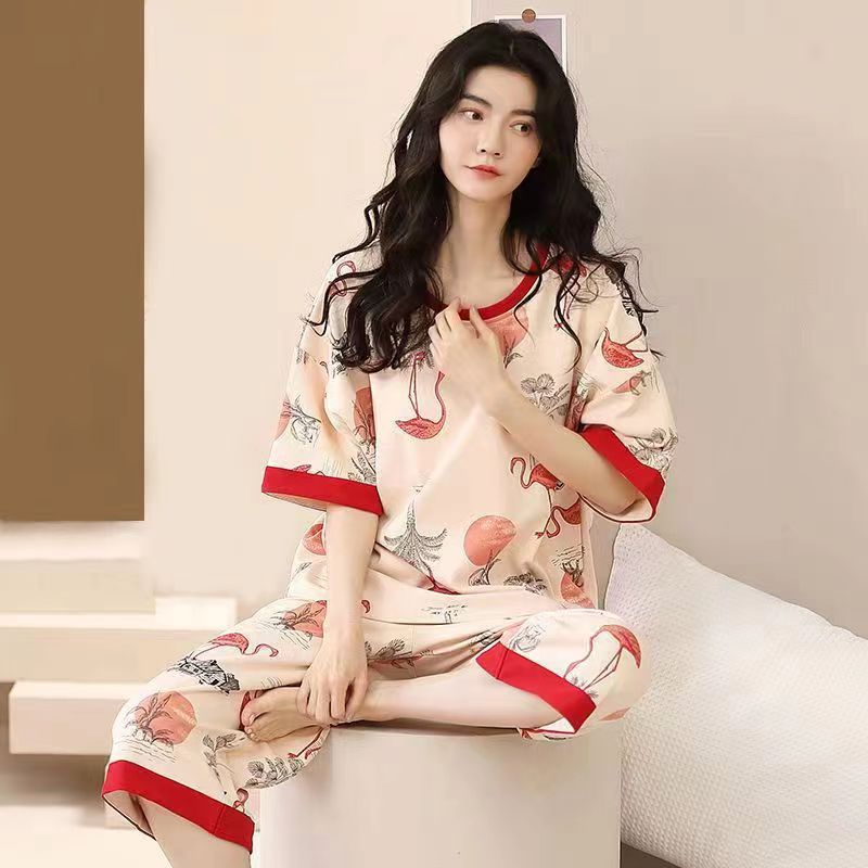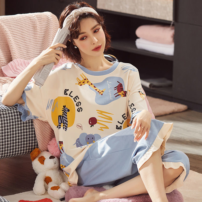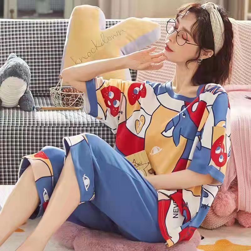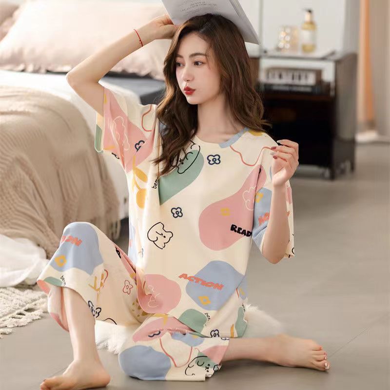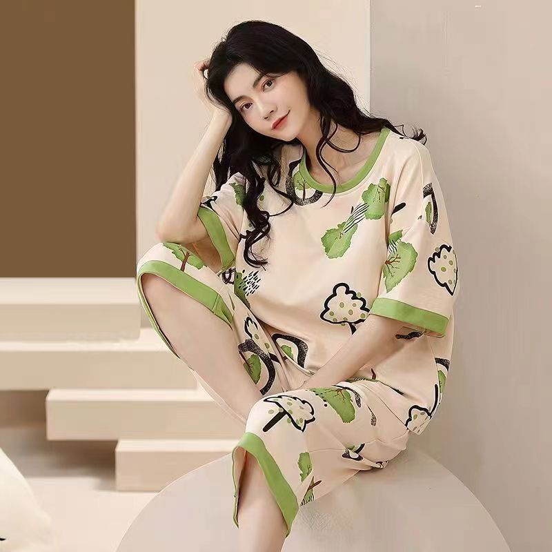 공장 직접 잠옷 여성 봄과 여름 자른 슬리브 바지 얇은 세트 플러스 사이즈 에어컨 의류 가정 옷은 외부에서 착용 할 수 있습니다.스토어 가기