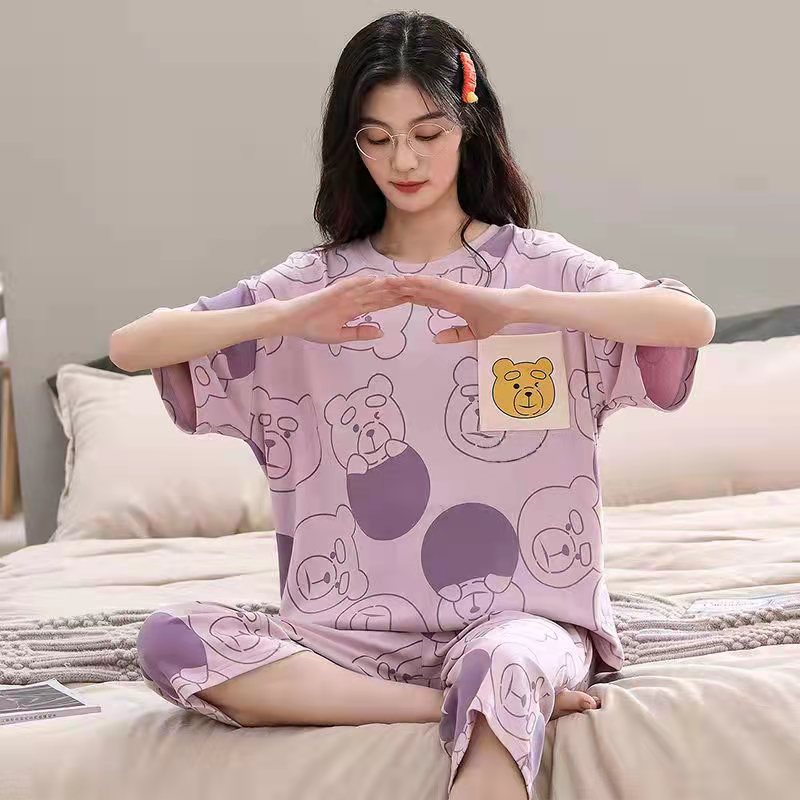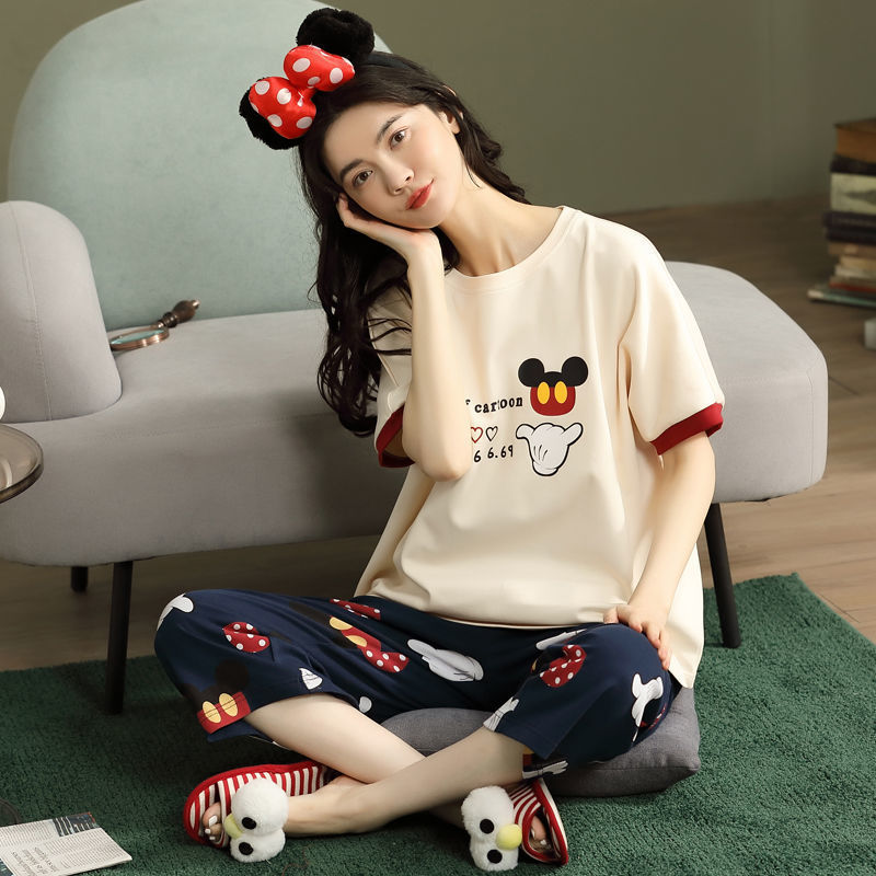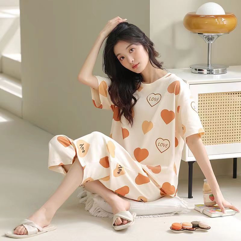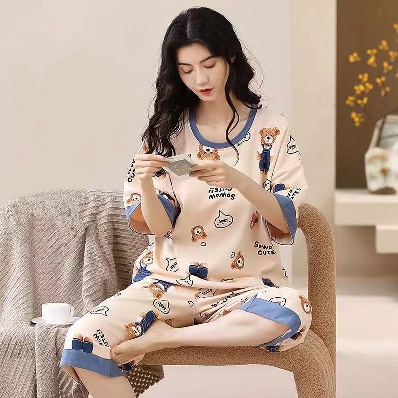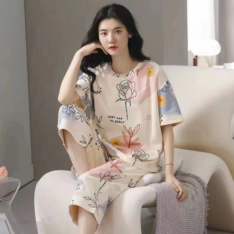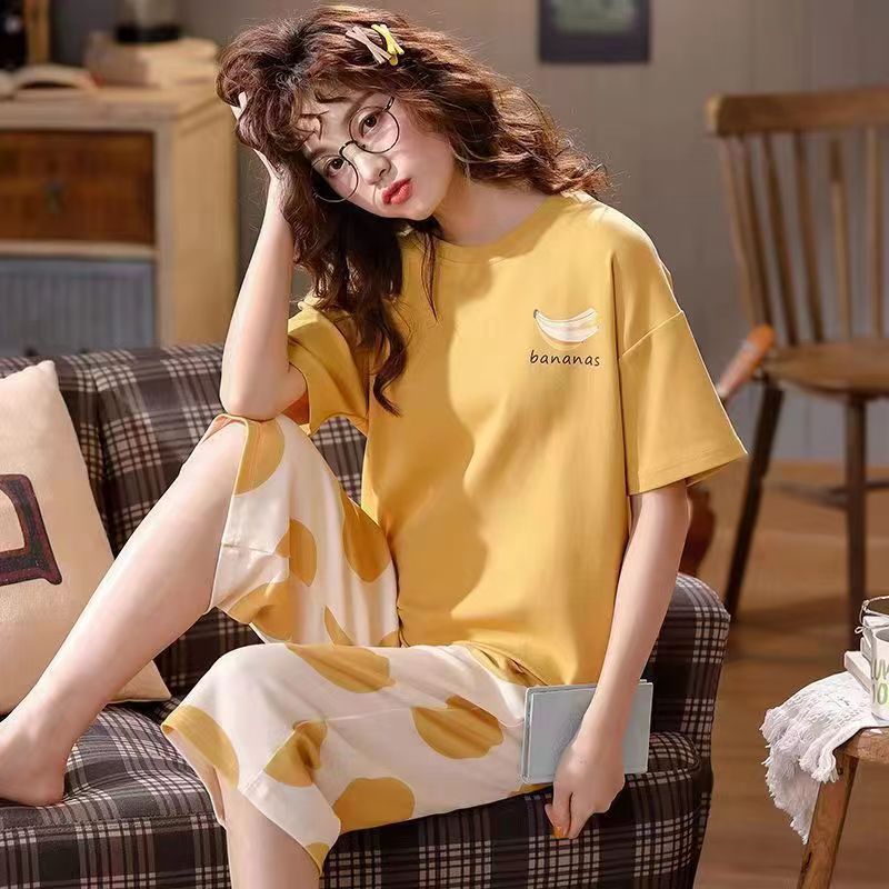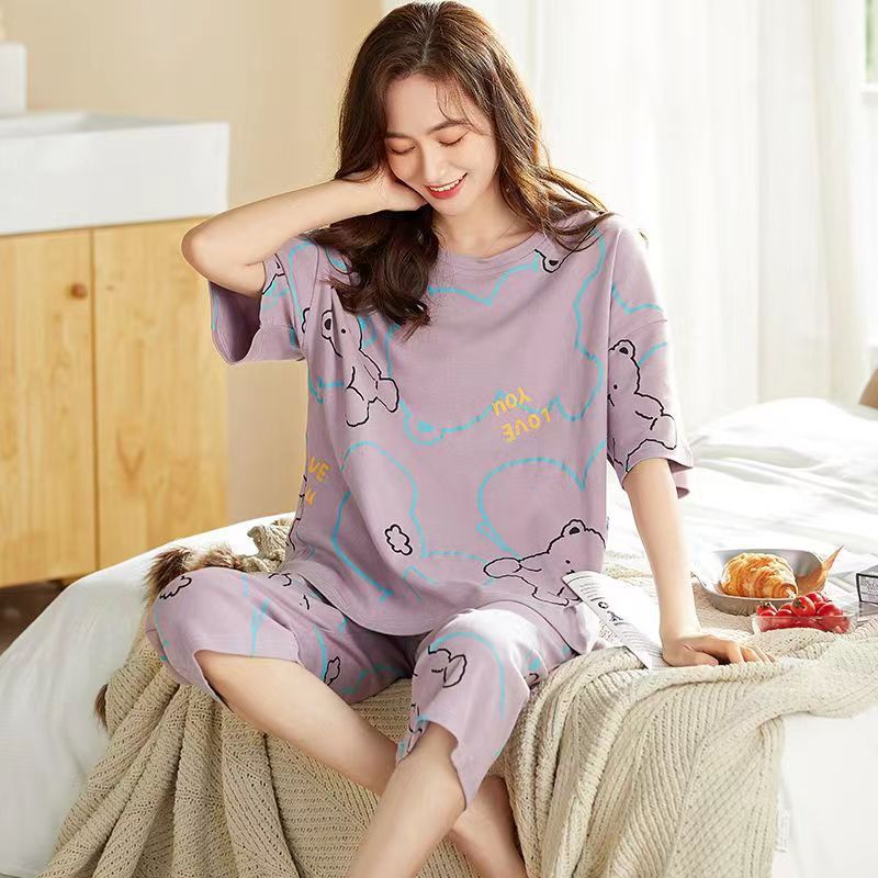 공장 직접 잠옷 여성 봄과 여름 자른 슬리브 바지 얇은 세트 플러스 사이즈 에어컨 의류 가정 옷은 외부에서 착용 할 수 있습니다.스토어 가기