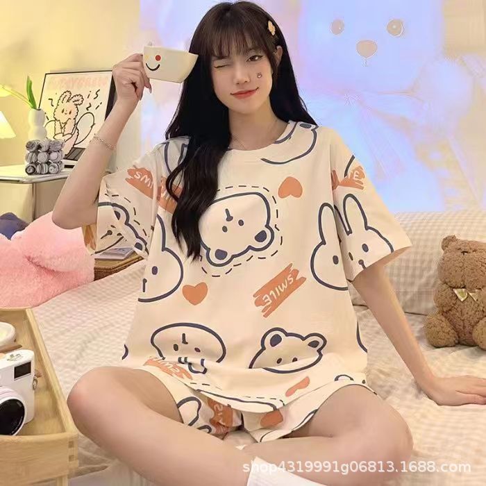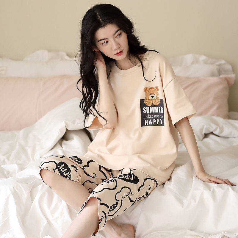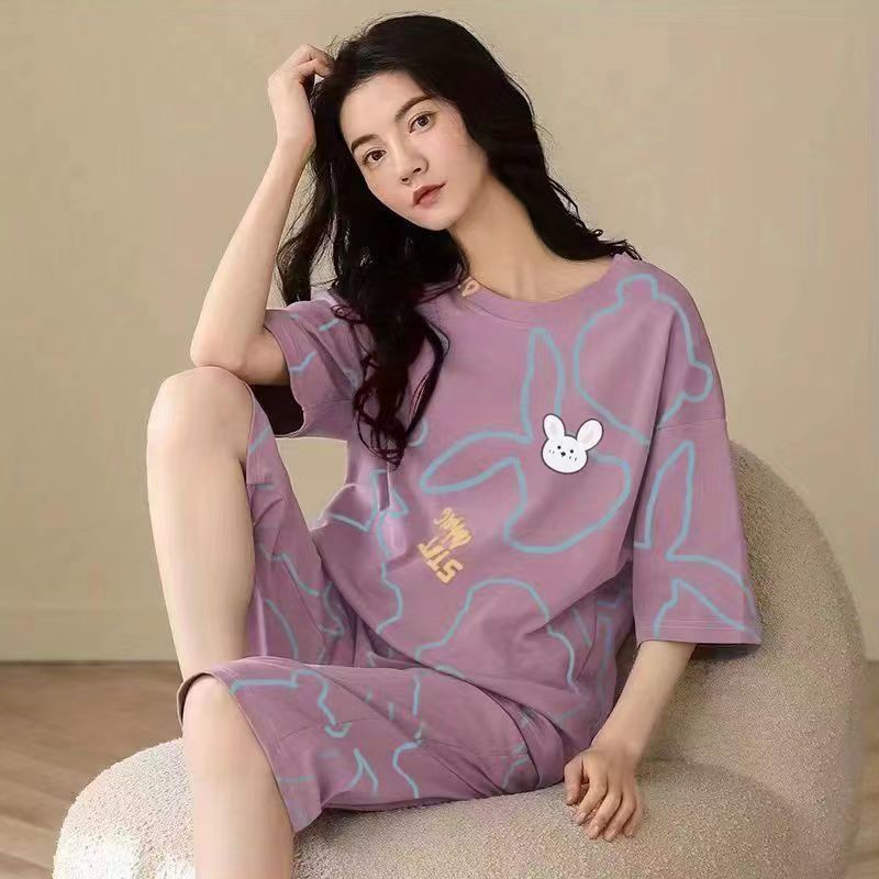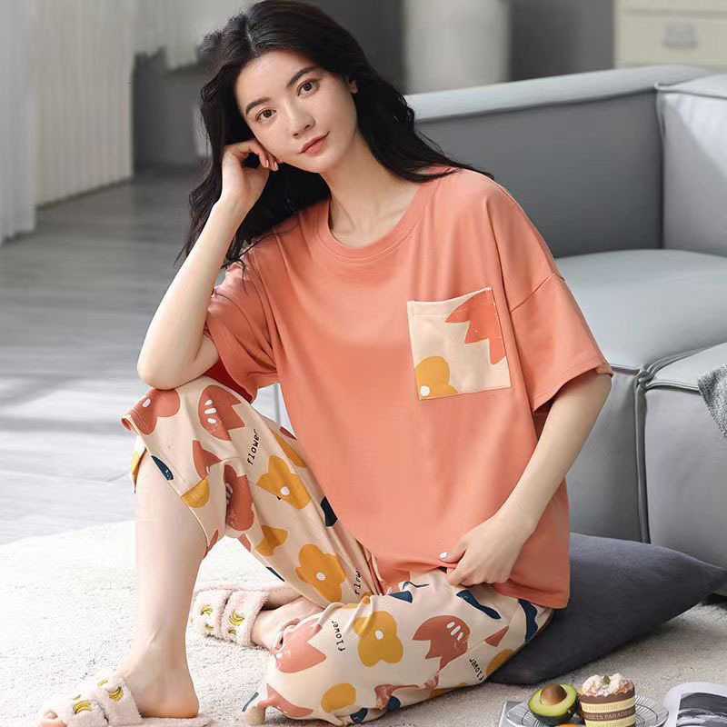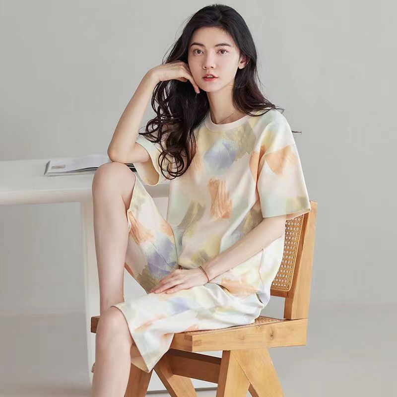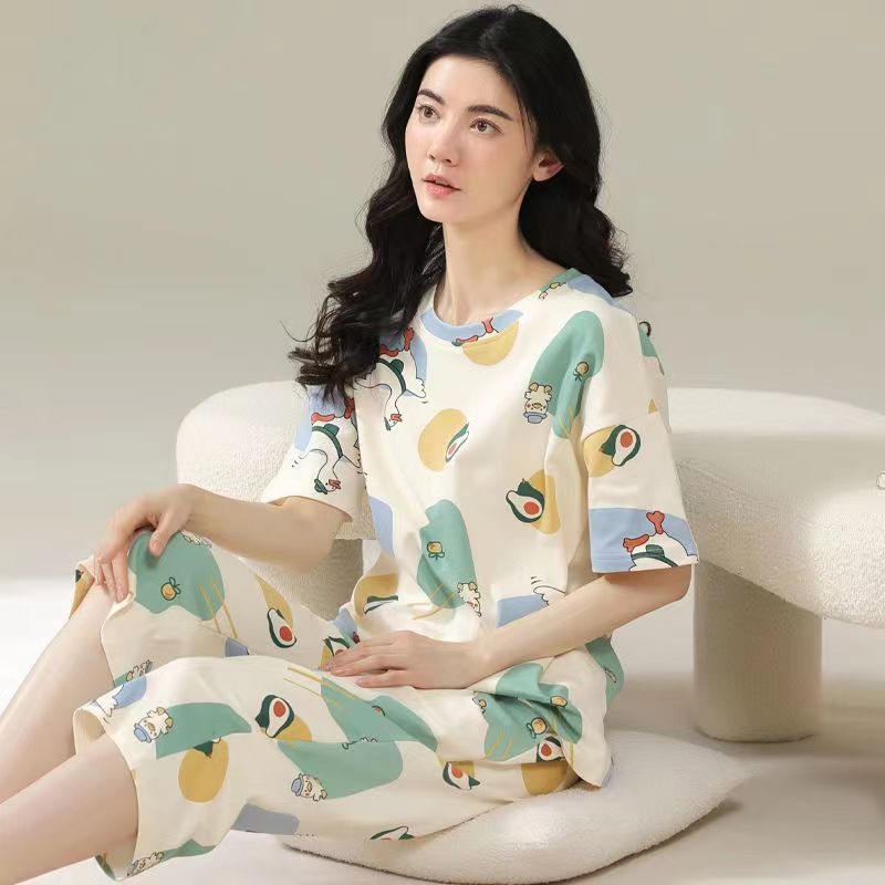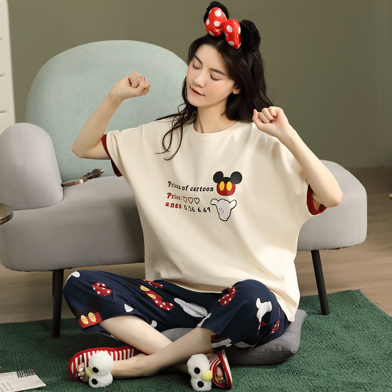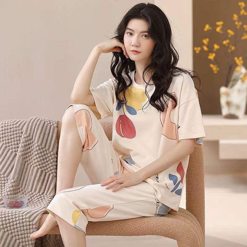 공장 직접 잠옷 여성 봄과 여름 자른 슬리브 바지 얇은 세트 플러스 사이즈 에어컨 의류 가정 옷은 외부에서 착용 할 수 있습니다.스토어 가기