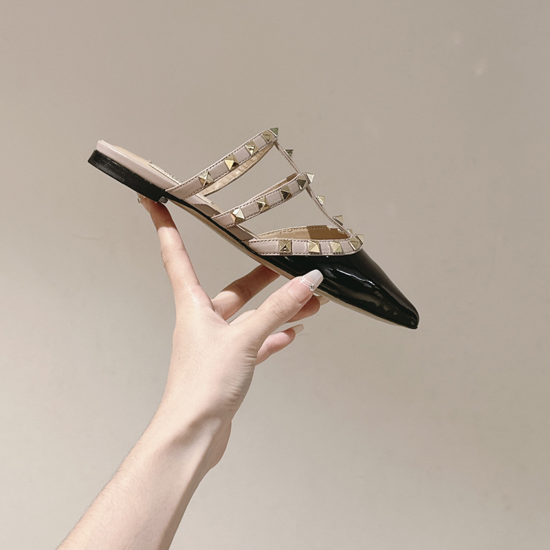 로고 2025V 홈 리벳 포인티드 토 플랫 샌들 여성용 정품 가죽 발가락 샌들 유럽 및 미국 여성용 원 스트랩 샌들