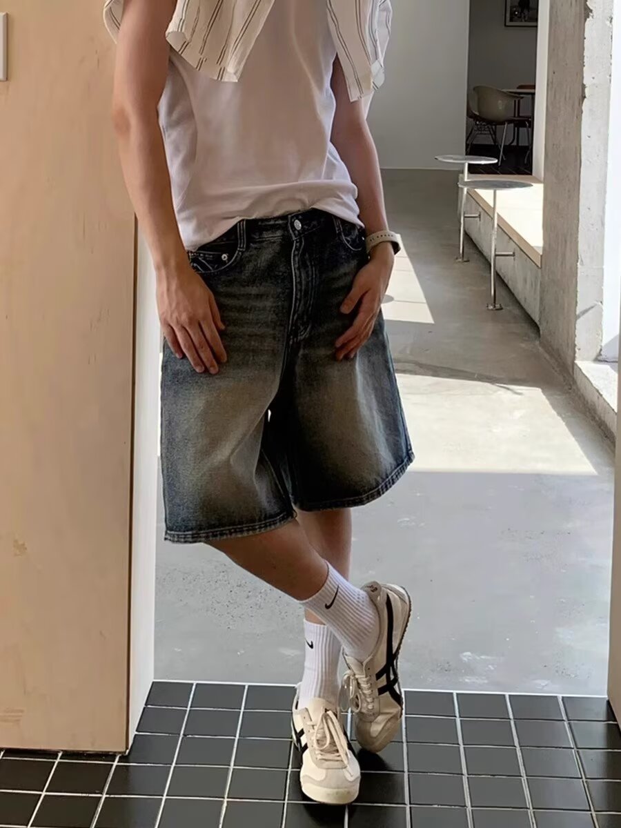 아메리칸 스타일 하이 스트리트 빈티지 올드 데님 반바지 남자 여름 간단한 올 매치 통근 캐주얼 스트레이트 바지스토어 가기
