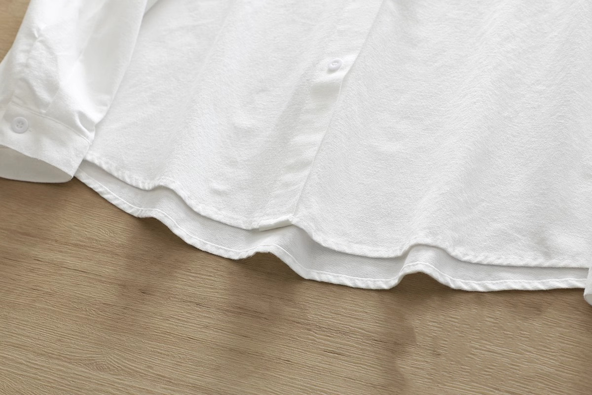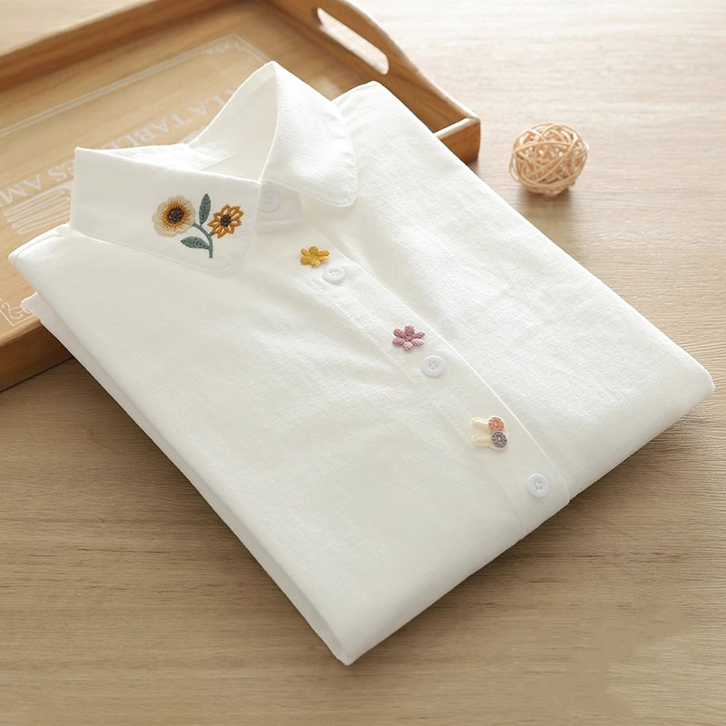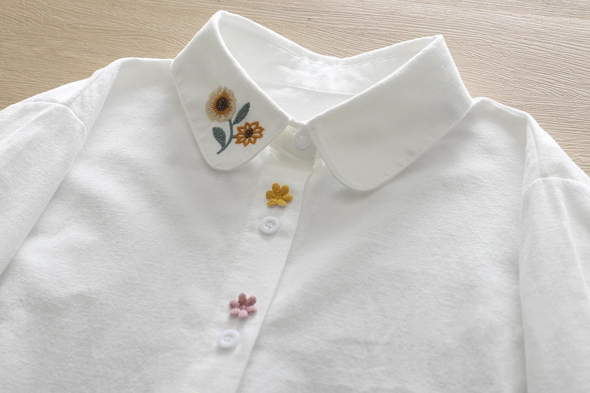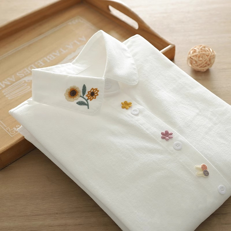 여성을위한 순수 코튼 긴팔 셔츠 봄, 가을 새로운 스타일 예술적 작은 신선한 해바라기 자수 대학 스타일 캐주얼 셔츠 탑스토어 가기