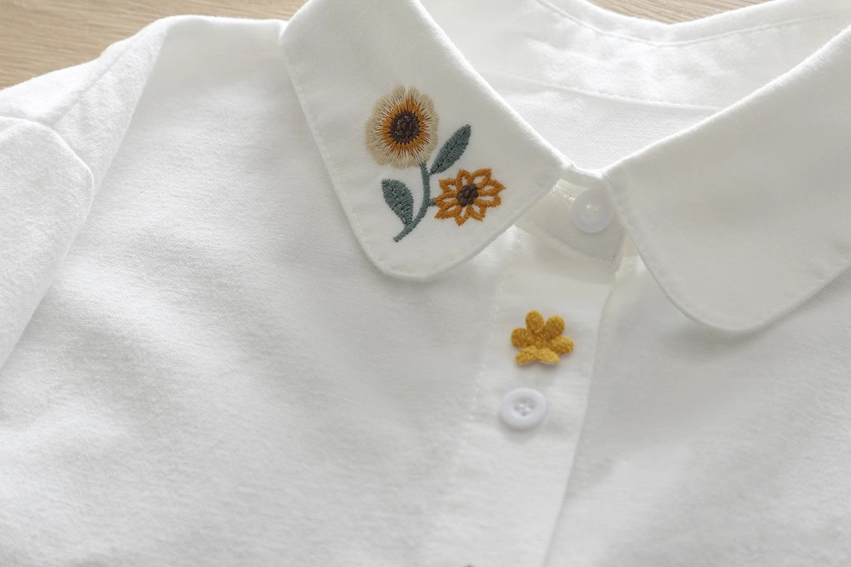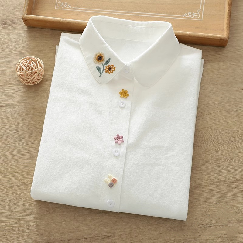 여성을위한 순수 코튼 긴팔 셔츠 봄, 가을 새로운 스타일 예술적 작은 신선한 해바라기 자수 대학 스타일 캐주얼 셔츠 탑