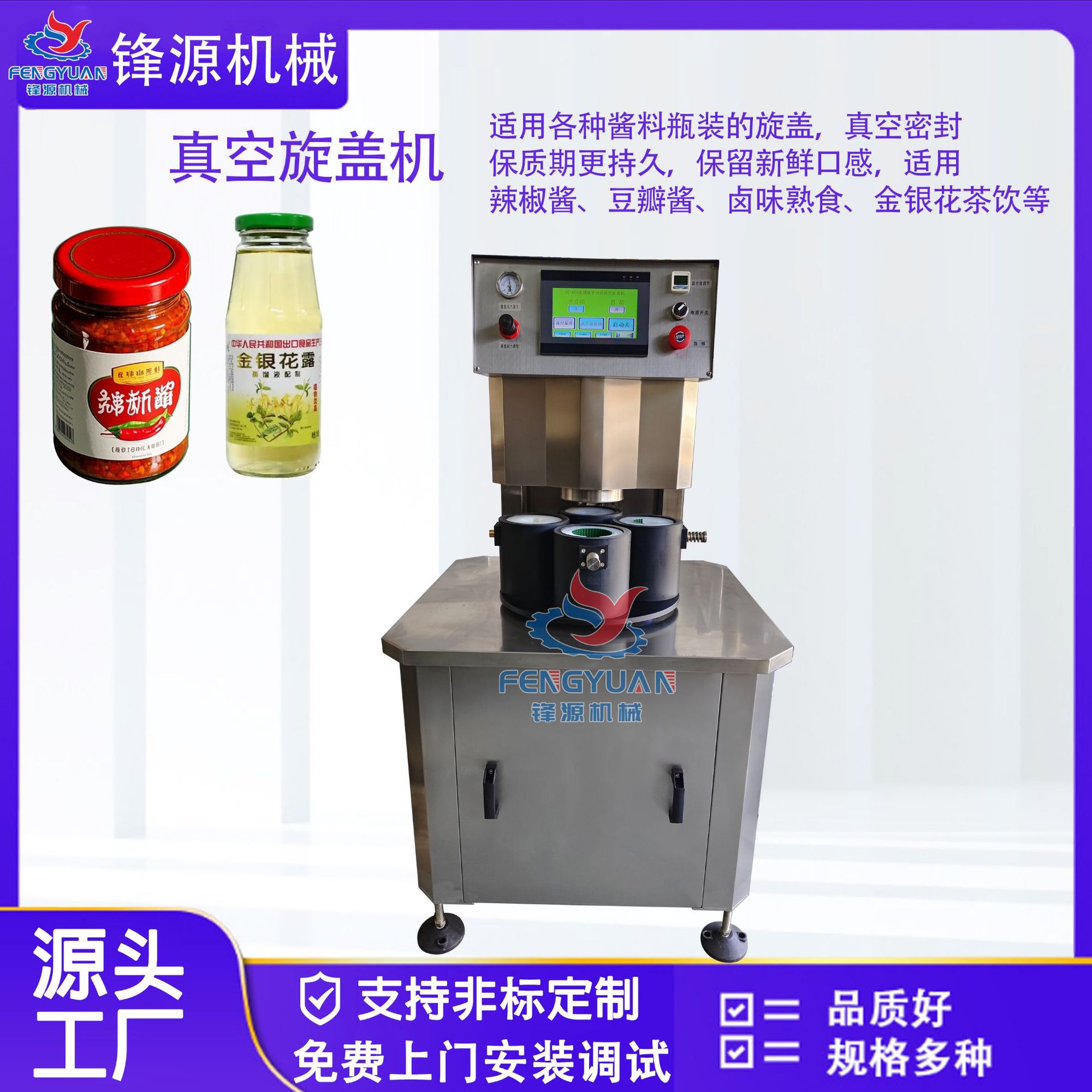 真空保鲜主要是食品处于真空气氛中,氧气很少,食品不易腐烂变质,又使用玻璃瓶封装,可免于于昆虫危害。同一般传统保险相比,食品保鲜程度及货架寿命高,这种包装手段对易碎、脆性食品特别有利,抽出包装容器中的气体不仅能抑制霉菌的生长,同时起到对外界挤压的缓冲作用。适用于市场上的各种产品:如辣椒酱,豆瓣酱,柱候酱,番茄酱,耗油,丰水梨,黄桃罐,果酱,果汁,饮料等的玻璃瓶装。真空旋盖采用马口铁盖,旋盖紧牢,密封效果好。