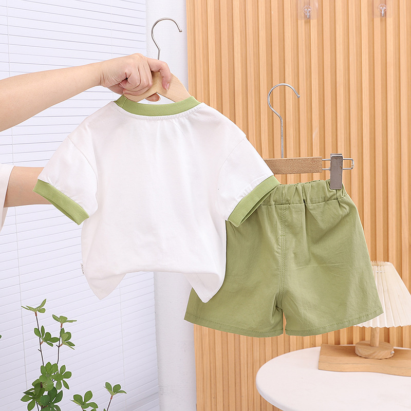 2025 아기 아기 여름 소년 세트 외국 스타일 버섯 귀여운 만화 짧은 소매 색상 일치하는 두 조각 도매