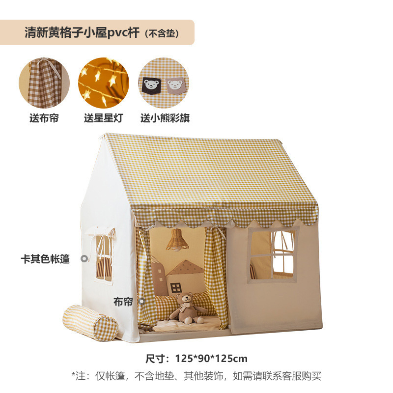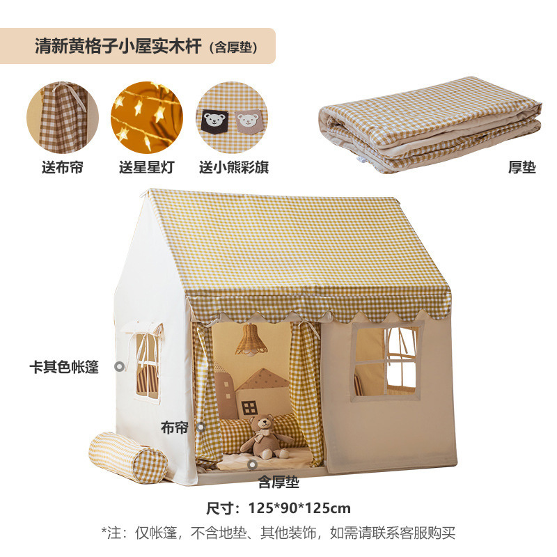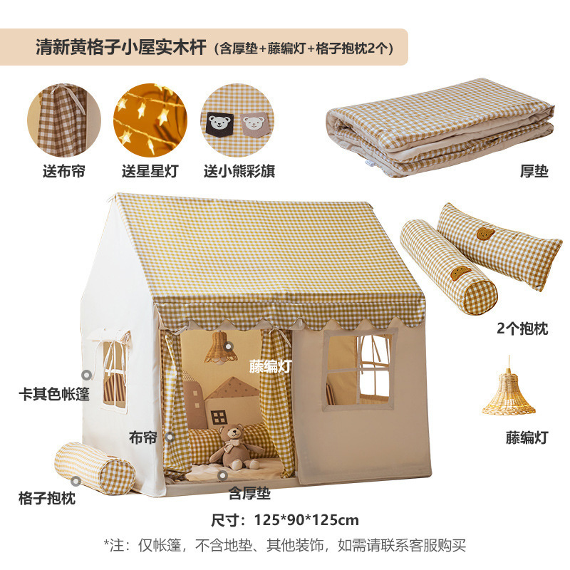 • 신선한 노란색 격자 캐빈 단단한 나무 기둥 - 두꺼운 쿠션 포함 [천 커튼 + 별 램프 + 곰 색상