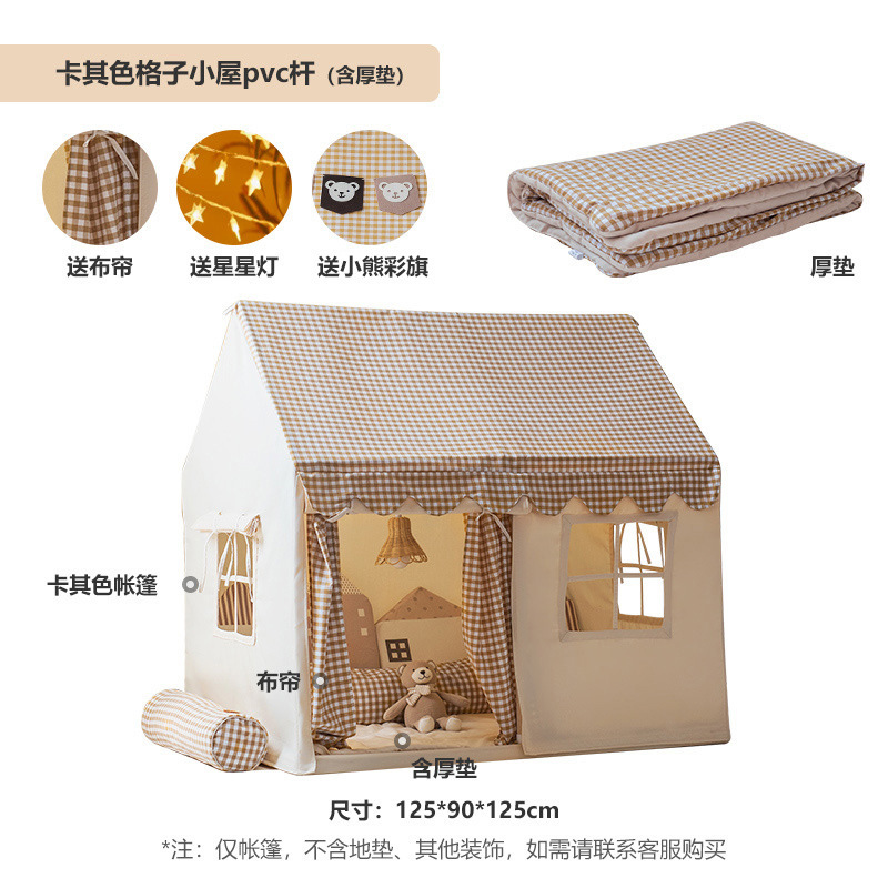 • 카키 체크 무늬 캐빈 PVC 폴 - 두꺼운 쿠션 포함 [천 커튼 + 별빛 + 곰 깃발 포함