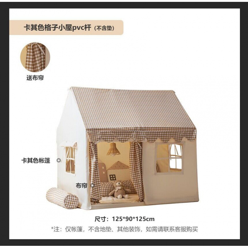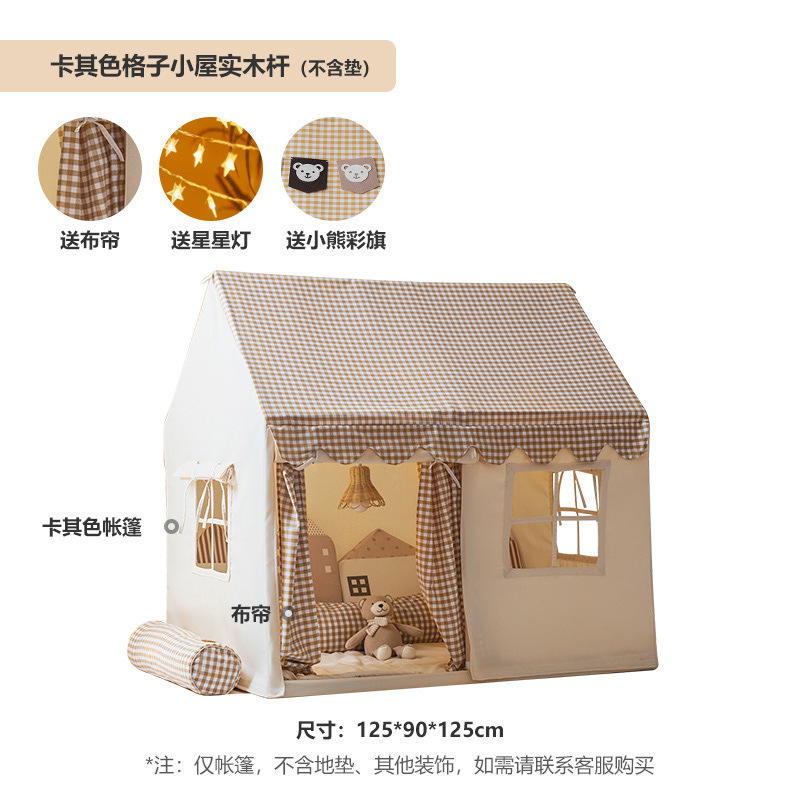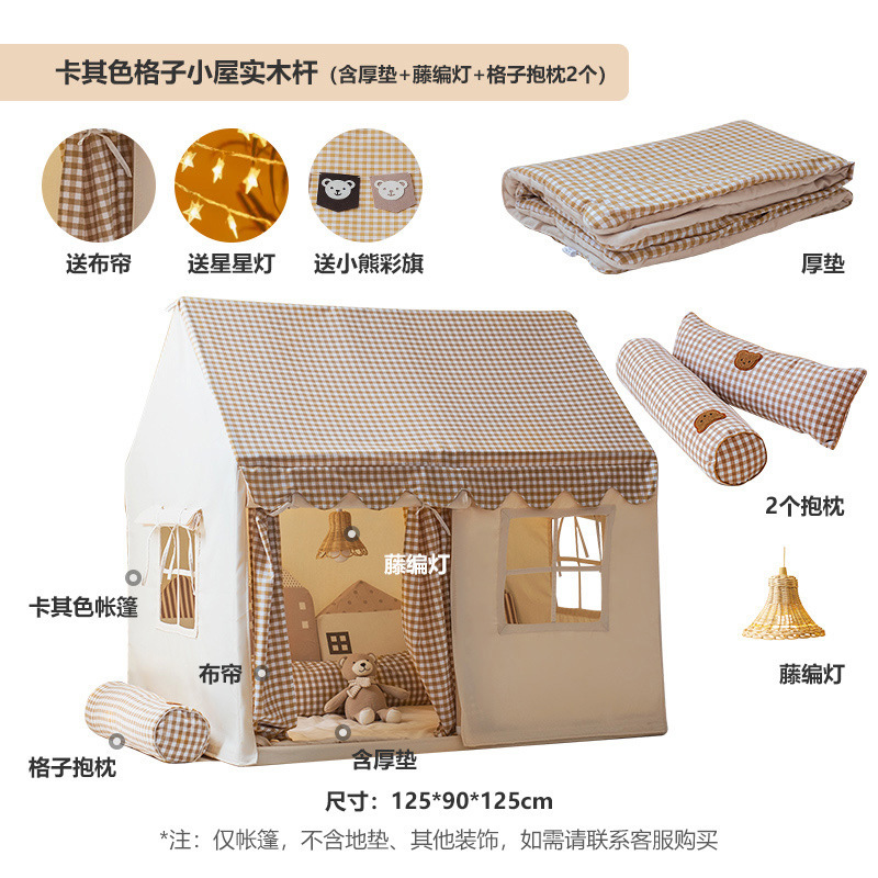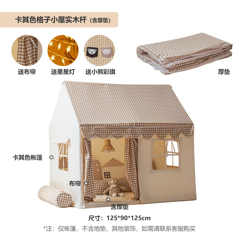 • 카키 체크 무늬 캐빈 원목 폴 - 두꺼운 쿠션 포함 [천 커튼 + 별빛 + 곰 색상 포함]