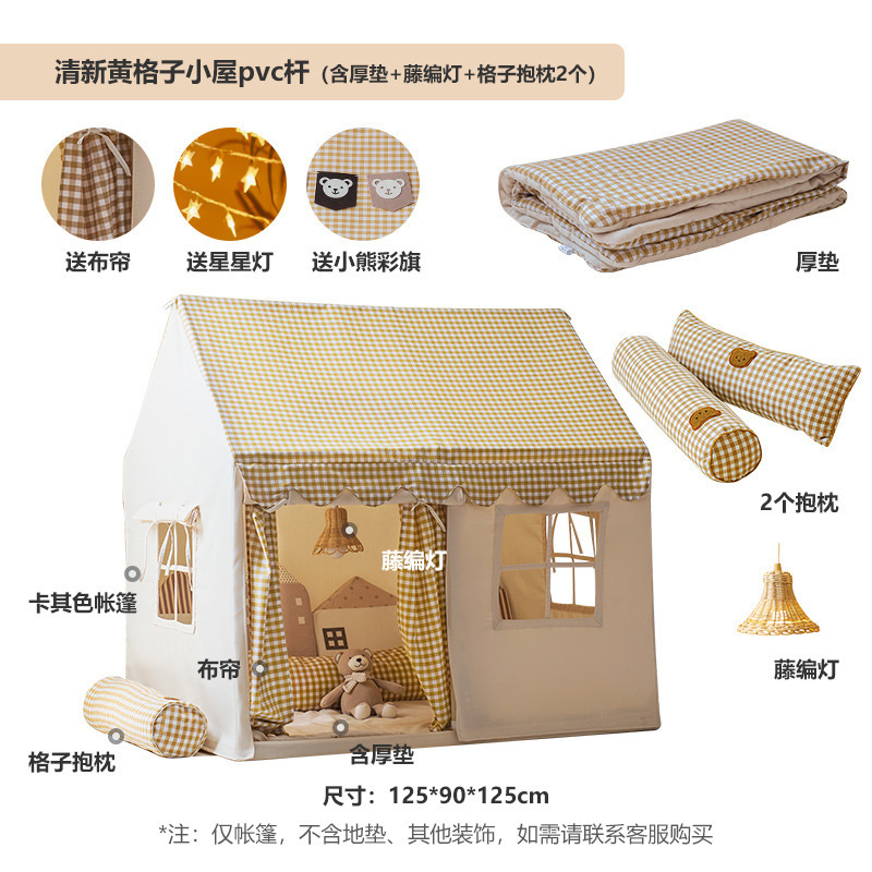 • 신선한 노란색 격자 무늬 캐빈 PVC 기둥 - 두꺼운 매트 포함 [천 커튼 + 별 램프 + 곰 다채로운 깃발