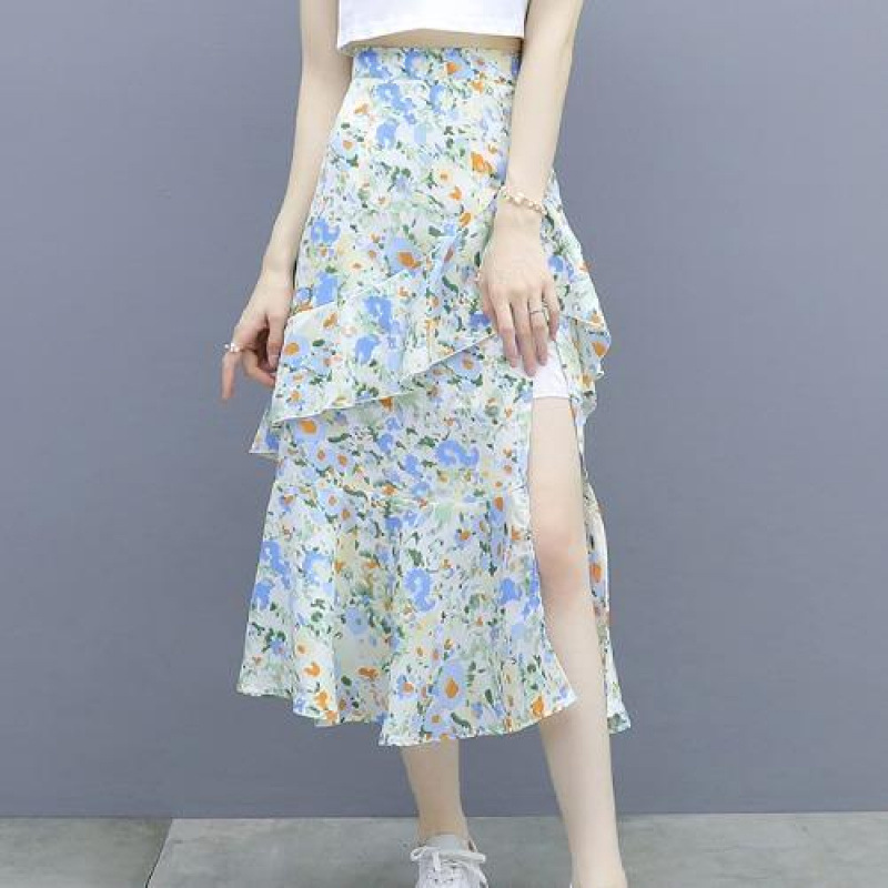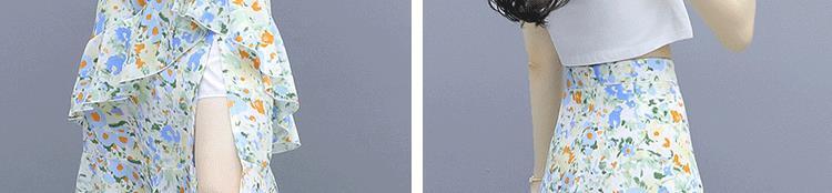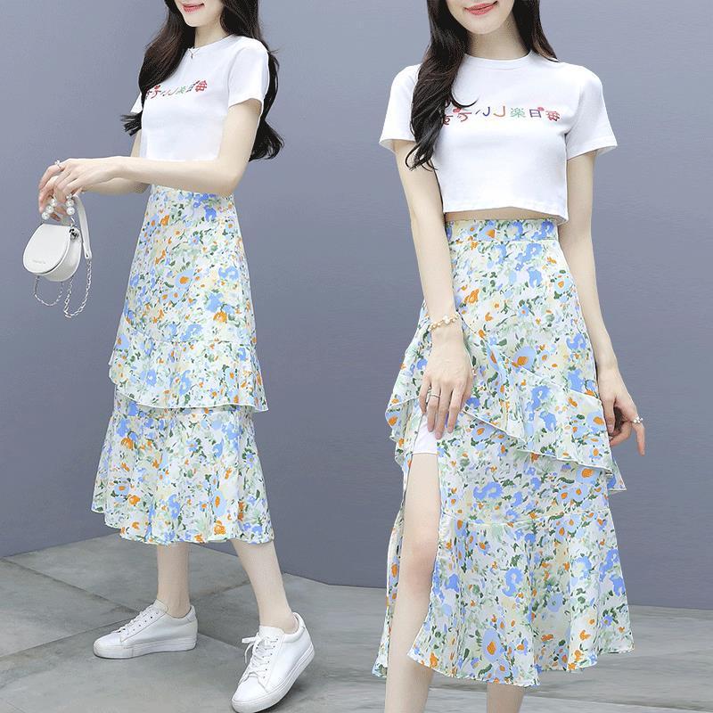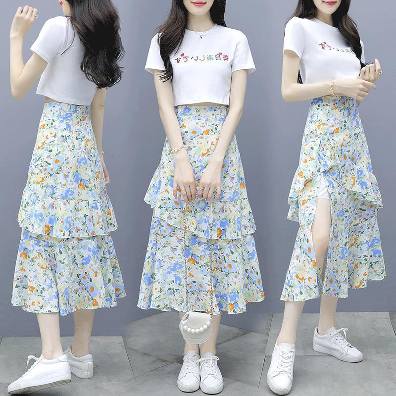 올해 인기있는 원피스 투피스 여성 여름 2024 작은 세련된 아름다운 꽃 반 길이 스커트 세트