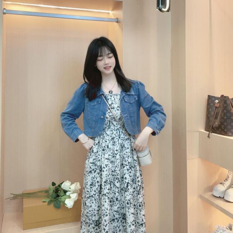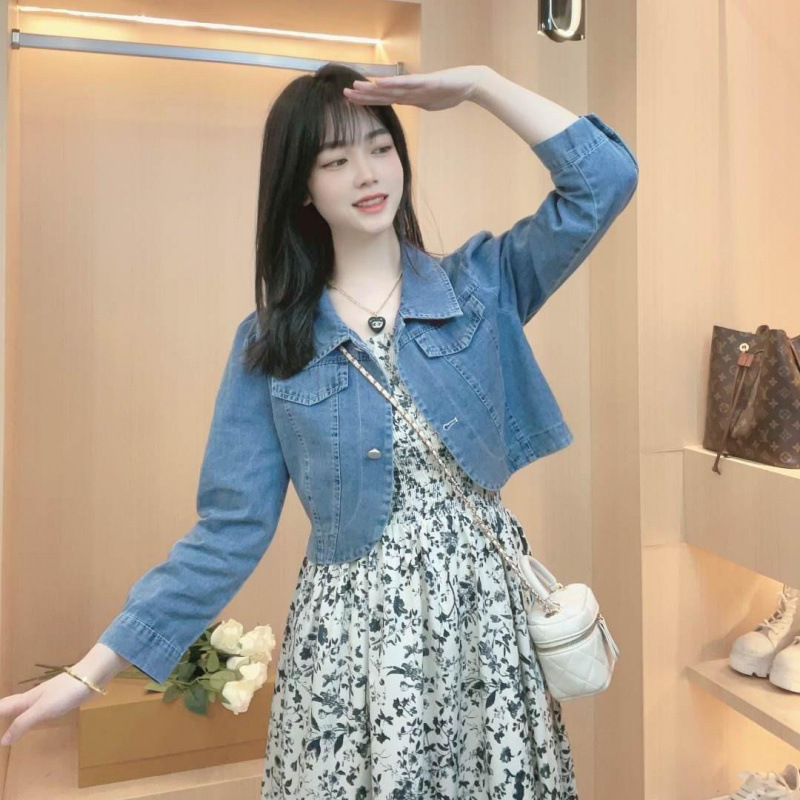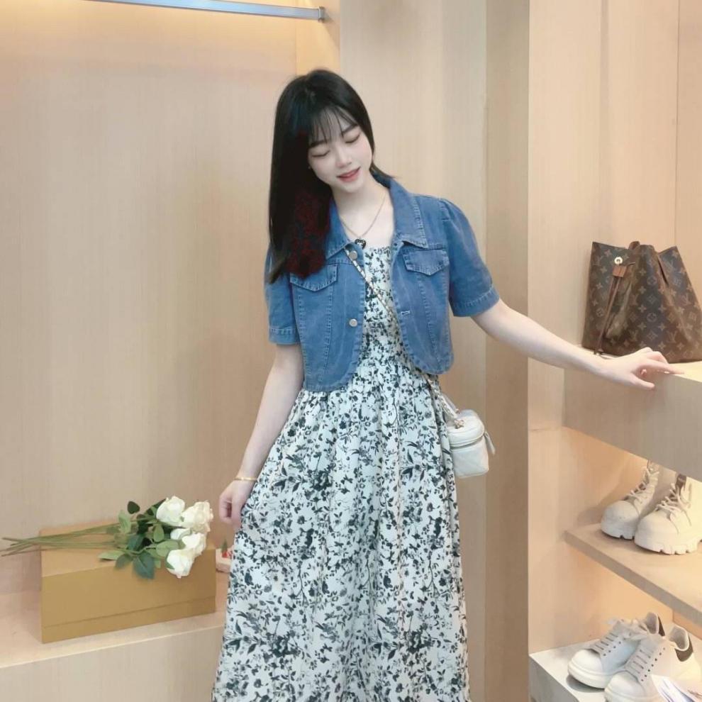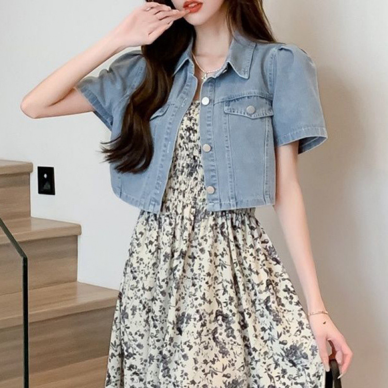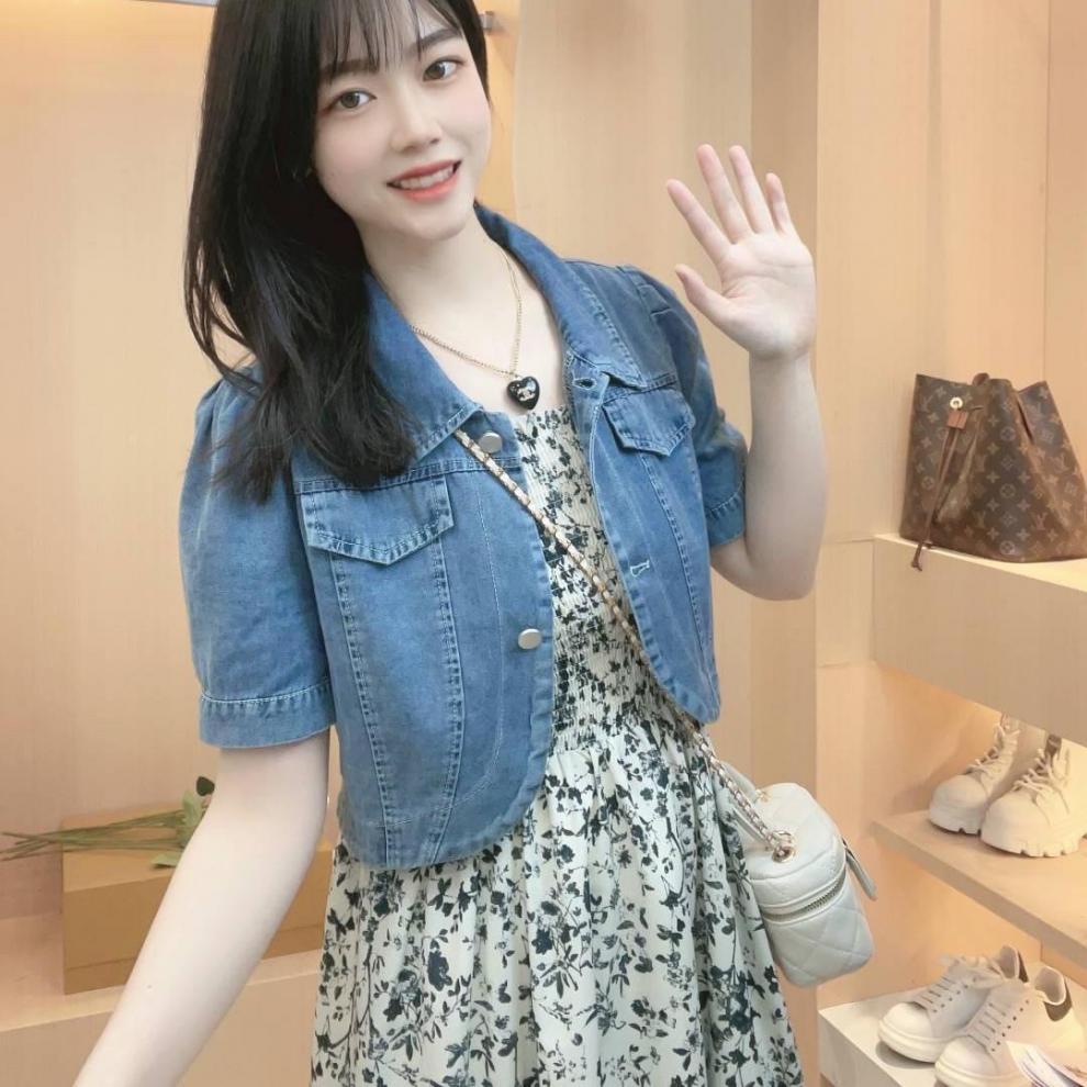 짧은 데님 꽃 스커트 투피스 세트 여성의 얇은 2024 여름 새 데님 반소매 재킷 스커트 세트스토어 가기