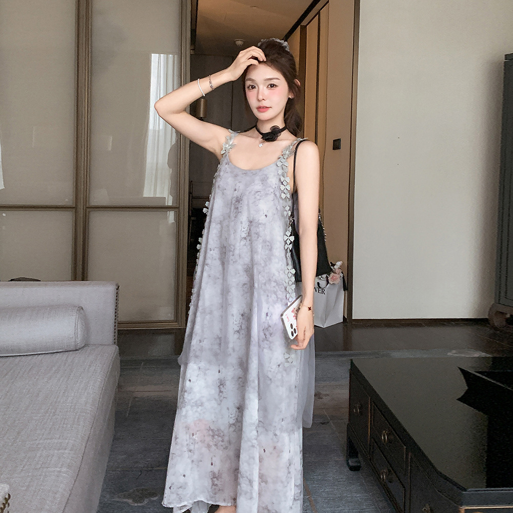 2025 년 새로운 달콤한 잉크 나비 어깨 스트랩 긴 원피스 인쇄 된 실시간 프랑스 시대 감소 색상 매칭 원피스