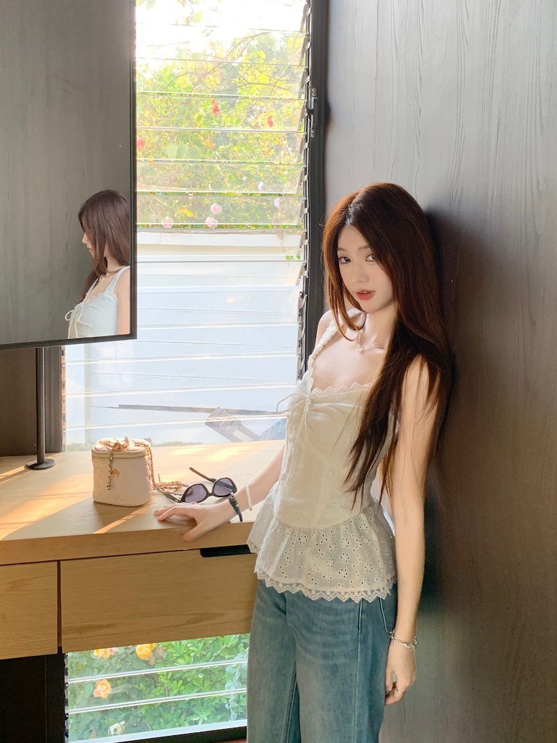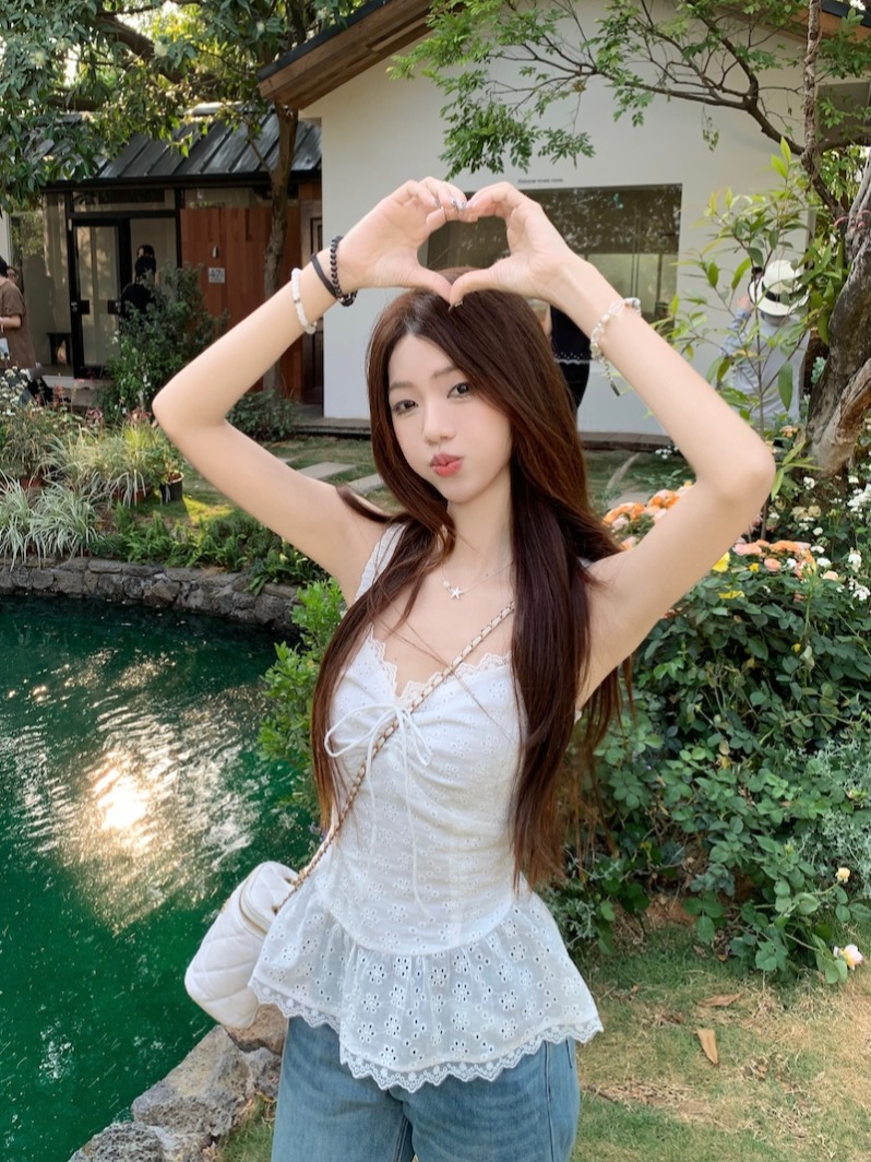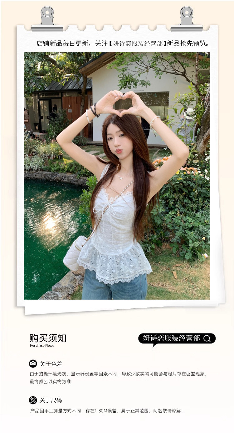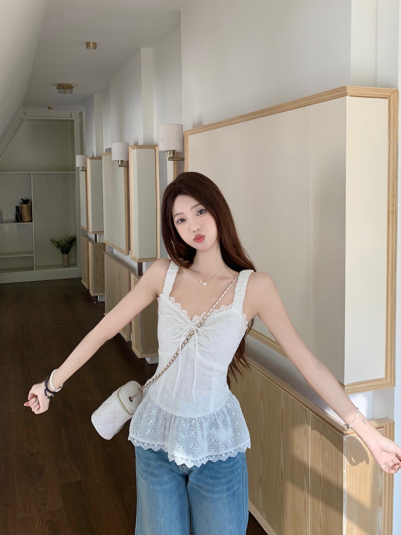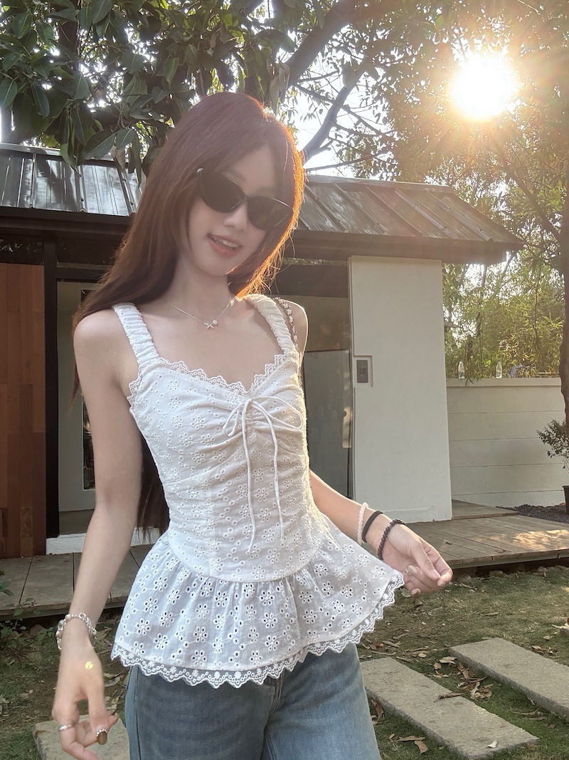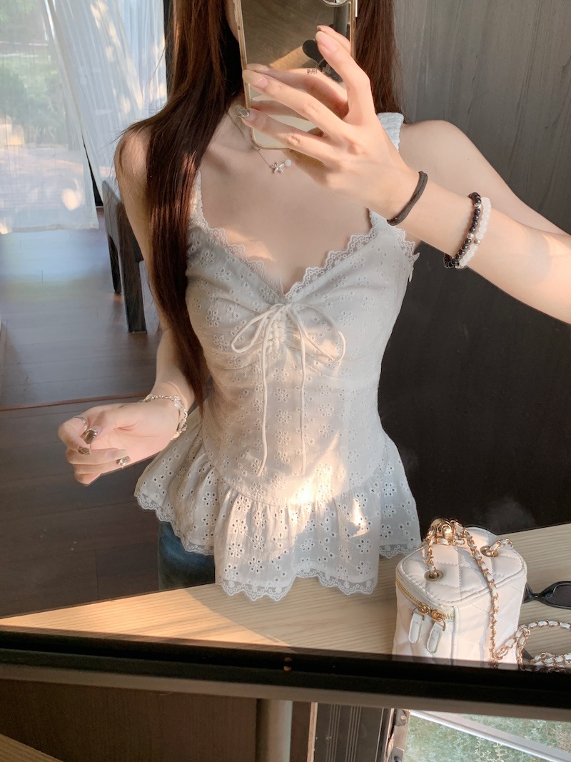 달콤한 스파이스 스타일 레이스 바느질 카미솔 여성 여름 새로운 한국 스타일 슬림핏 슬림핏 화이트 탑스토어 가기