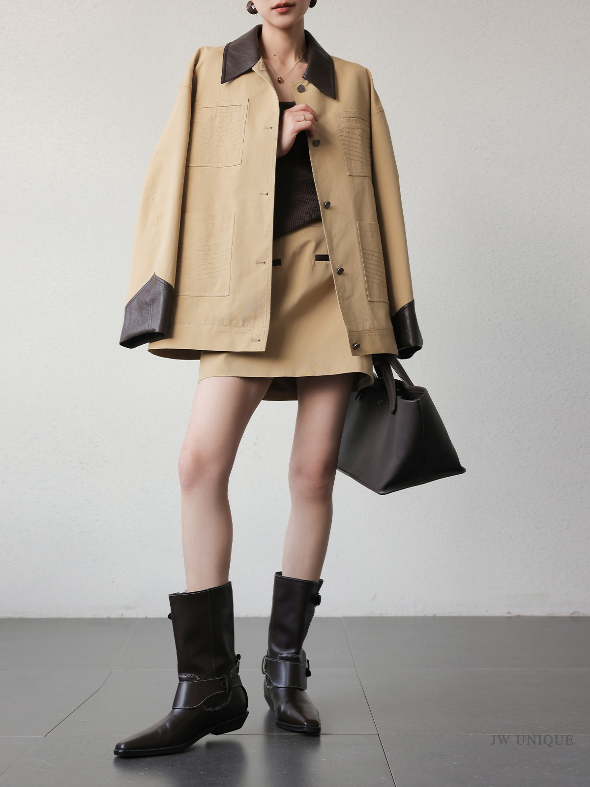 프리세일 카키색 디자인 패치워크 재킷 여성용 초봄 신상 POLO 칼라 재킷 상의스토어 가기