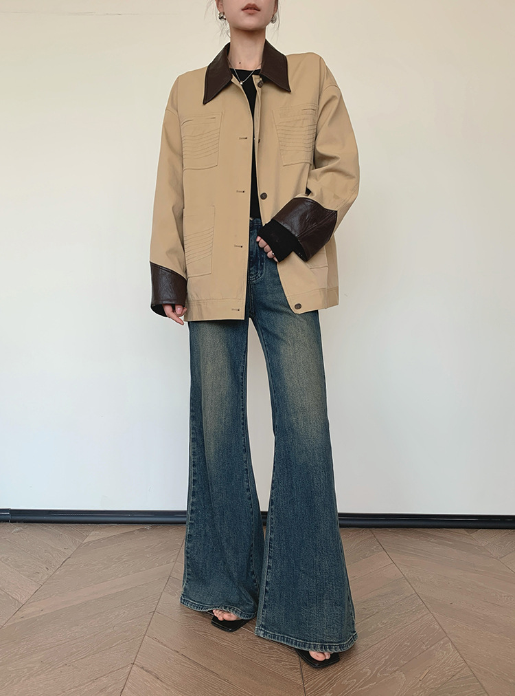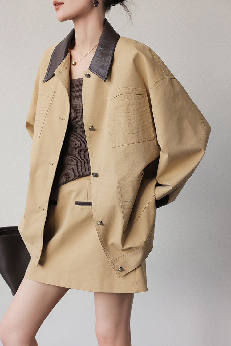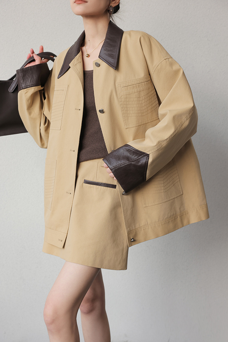 프리세일 카키색 디자인 패치워크 재킷 여성용 초봄 신상 POLO 칼라 재킷 상의