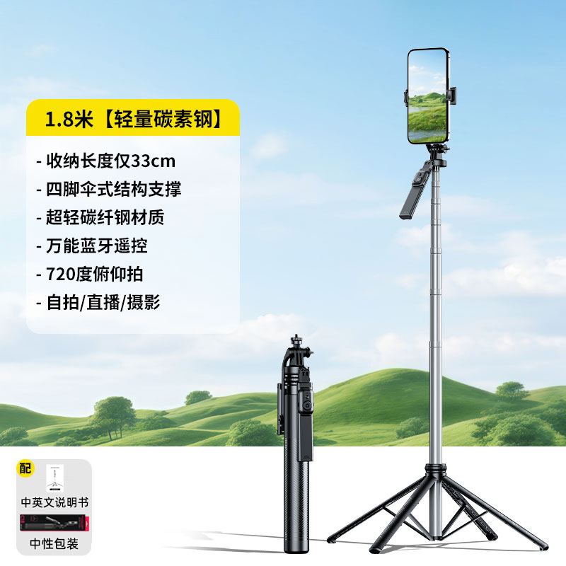 • [C18-블랙-1.8m] 알루미늄 합금 폴 + 밸런스 핸들 + 테트라포드 + 블루투스 리모컨 + 1/4 커넥터 + 탈착식 클립