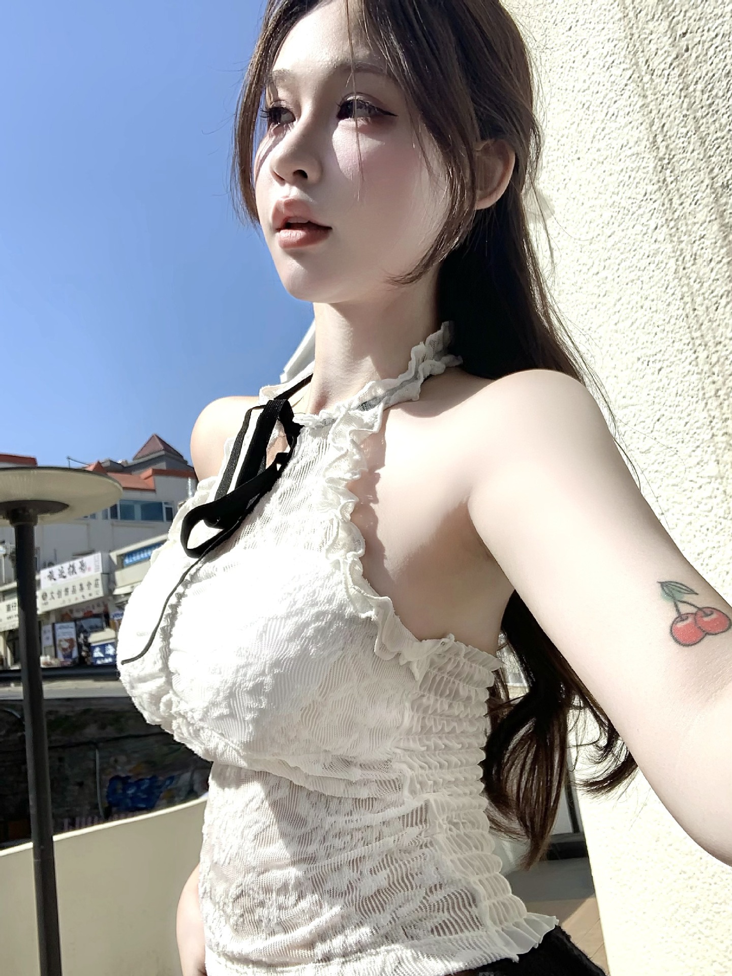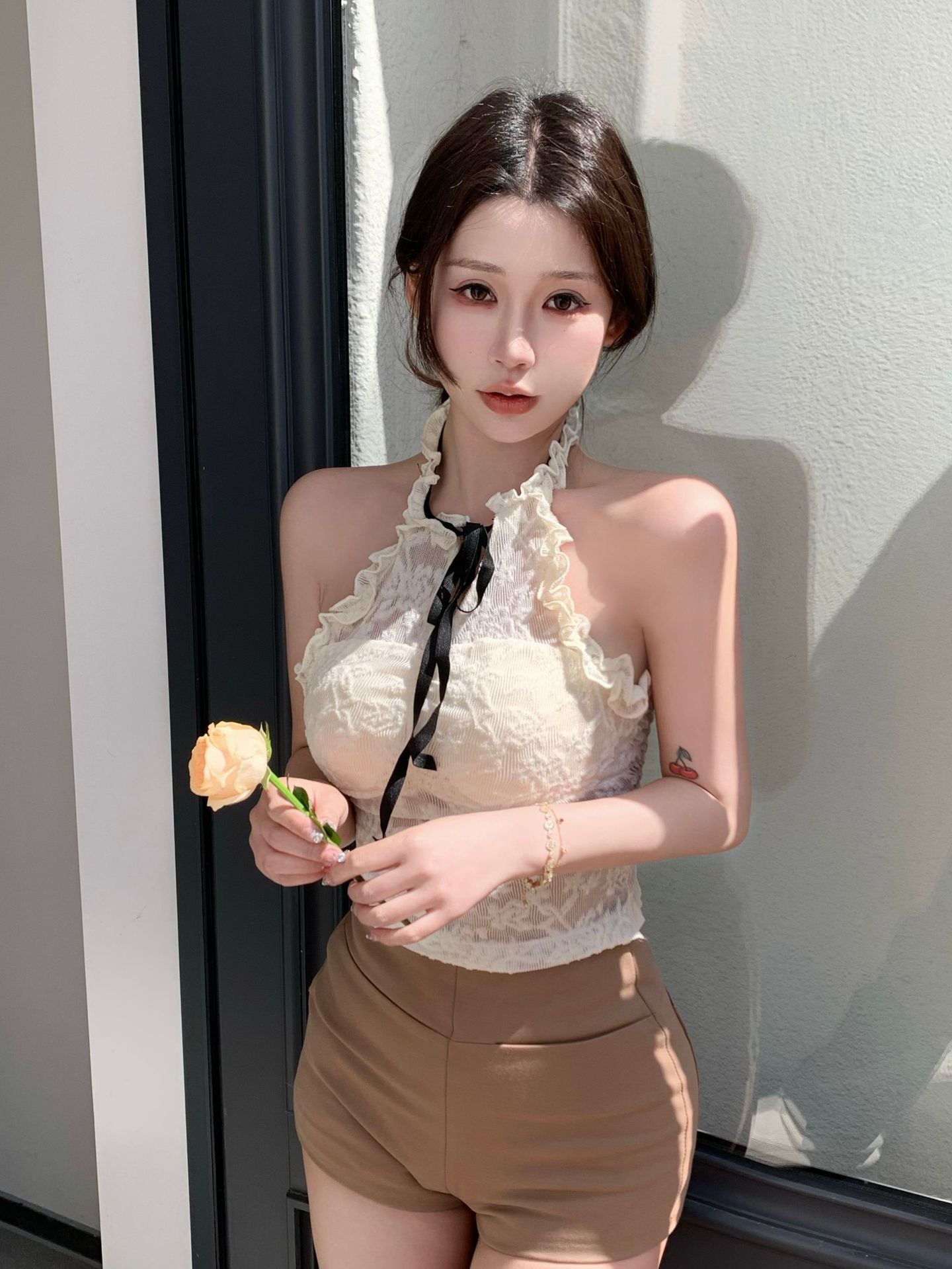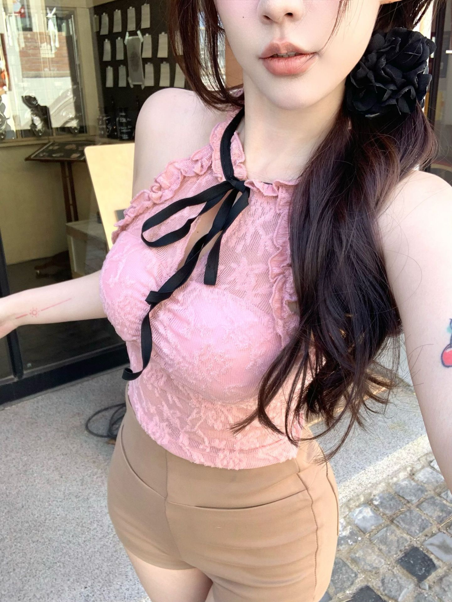 핫걸 퓨어 러스티 홀터넥 레이스 스트랩 캐미솔 쇼트 메쉬 탑 슬림핏 백리스 튜브탑 트렌디스토어 가기
