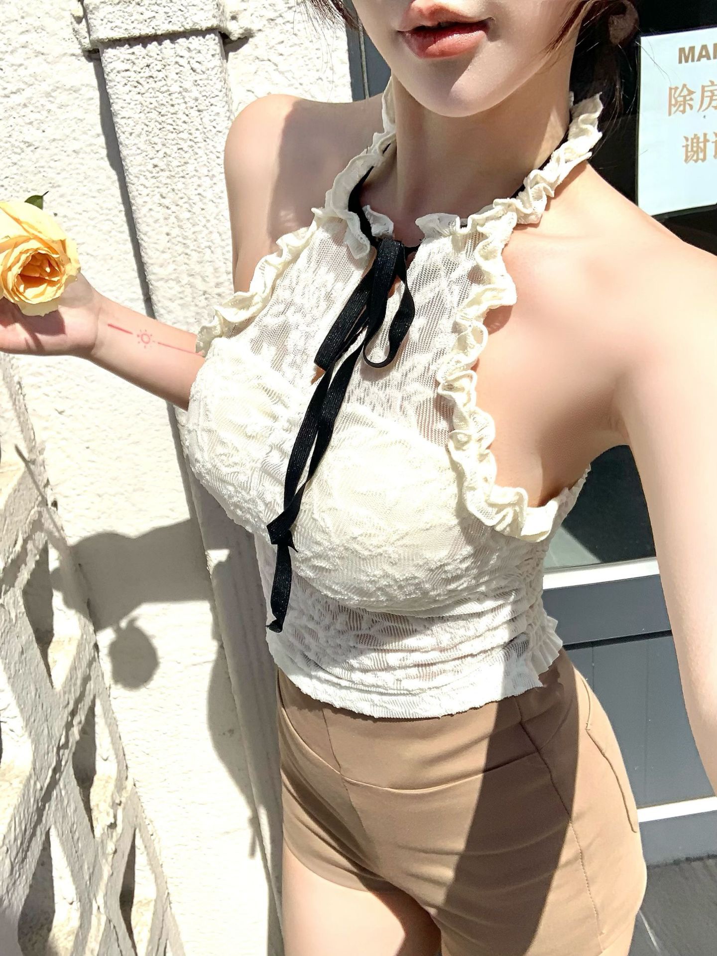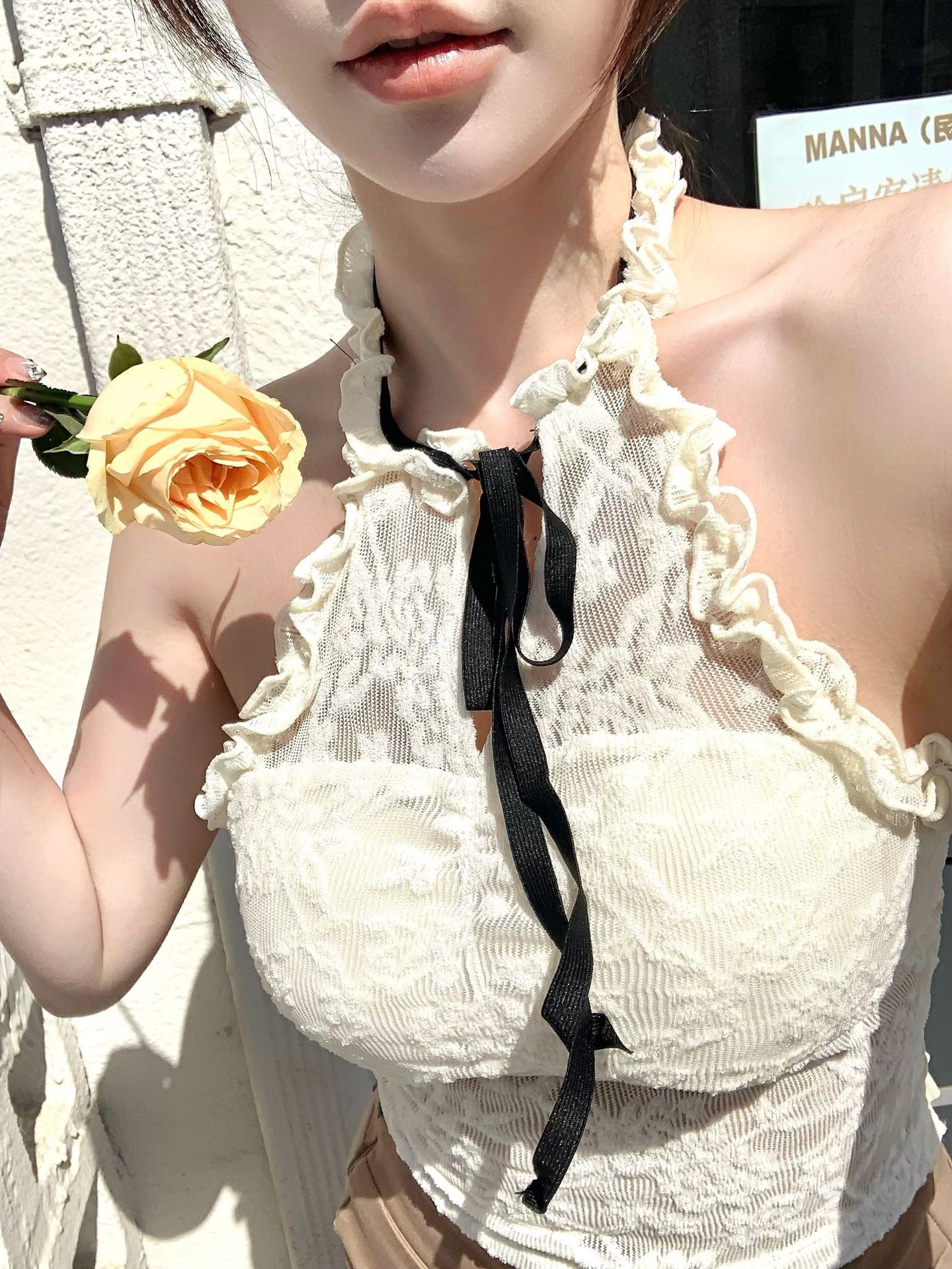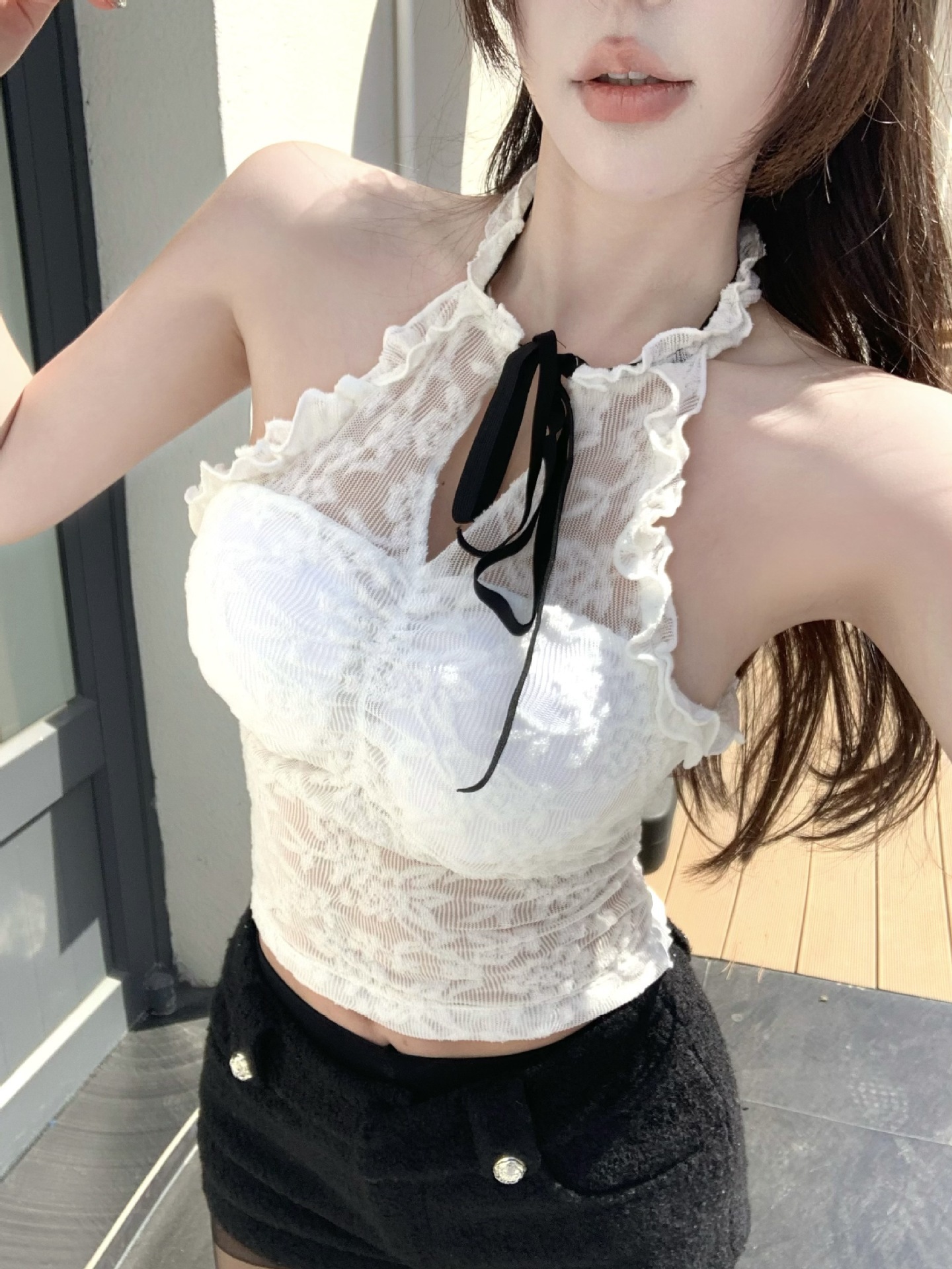 핫걸 퓨어 러스티 홀터넥 레이스 스트랩 캐미솔 쇼트 메쉬 탑 슬림핏 백리스 튜브탑 트렌디