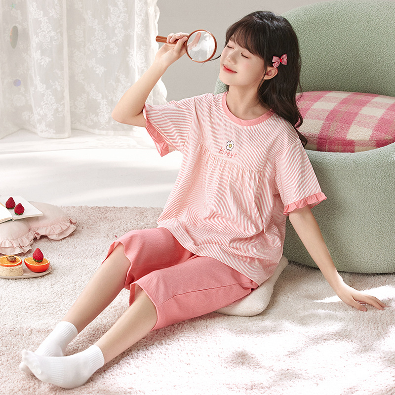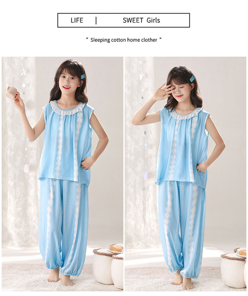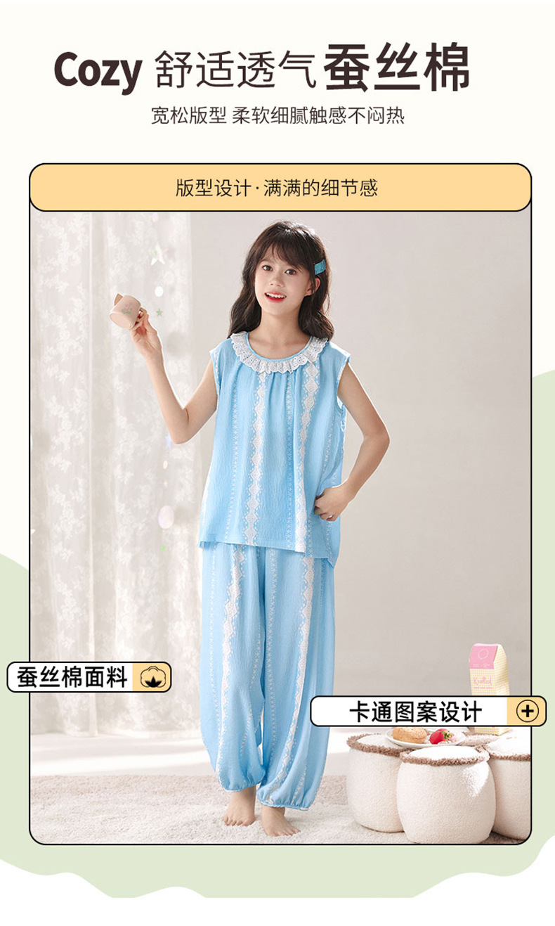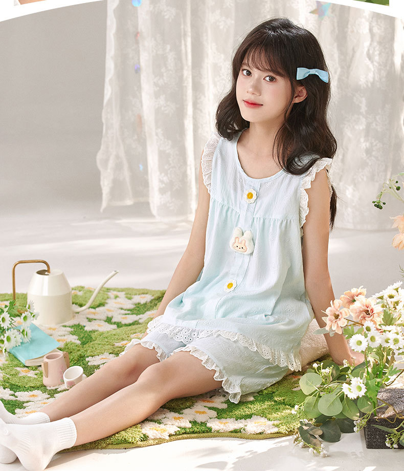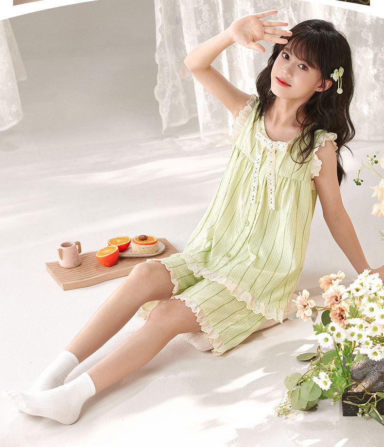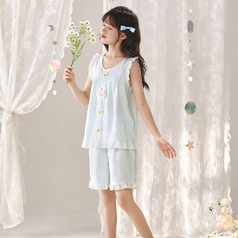 어린이 잠옷 여름 실크 면 얇은 풀오버 달콤하고 귀여운 공주 스타일 소형, 중형 및 대형 소녀 홈웨어 세트