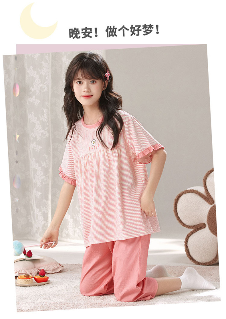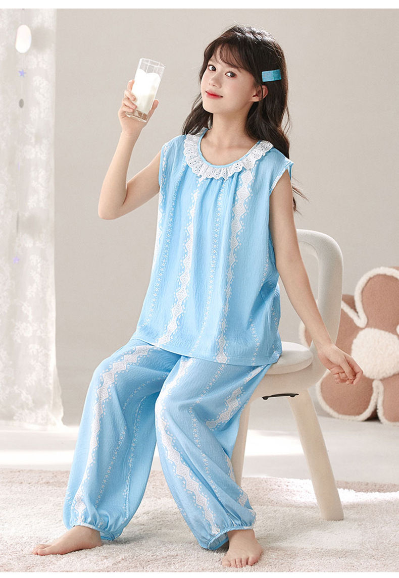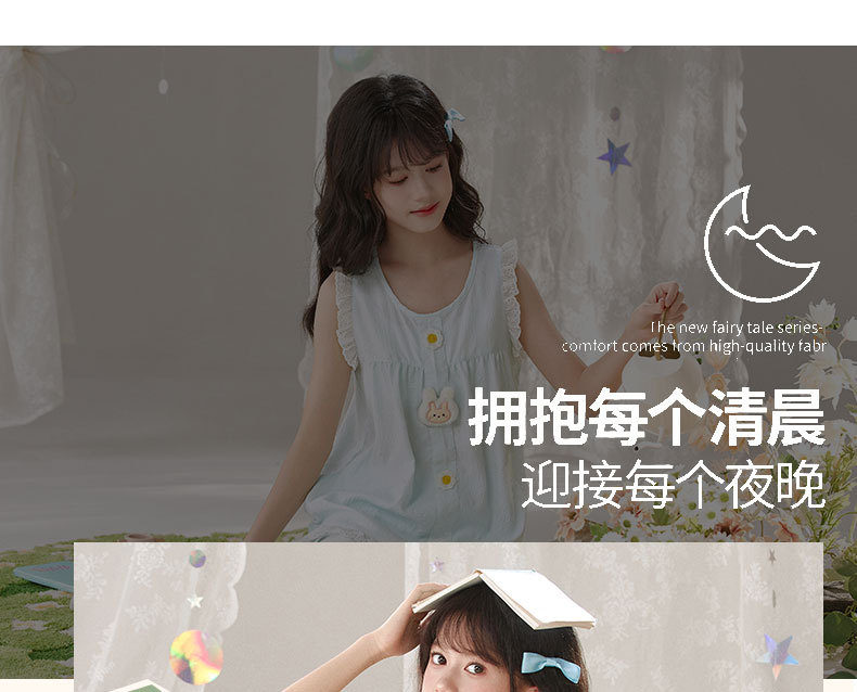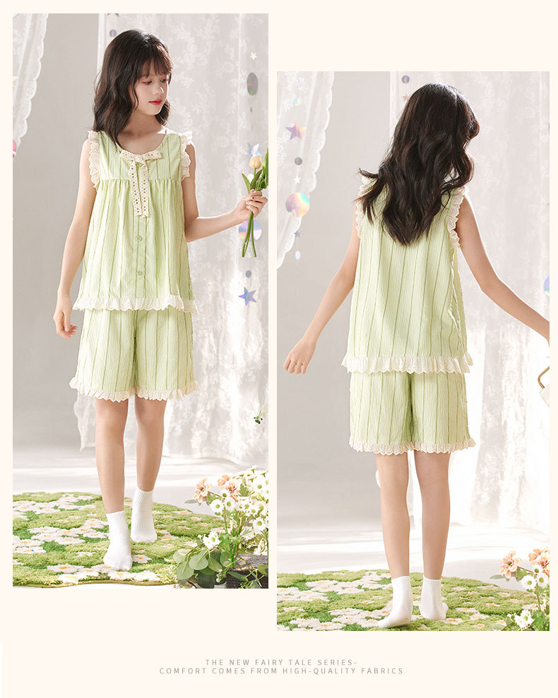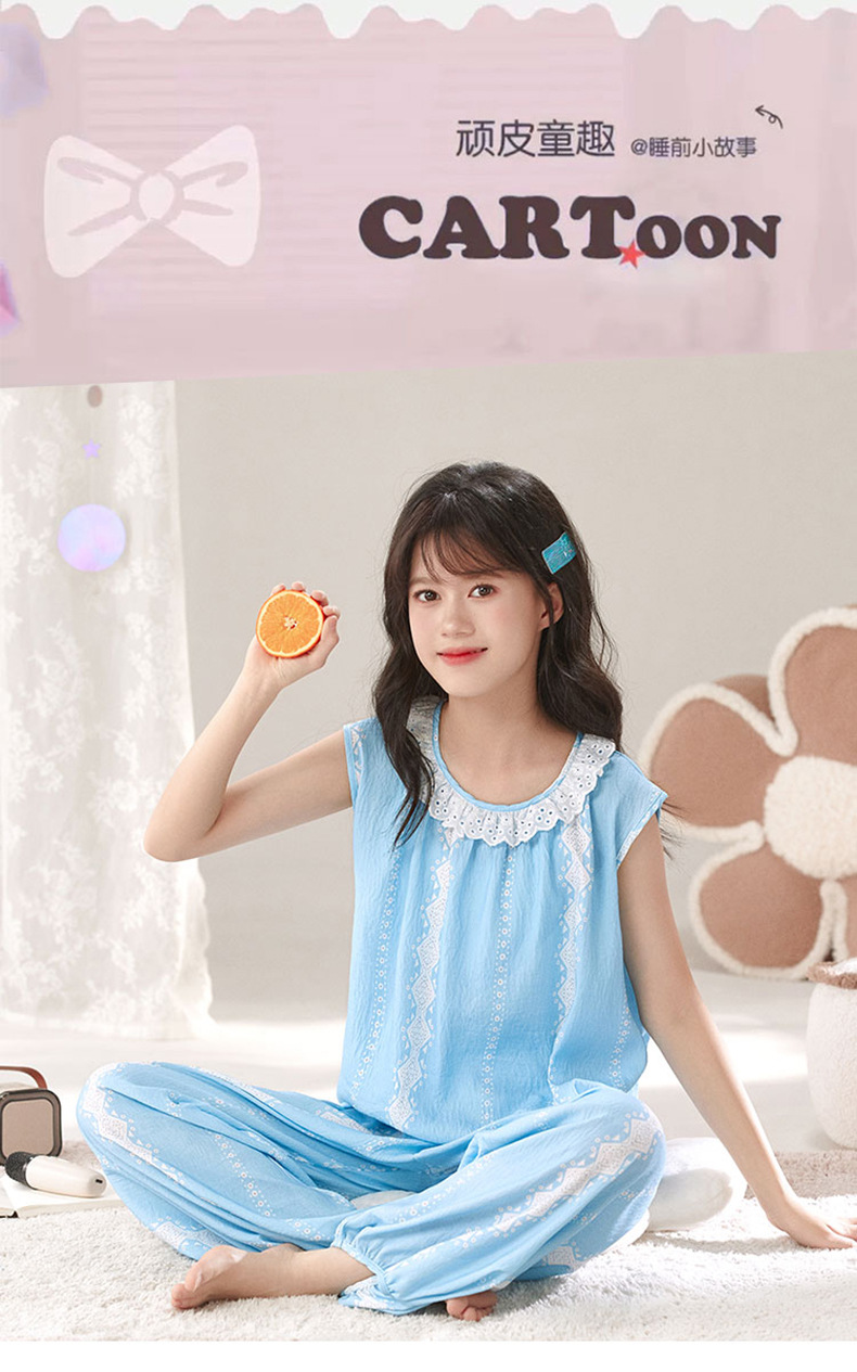 어린이 잠옷 여름 실크 면 얇은 풀오버 달콤하고 귀여운 공주 스타일 소형, 중형 및 대형 소녀 홈웨어 세트