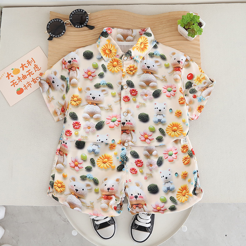 2025 어린이 새로운 반팔 양복 남성과 여성의 아기 꽃 셔츠 얇은 만화 귀여운 투피스 세트