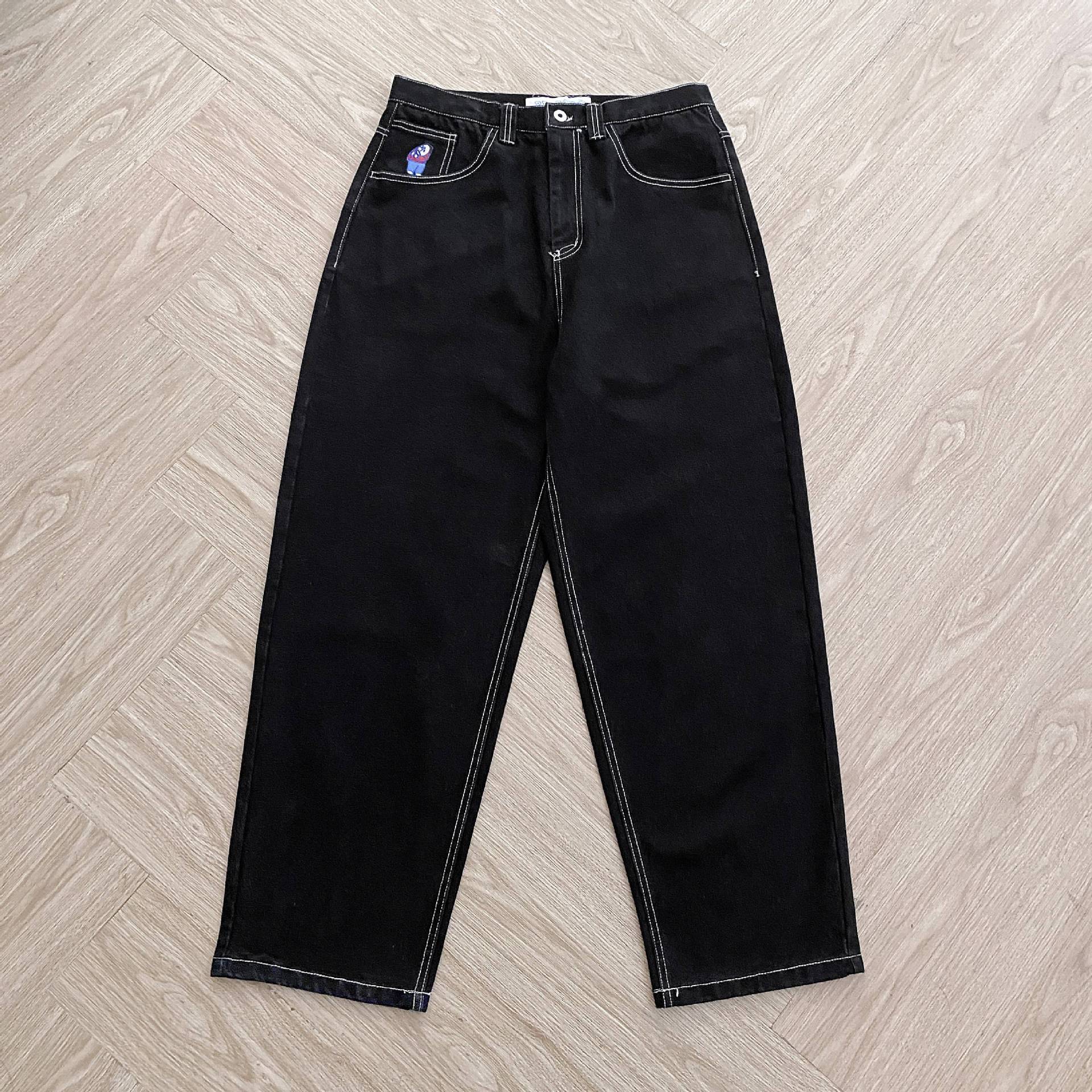 유럽과 미국의 스트리트 빅보이 스케이트 보드 바지 하라주쿠 힙합 만화 패턴 수 놓은 남성과 여성의 느슨한 청바지