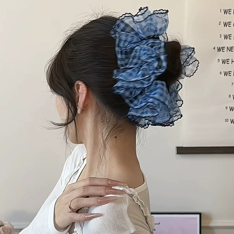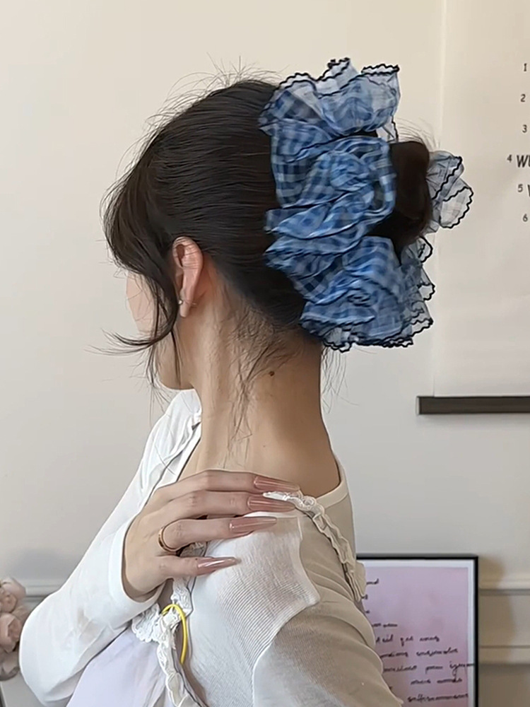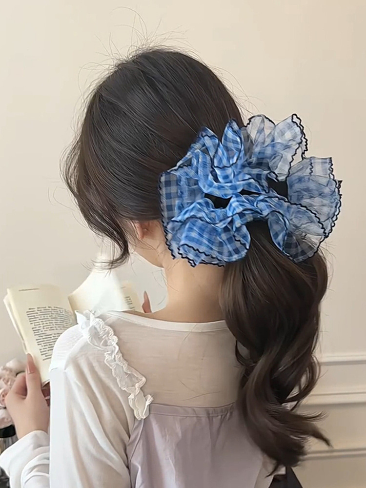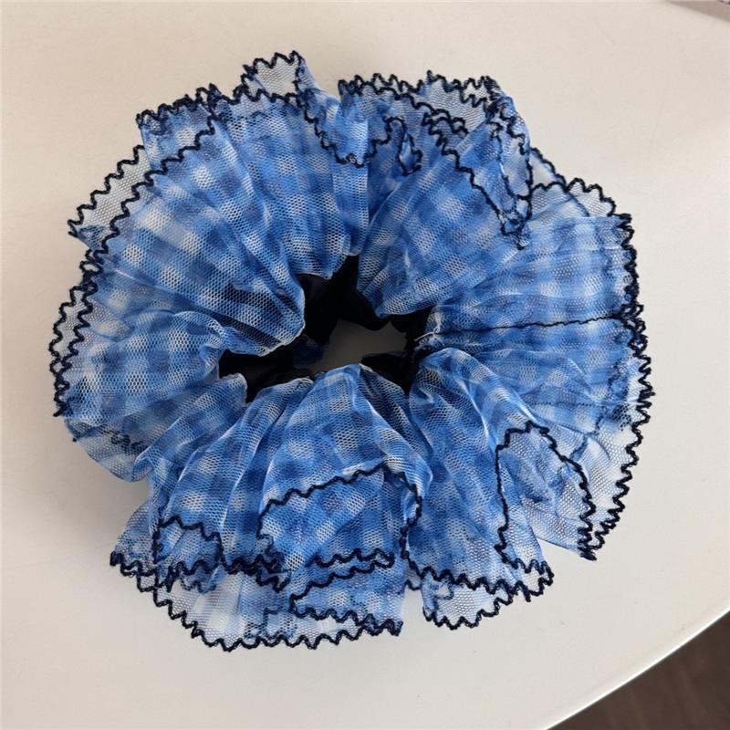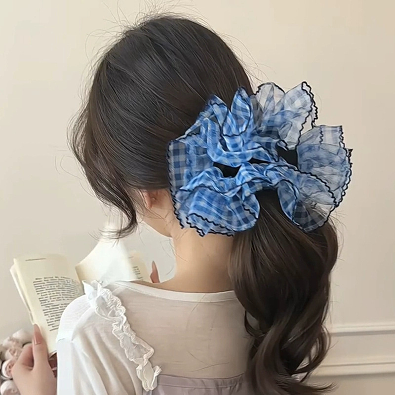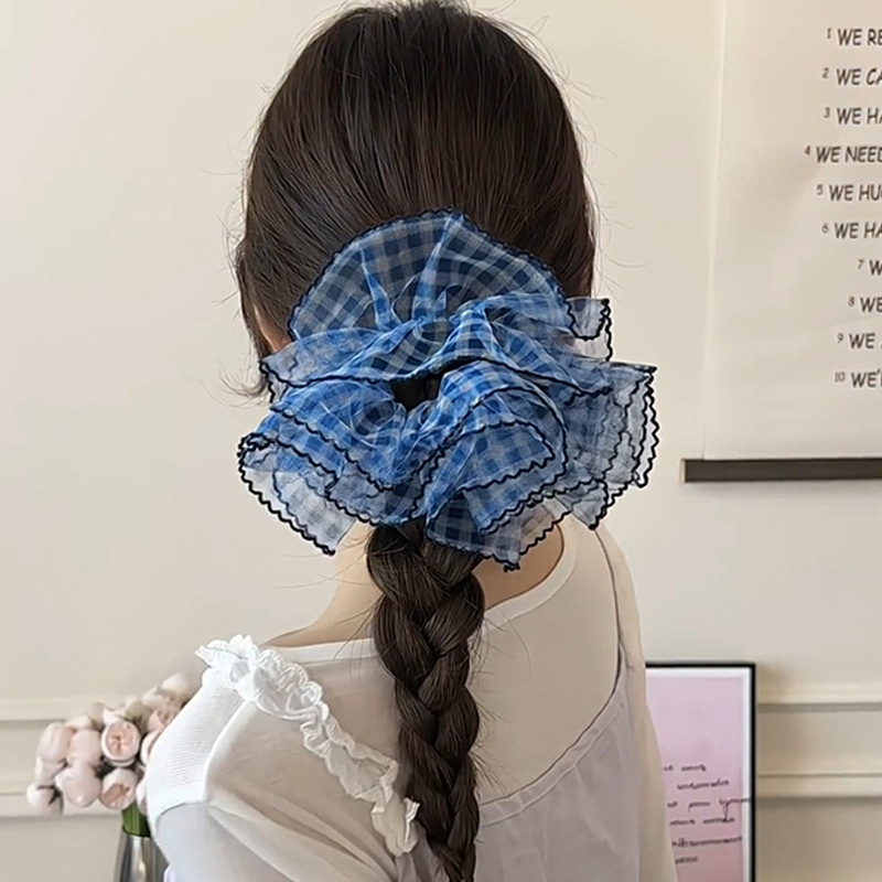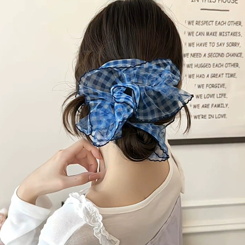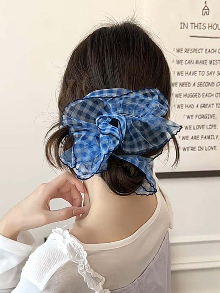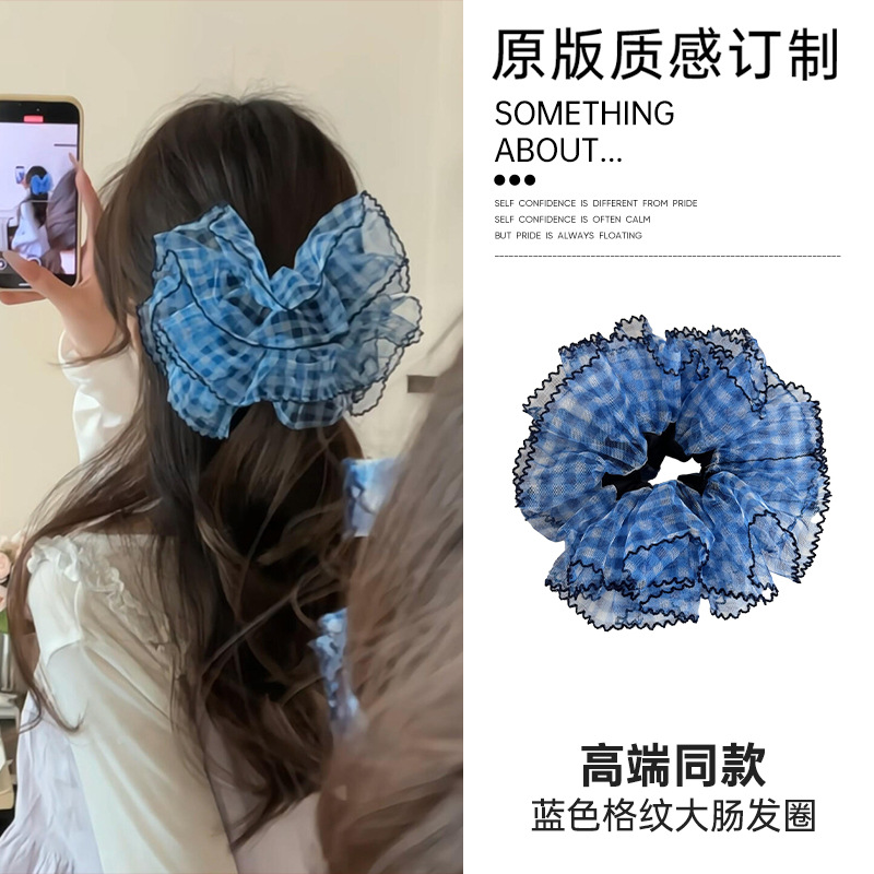 높은 고정 블루 체크 대장 헤어 링 여성의 하이 엔드 센스 원사 헤드 스트링 2025 새로운 하이 엔드 헤어 로프 헤드 드레스스토어 가기