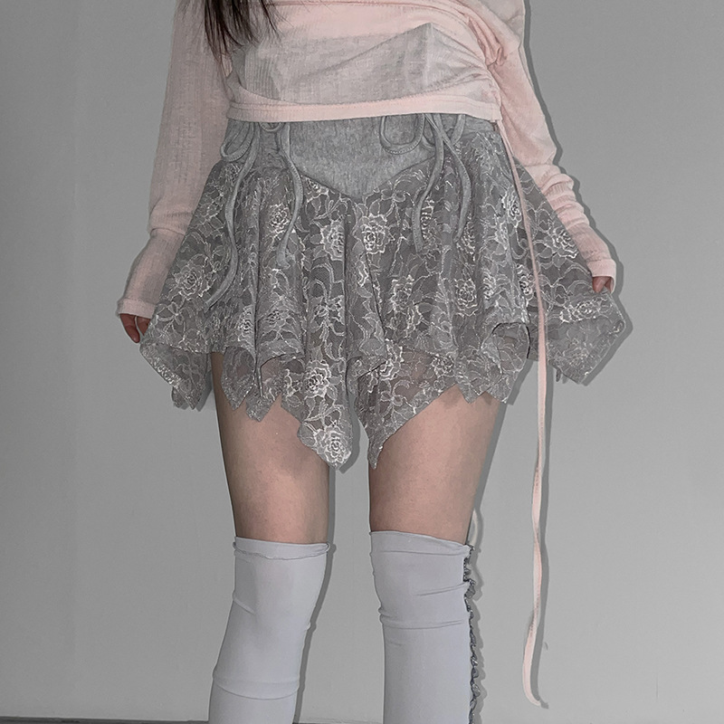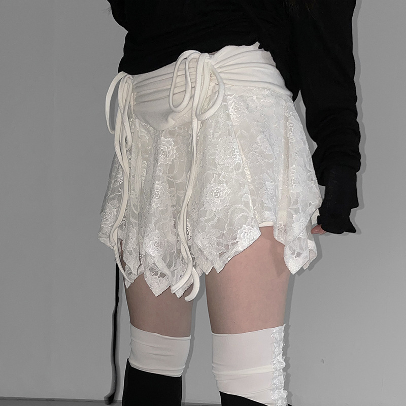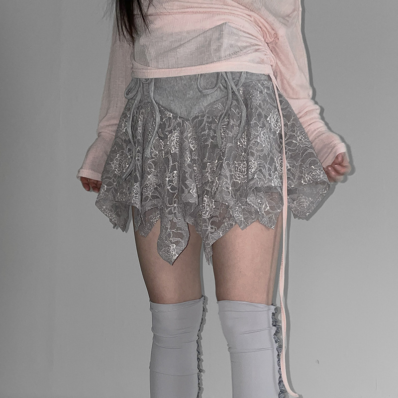 여성스러운 레이스 스플라이싱 불규칙 드로스트링 보우 스커트, 달콤하고 활용도가 높은 하이웨이스트 슬리밍 미니 스커트