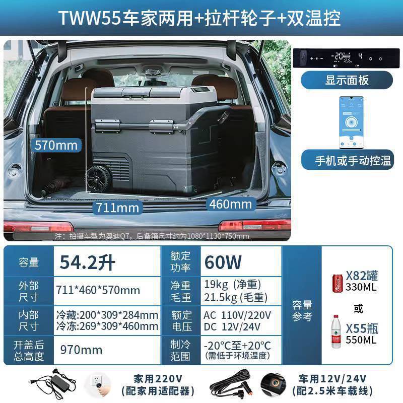 • TAW55 리터 자동차 홈 이중 목적 + 이중 온도 및 이중 제어 + 플러그인 리튬 배터리 + 당김 막대 휠 + APP