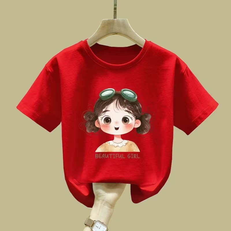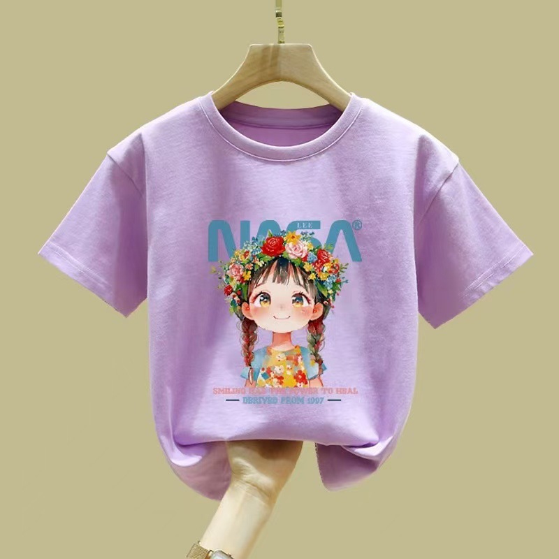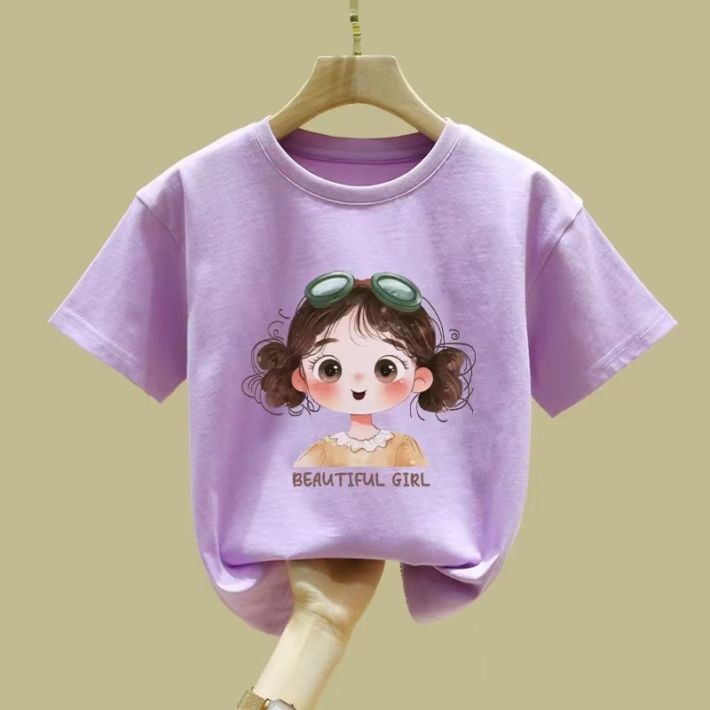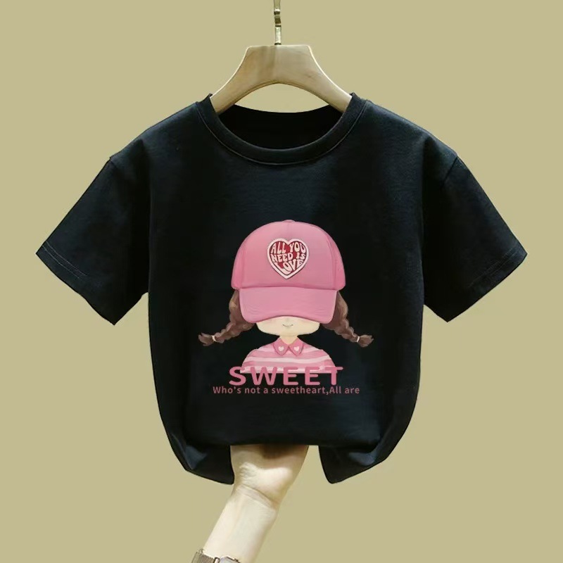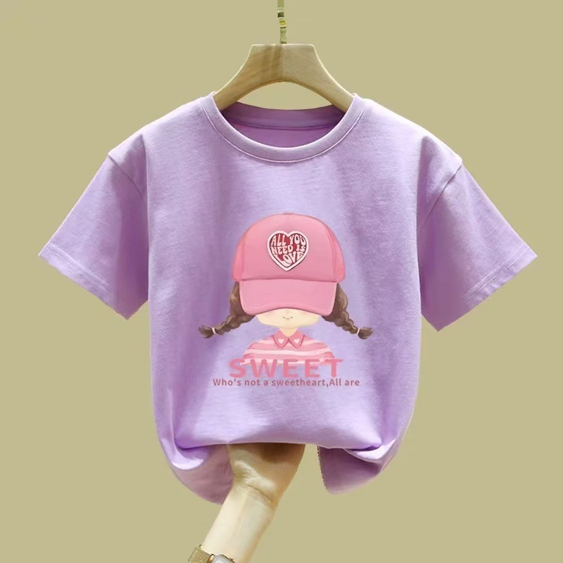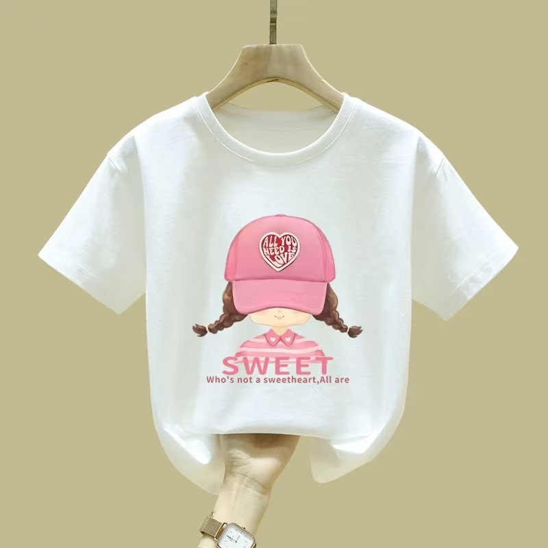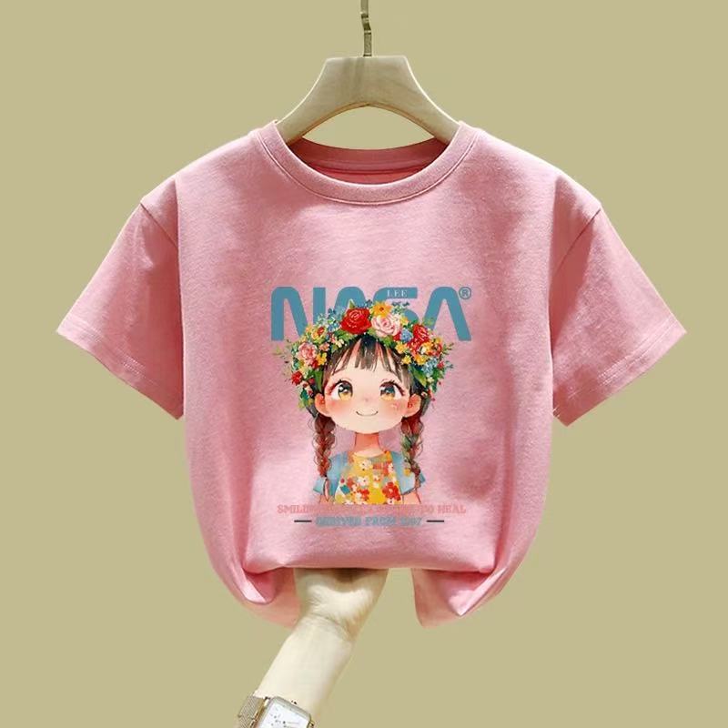 핑크 반소매 걸즈 티셔츠 퓨어 코튼 2025 새로운 중대형 어린이 라운드 넥 반소매 여름 어린이 탑 티셔츠스토어 가기