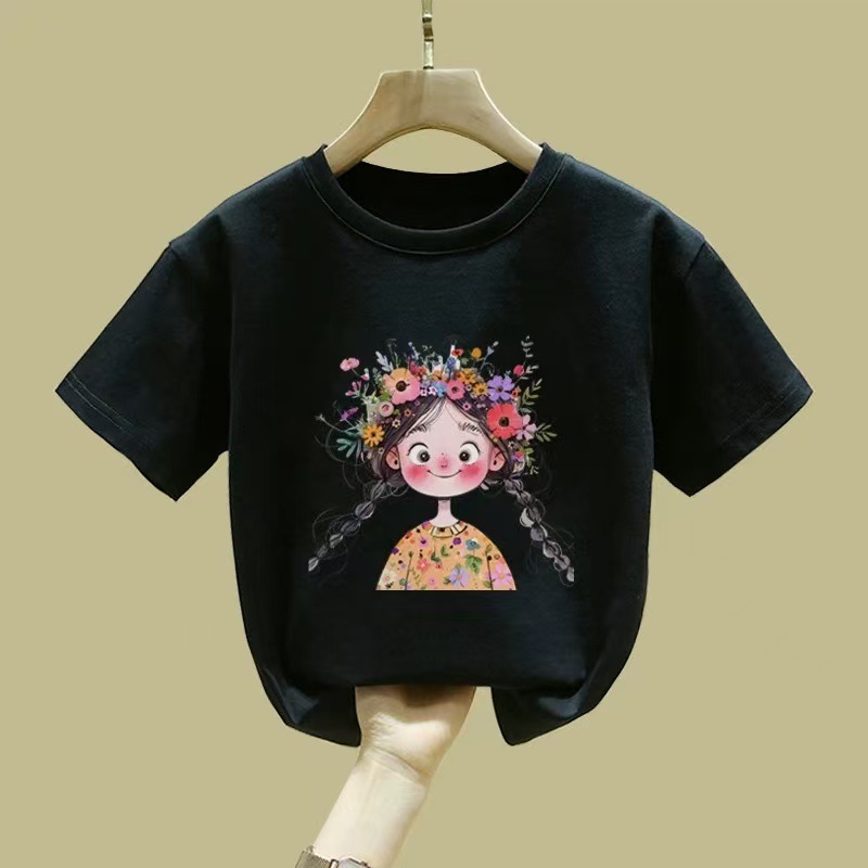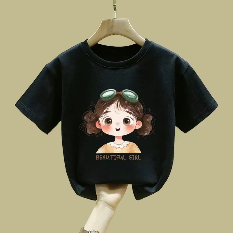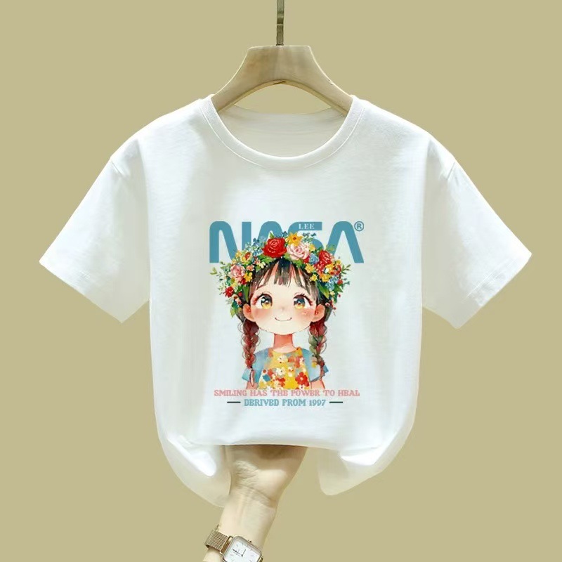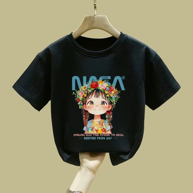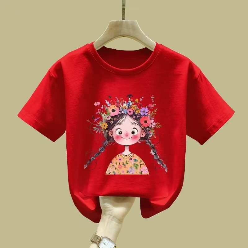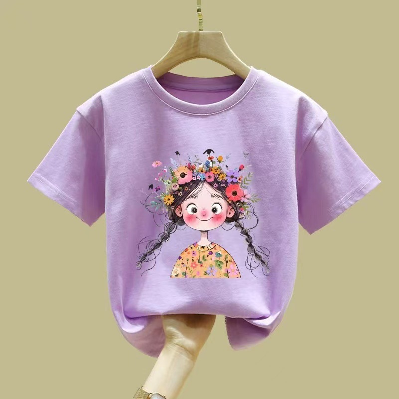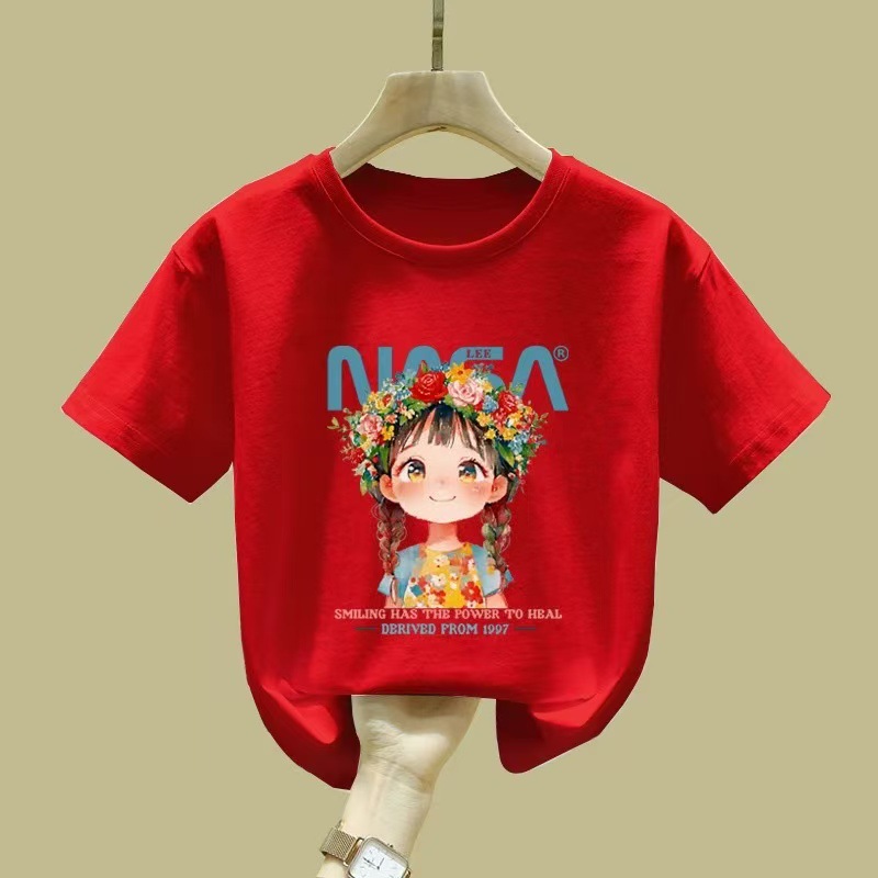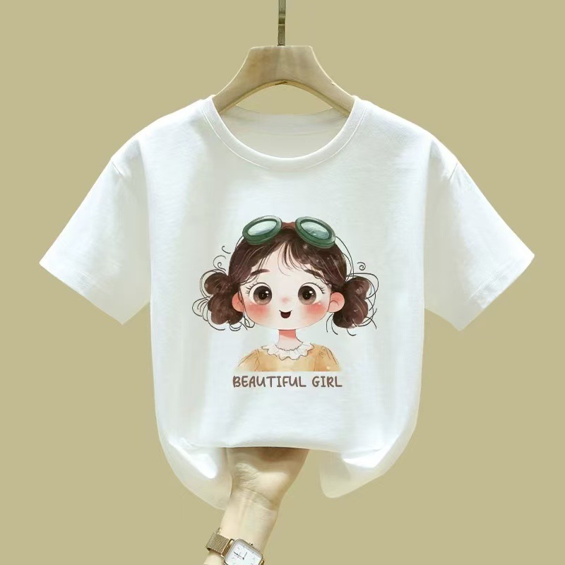 핑크 반소매 걸즈 티셔츠 퓨어 코튼 2025 새로운 중대형 어린이 라운드 넥 반소매 여름 어린이 탑 티셔츠스토어 가기