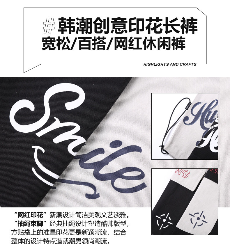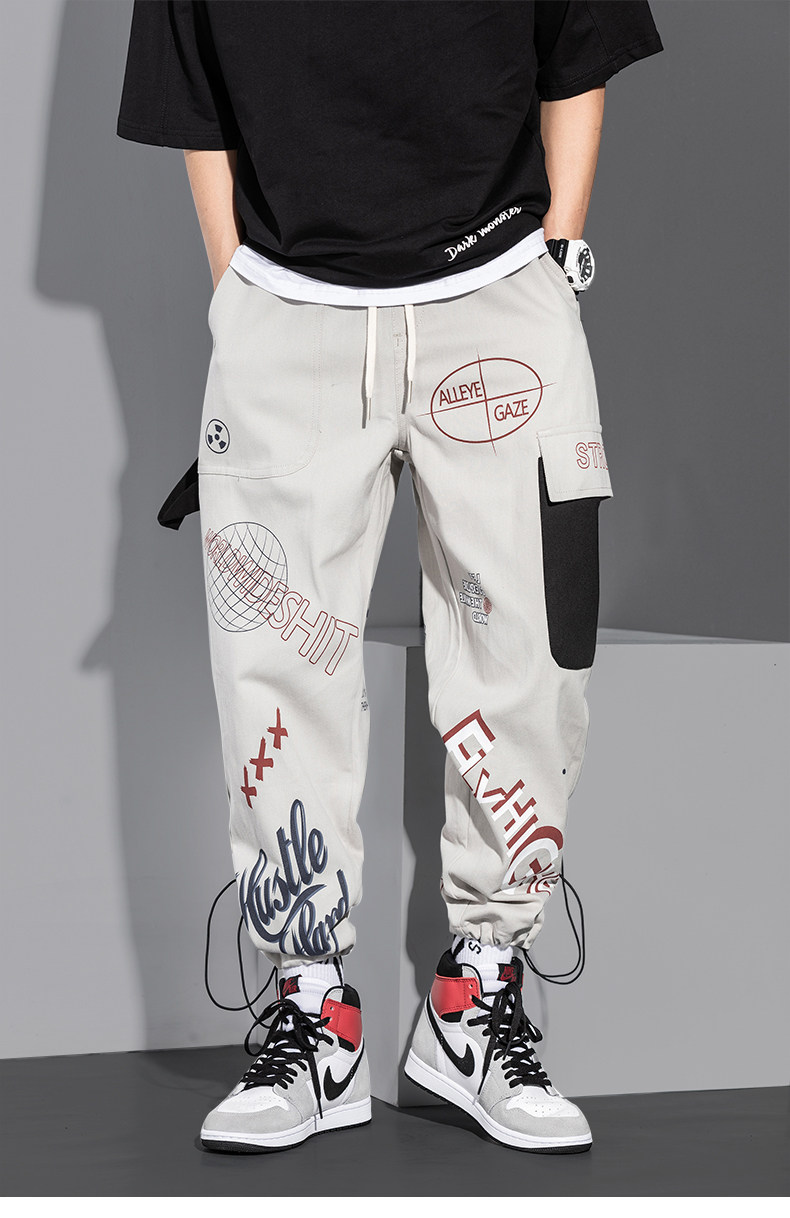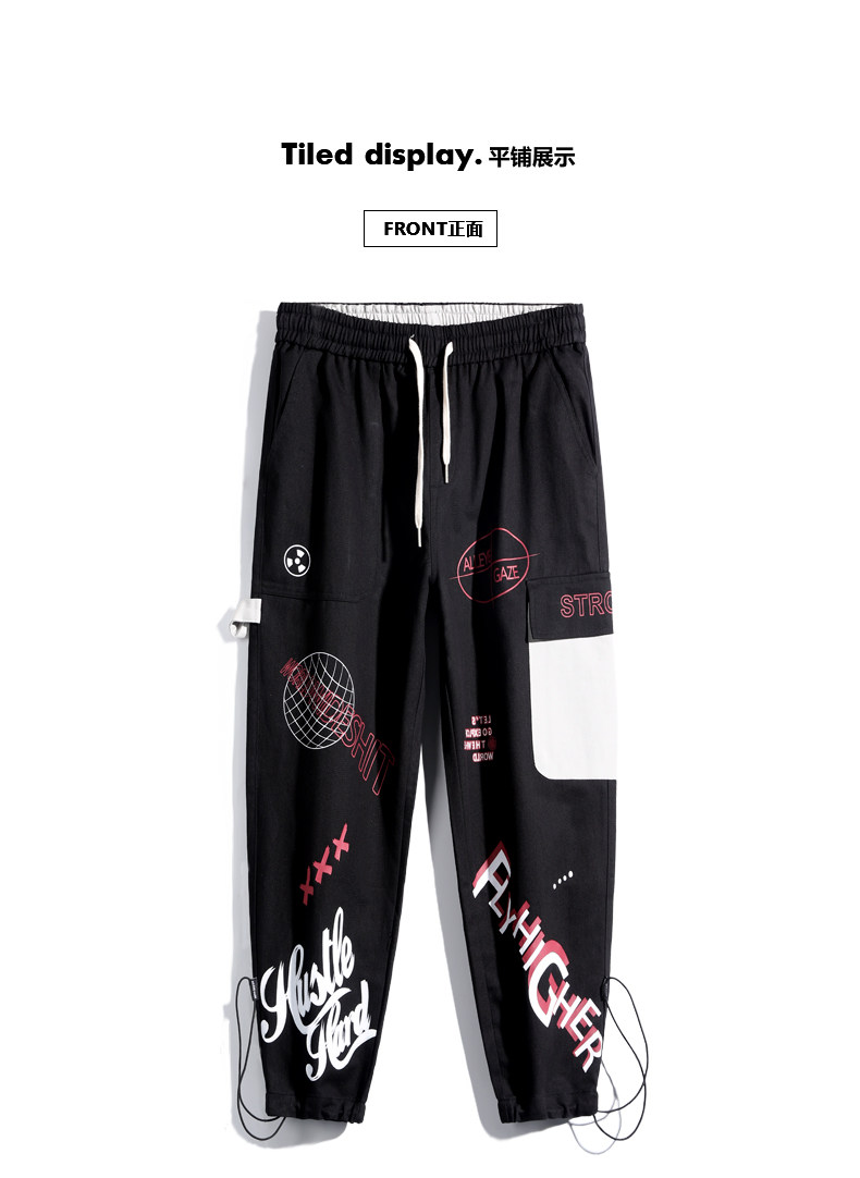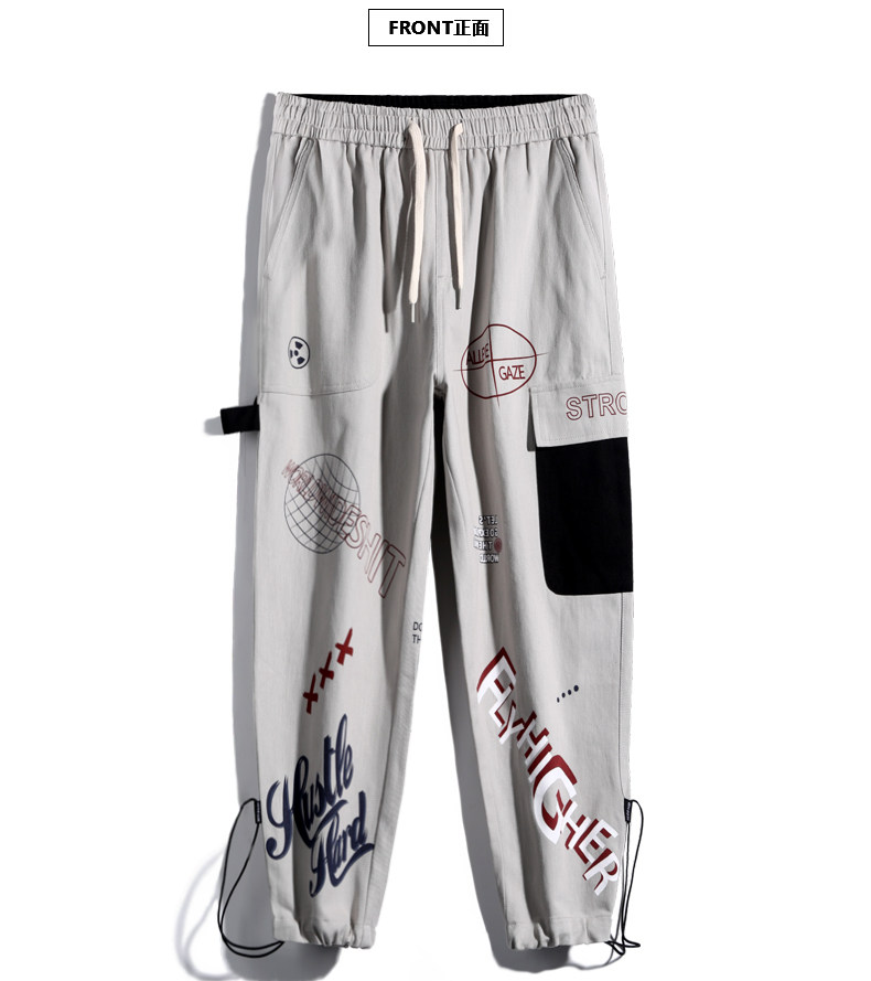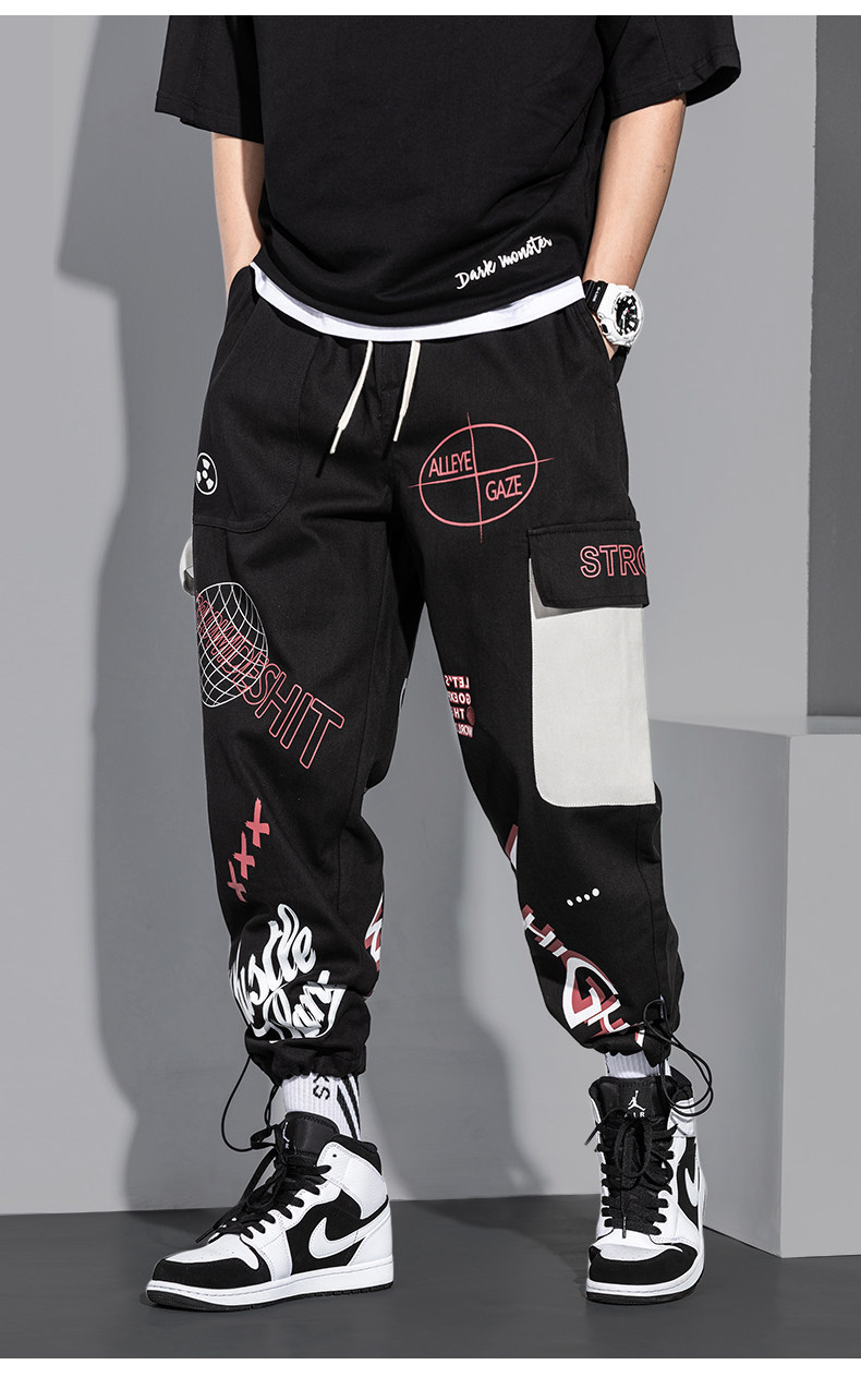 春夏季潮牌卡通字母涂鸦印花工装裤男宽松直筒休闲ins抽绳束脚裤i